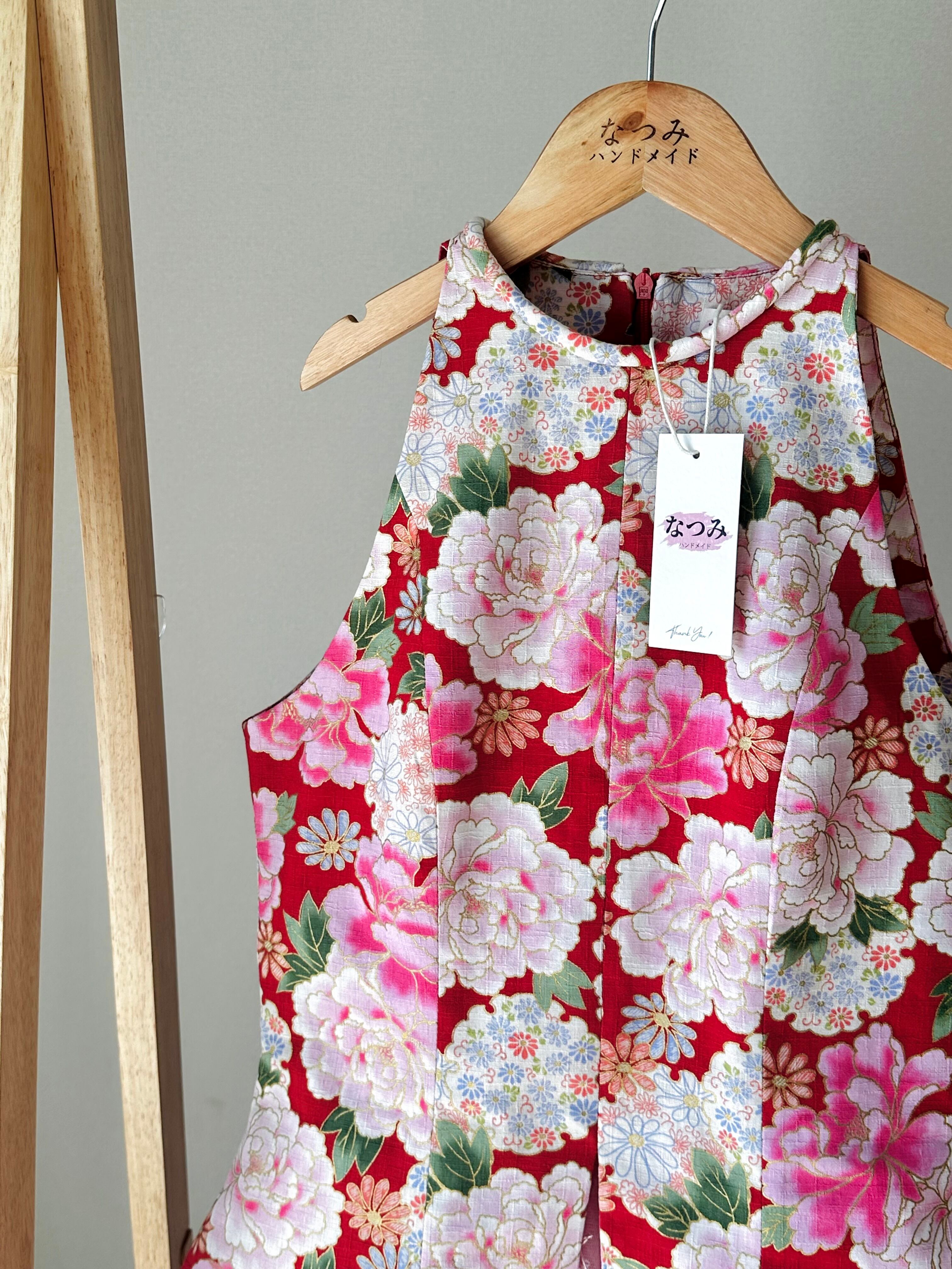 ホルターネックの生地はスラブドビーです。縦横にスラブが入った変わり織り。 シーチングやブロードと同じ平織りの生地ですが少し厚めです。金彩の牡丹柄と雪輪柄です。