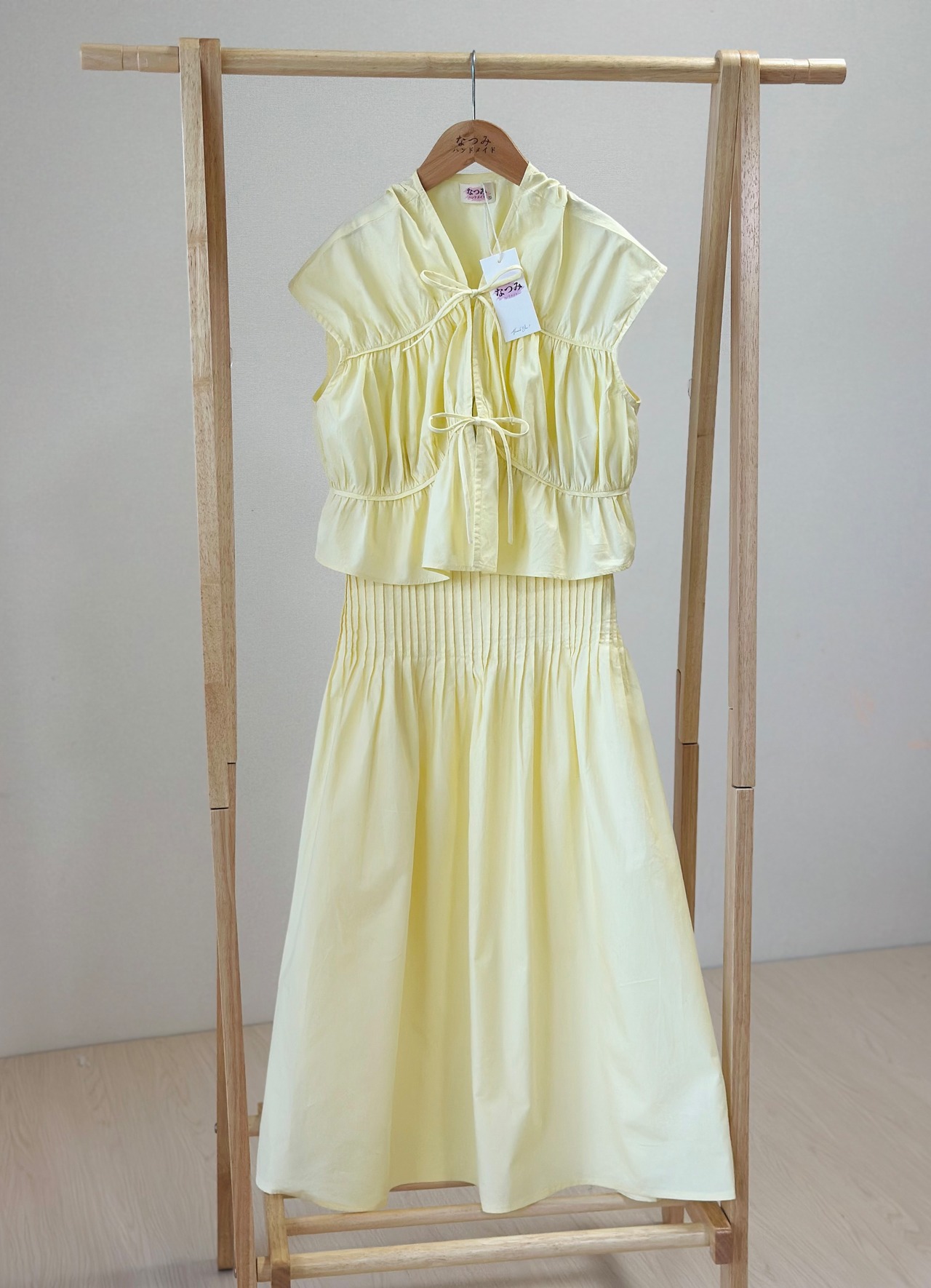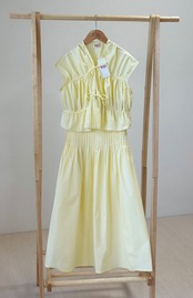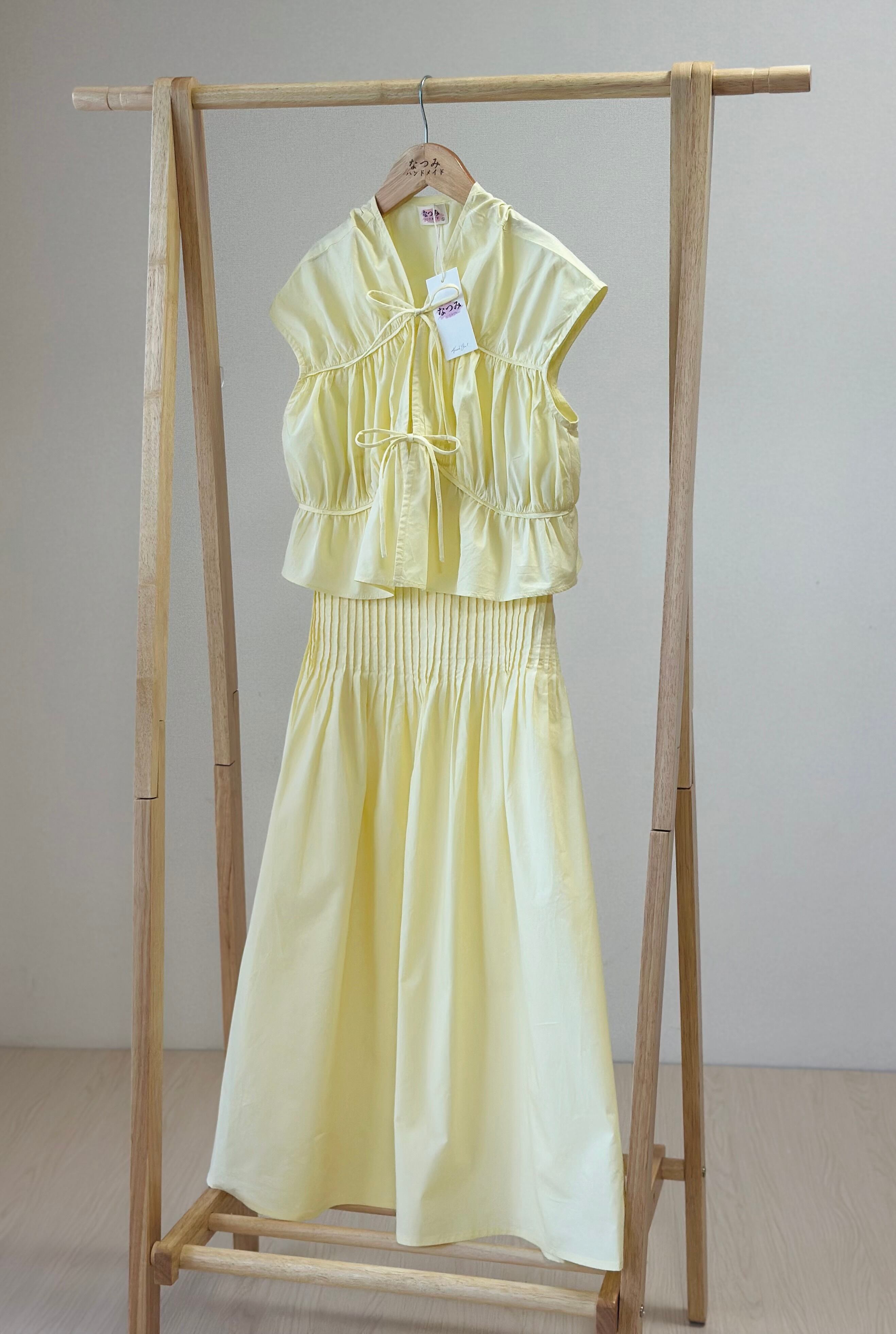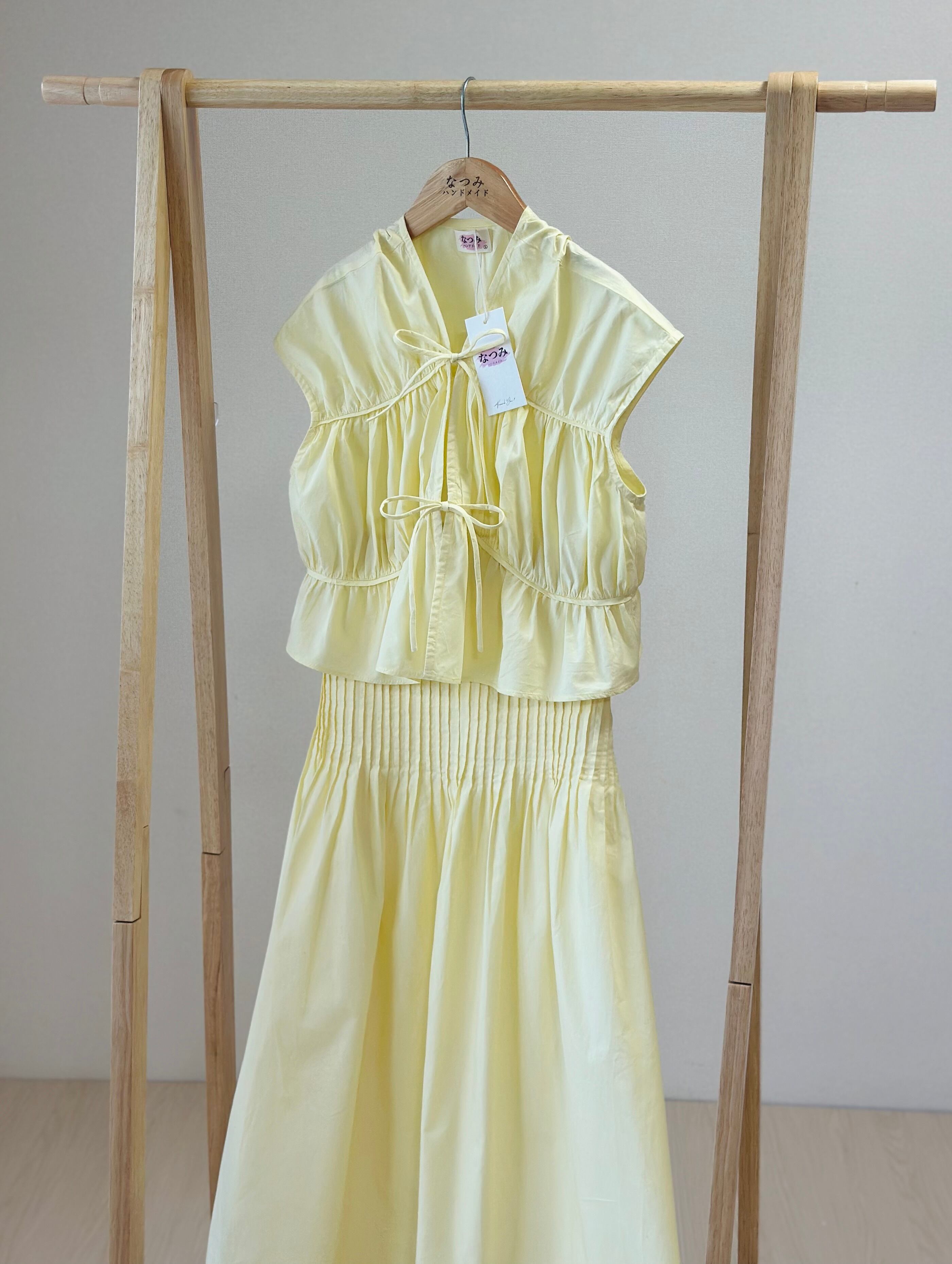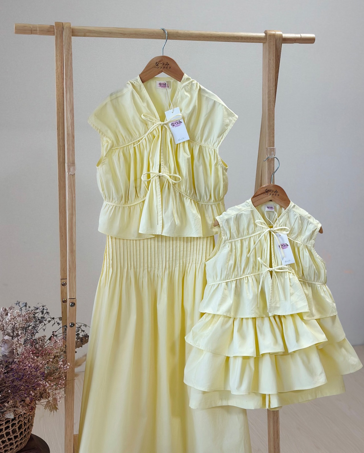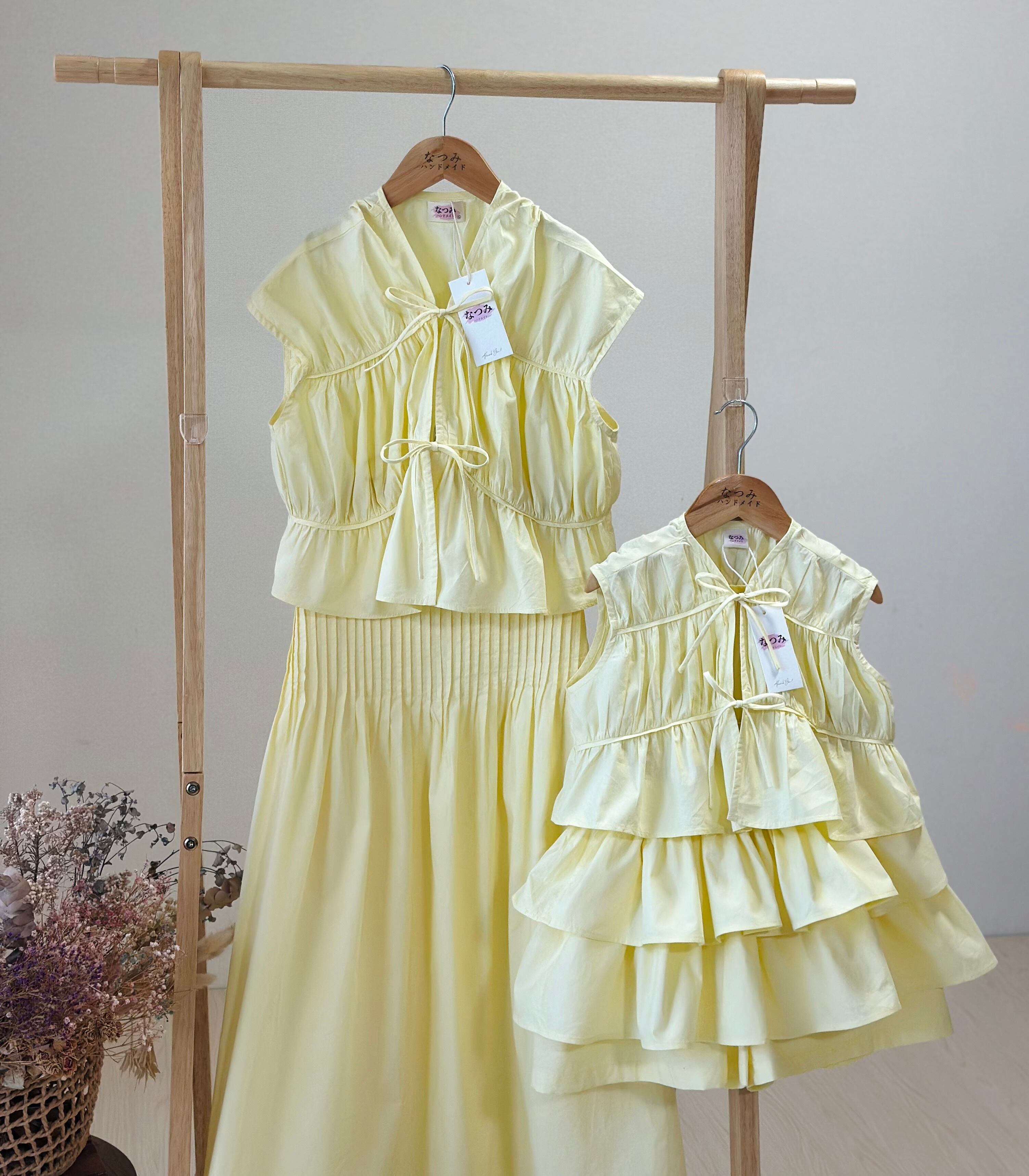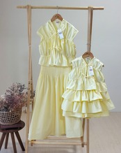 上下セパレートのセットで、ママ用はシンプルで上品な雰囲気、キッズ用はフリルたっぷりのスカートでとってもキュート