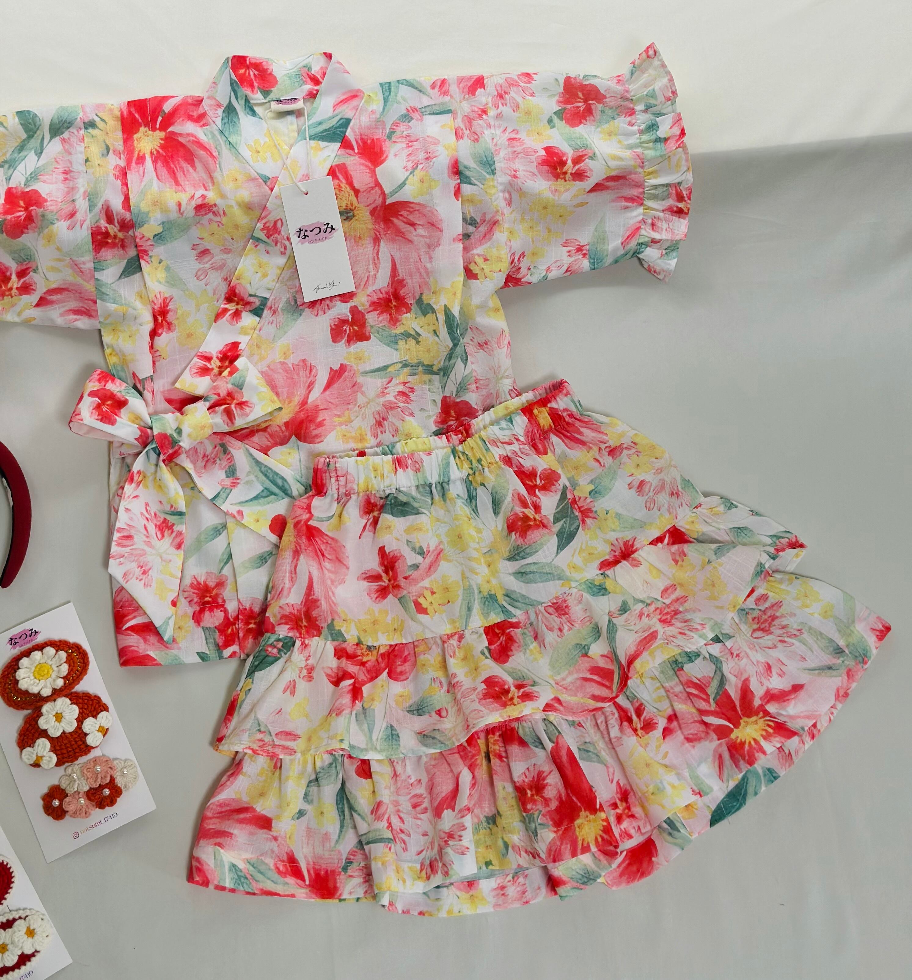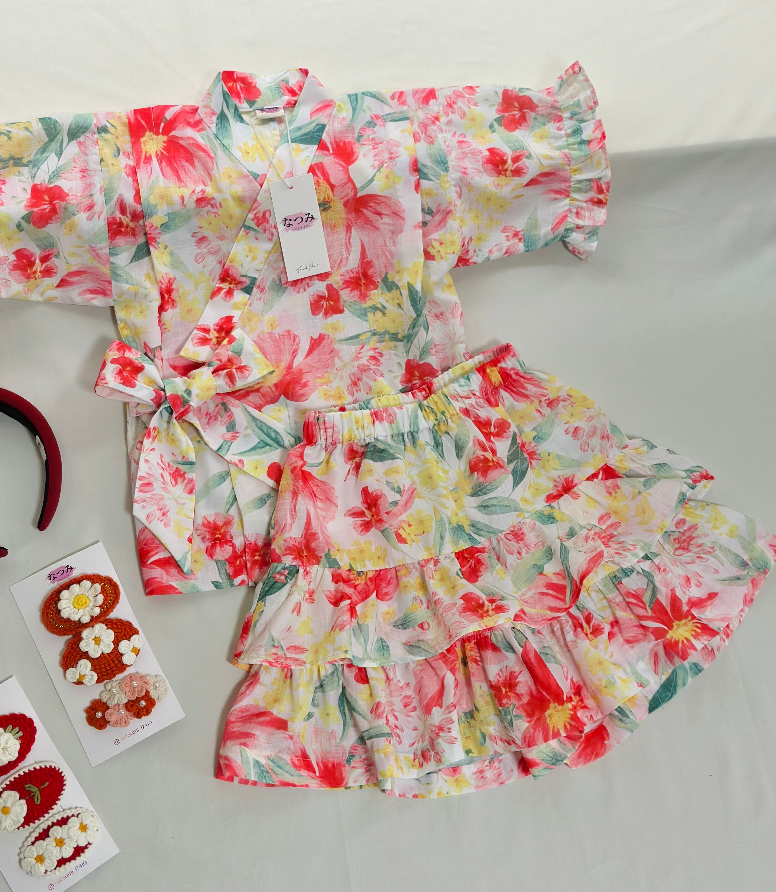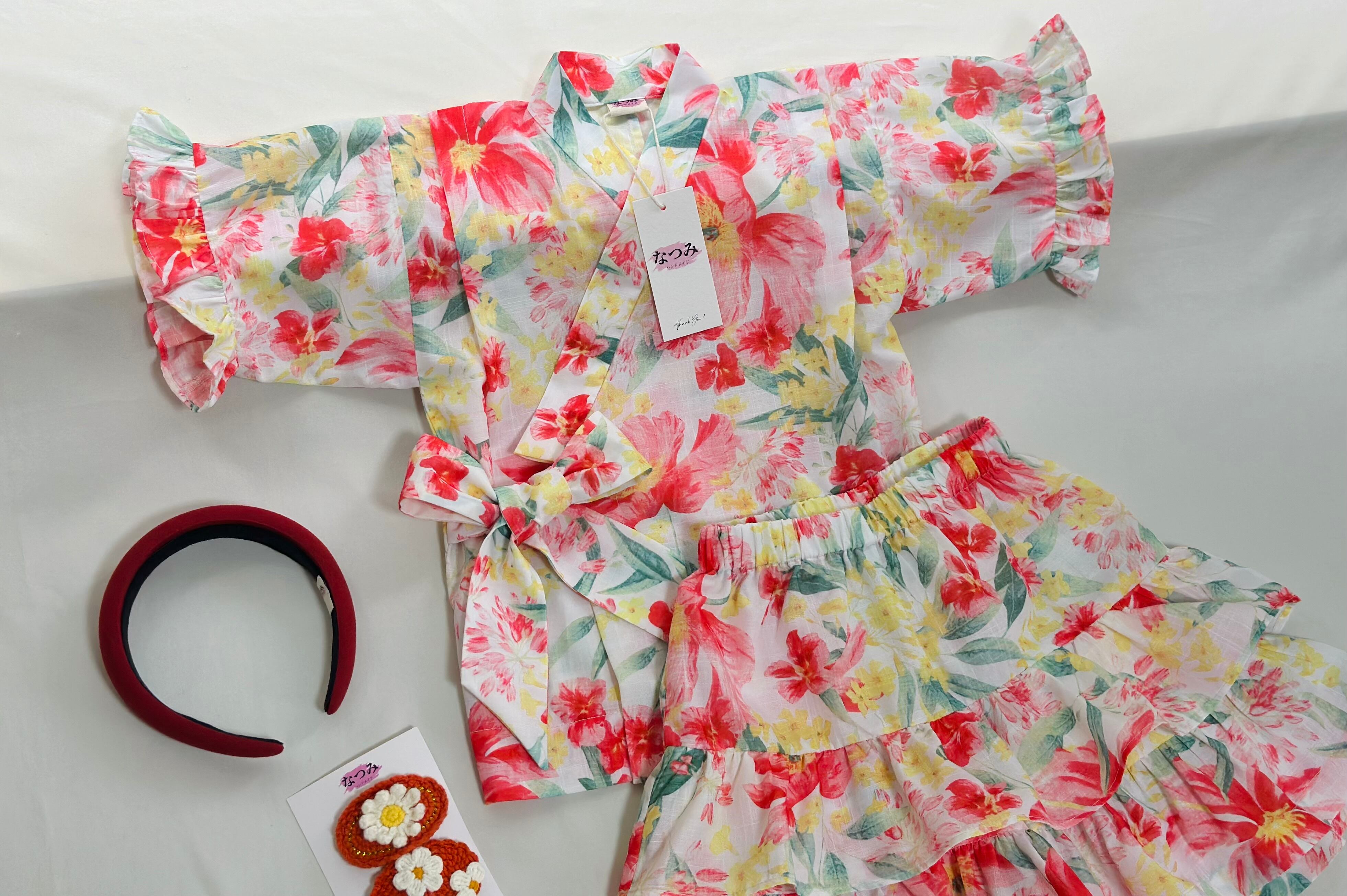 伝統的なじんべいにフリル&スカート風のアレンジを加えた、女の子専用のオシャレな一着。