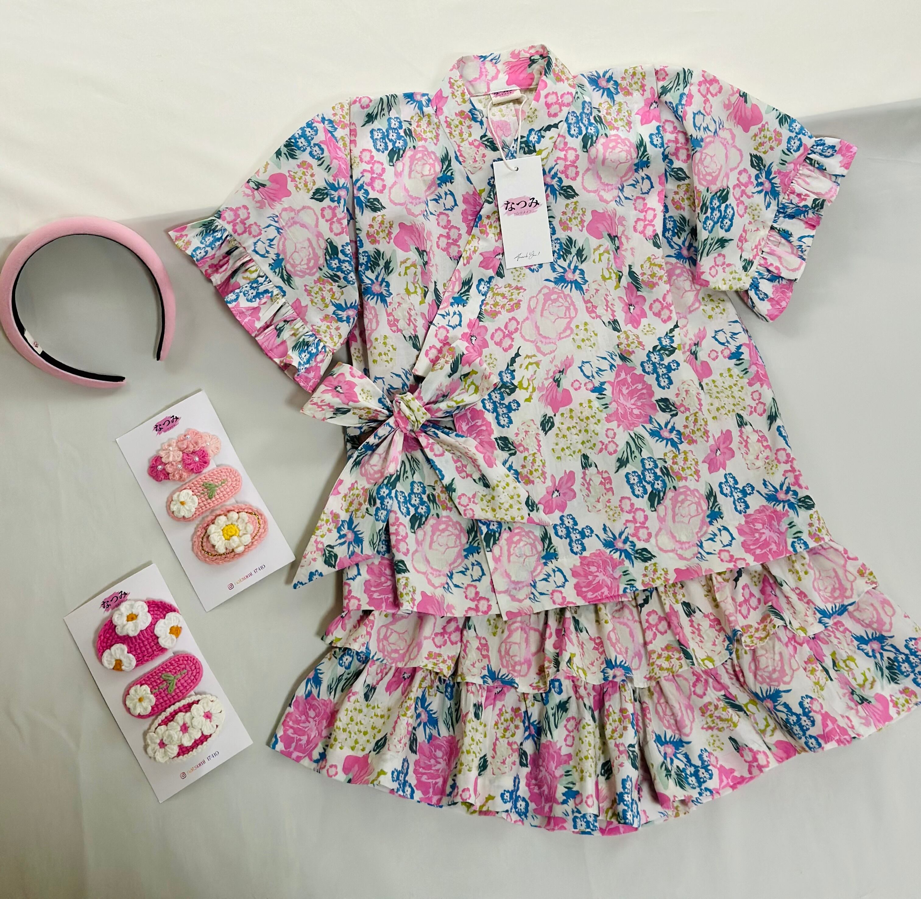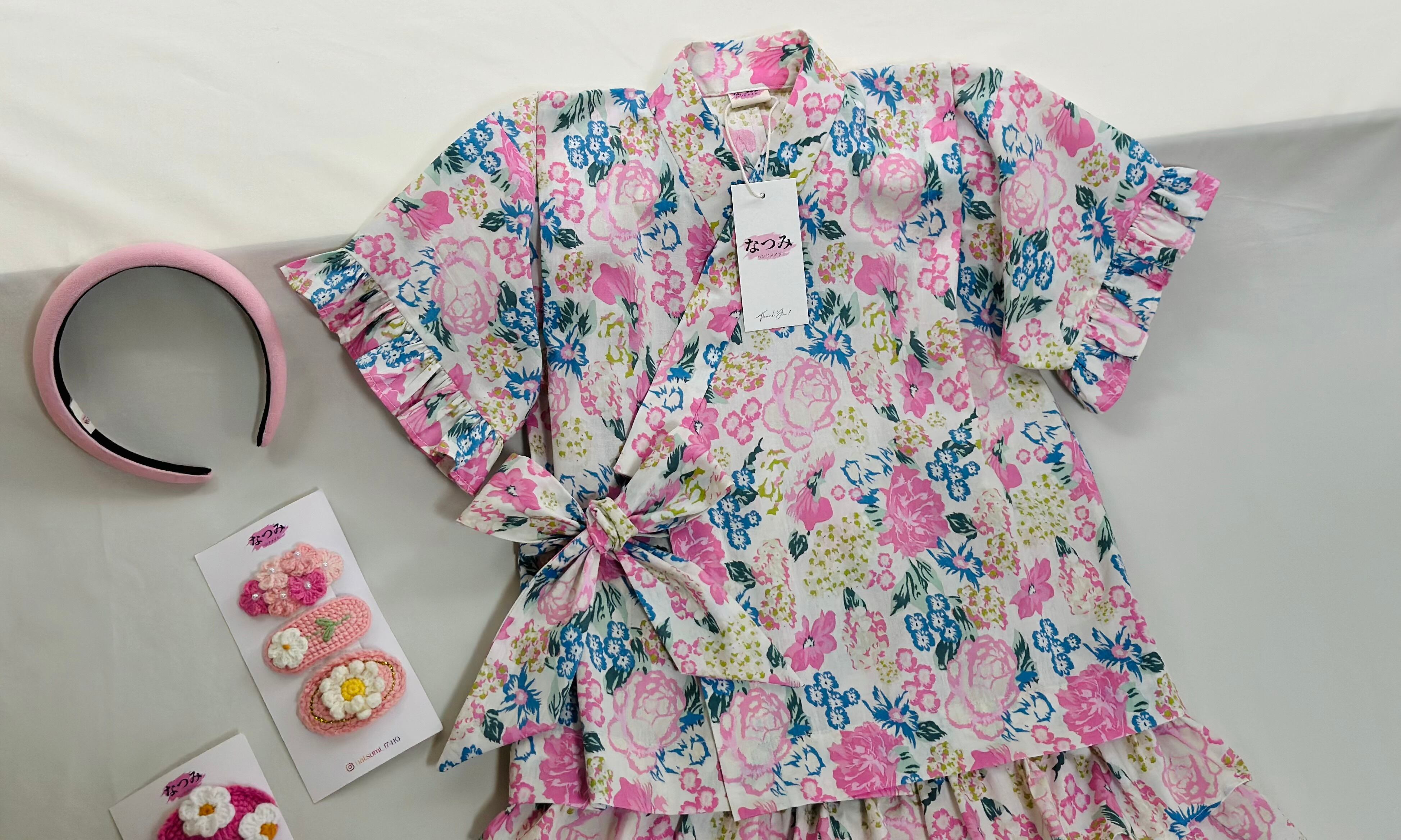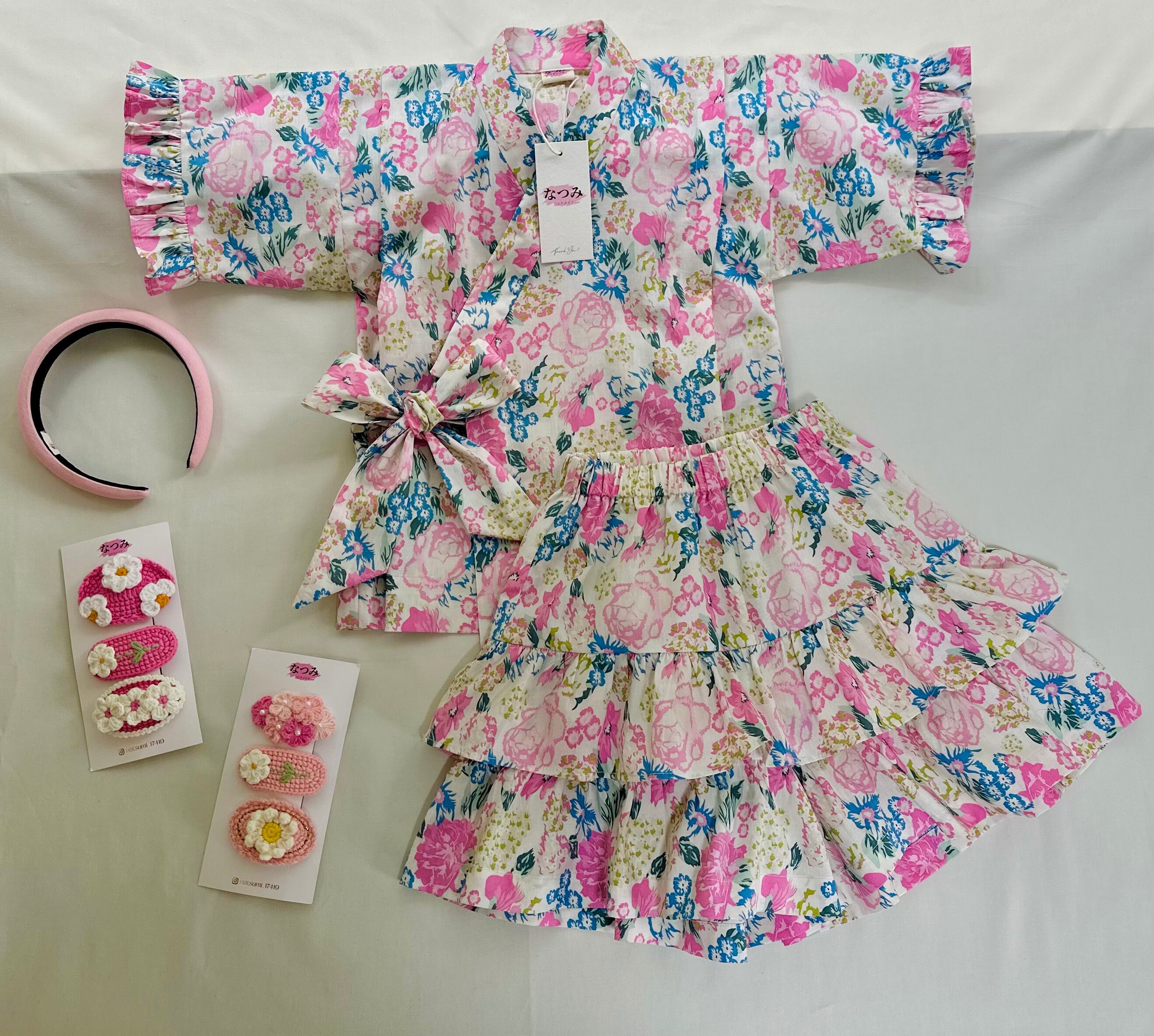 伝統的なじんべいにフリル&スカート風のアレンジを加えた、女の子専用のオシャレな一着。