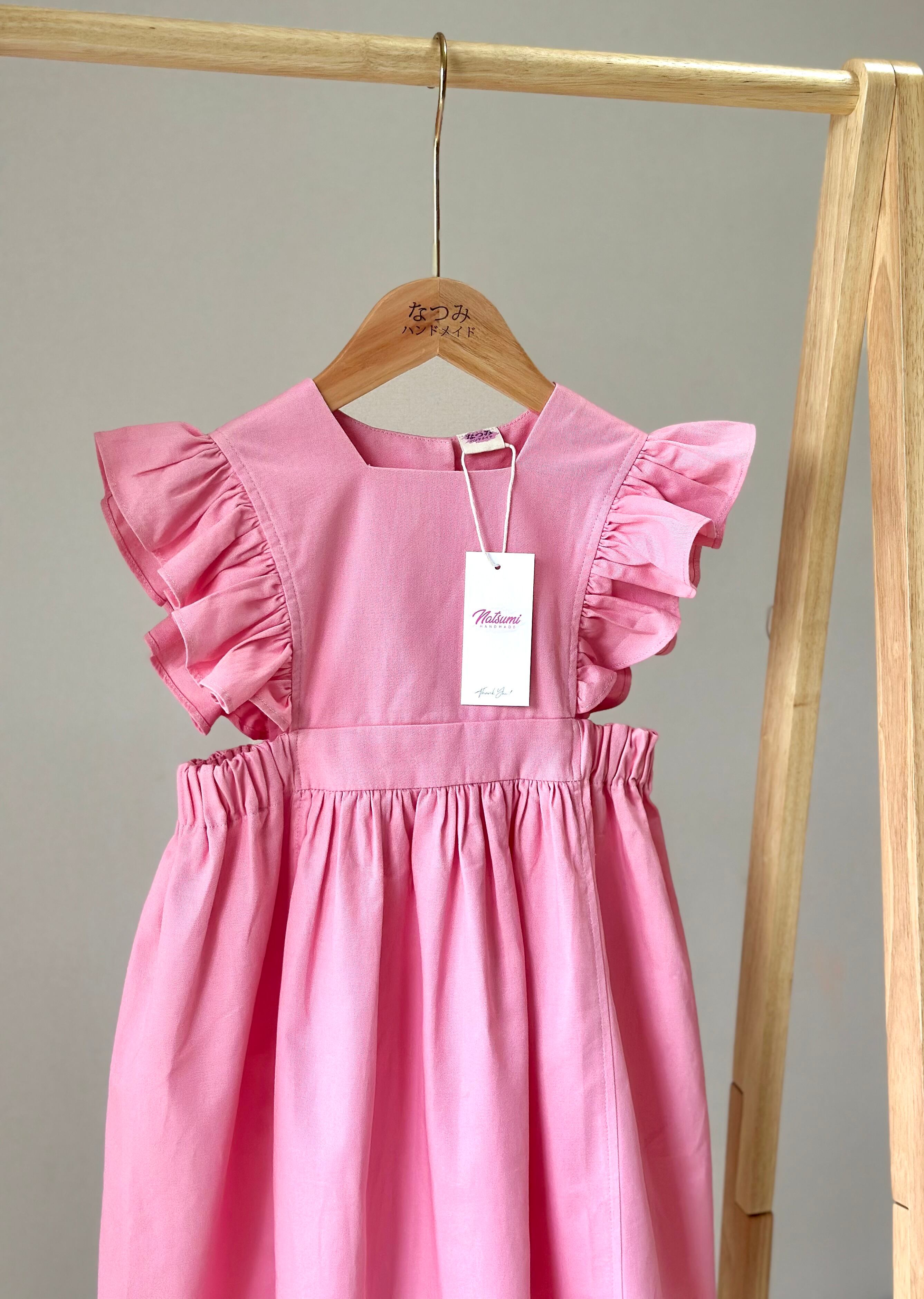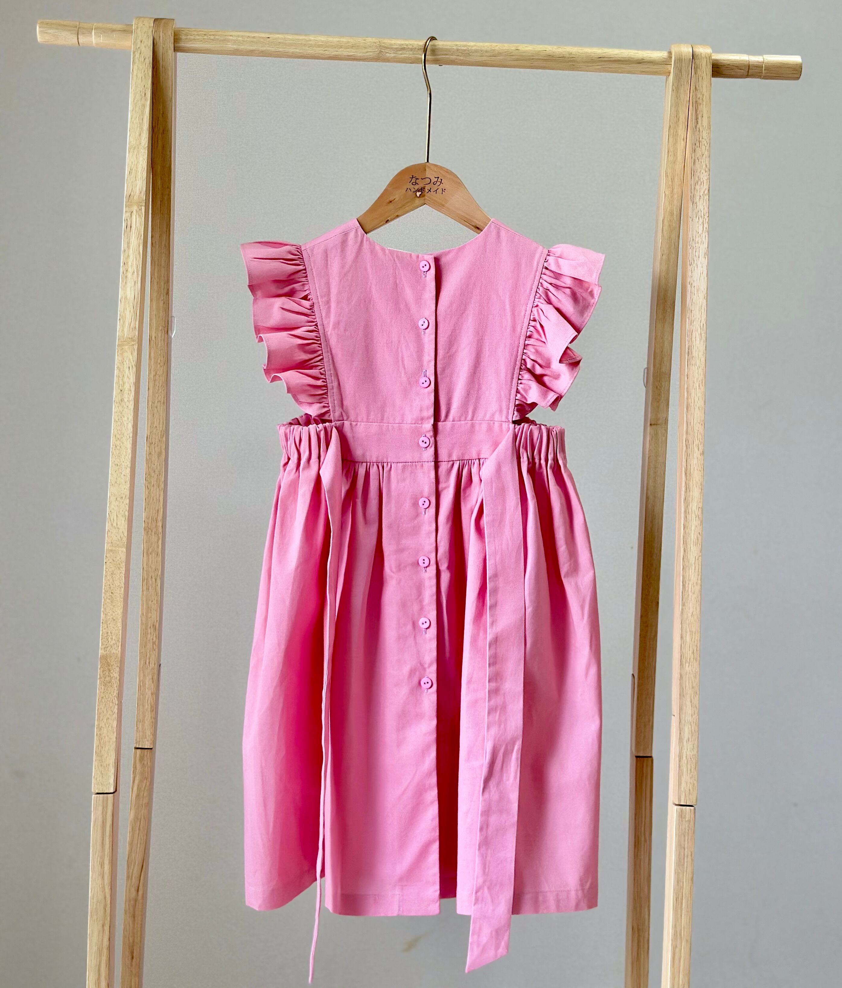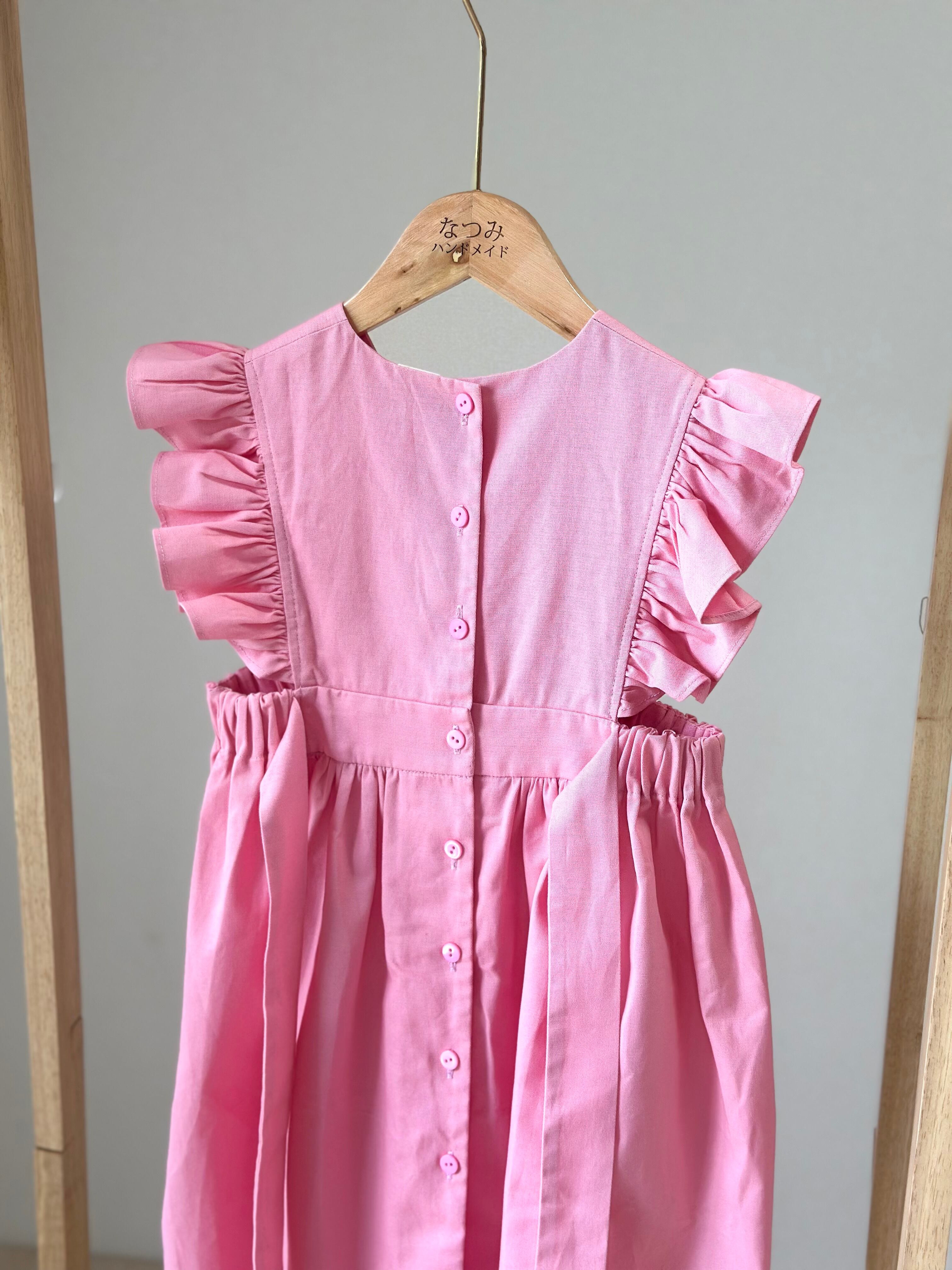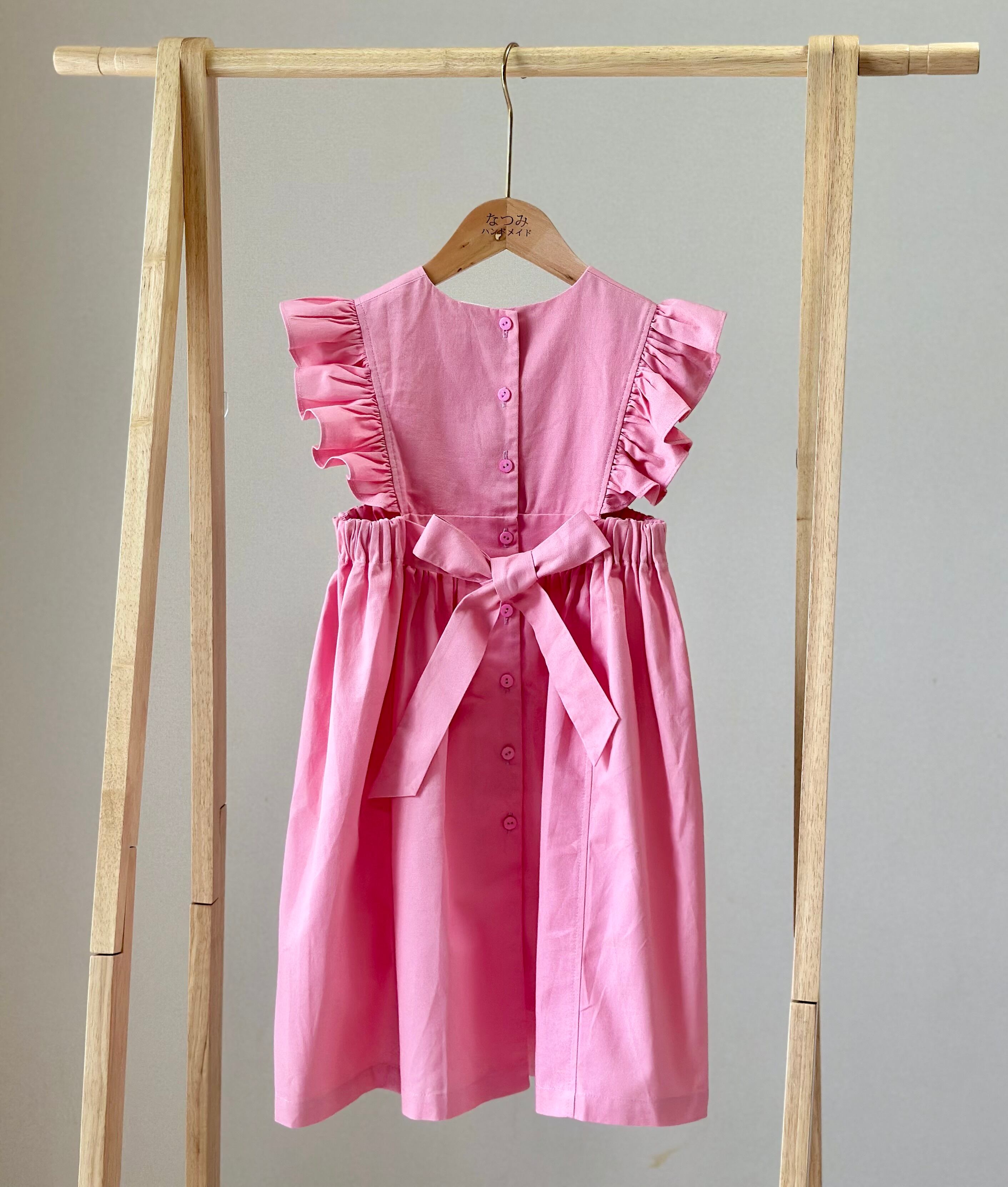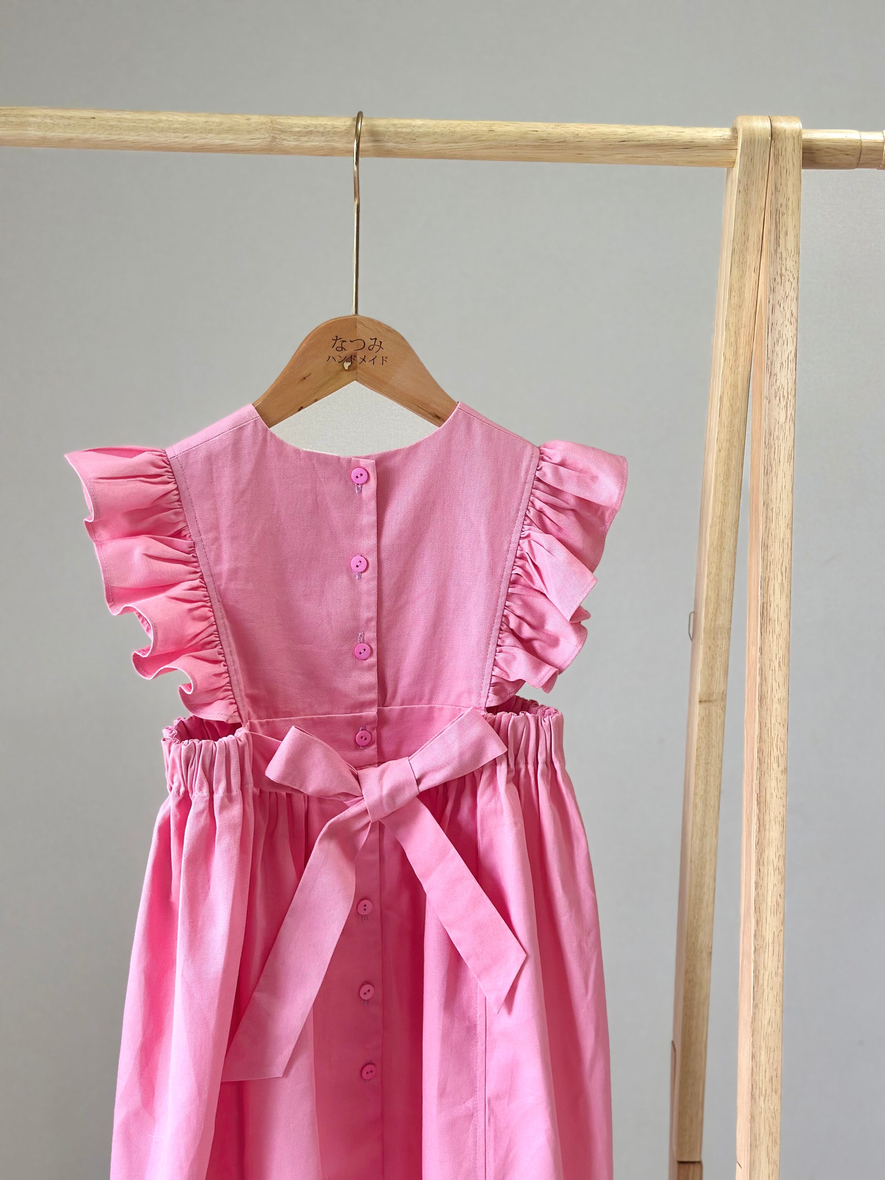 No.H2543 ハンドメイドピンクカジュアルワンピース 肩フリル&後ろリボン