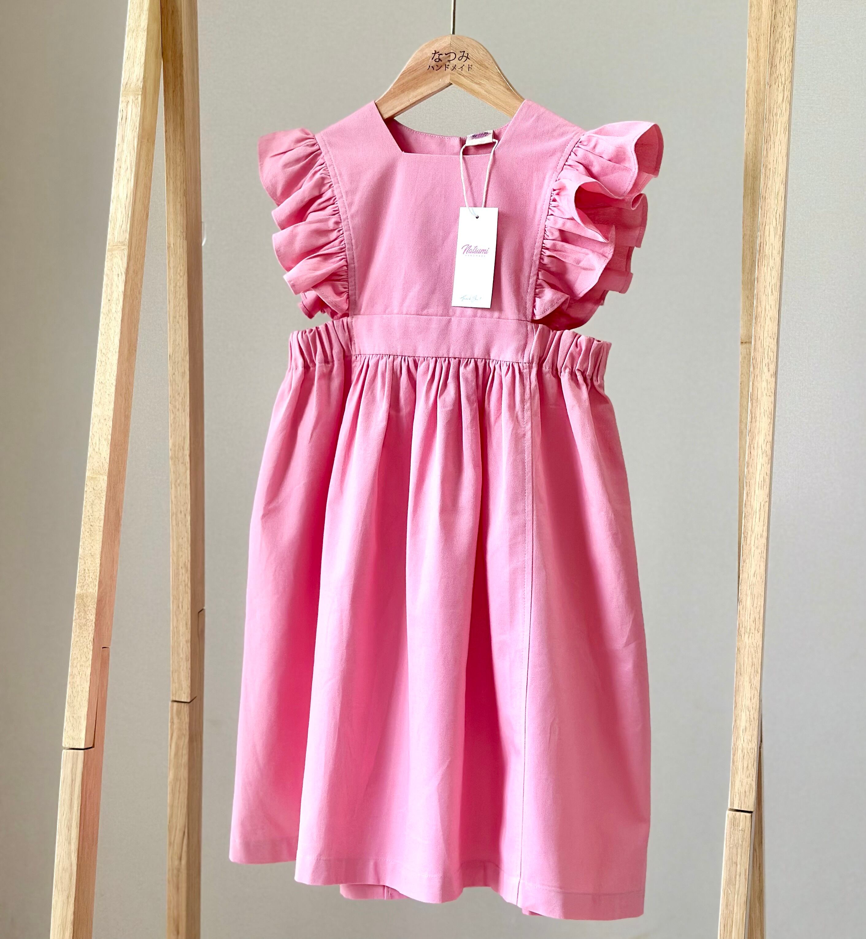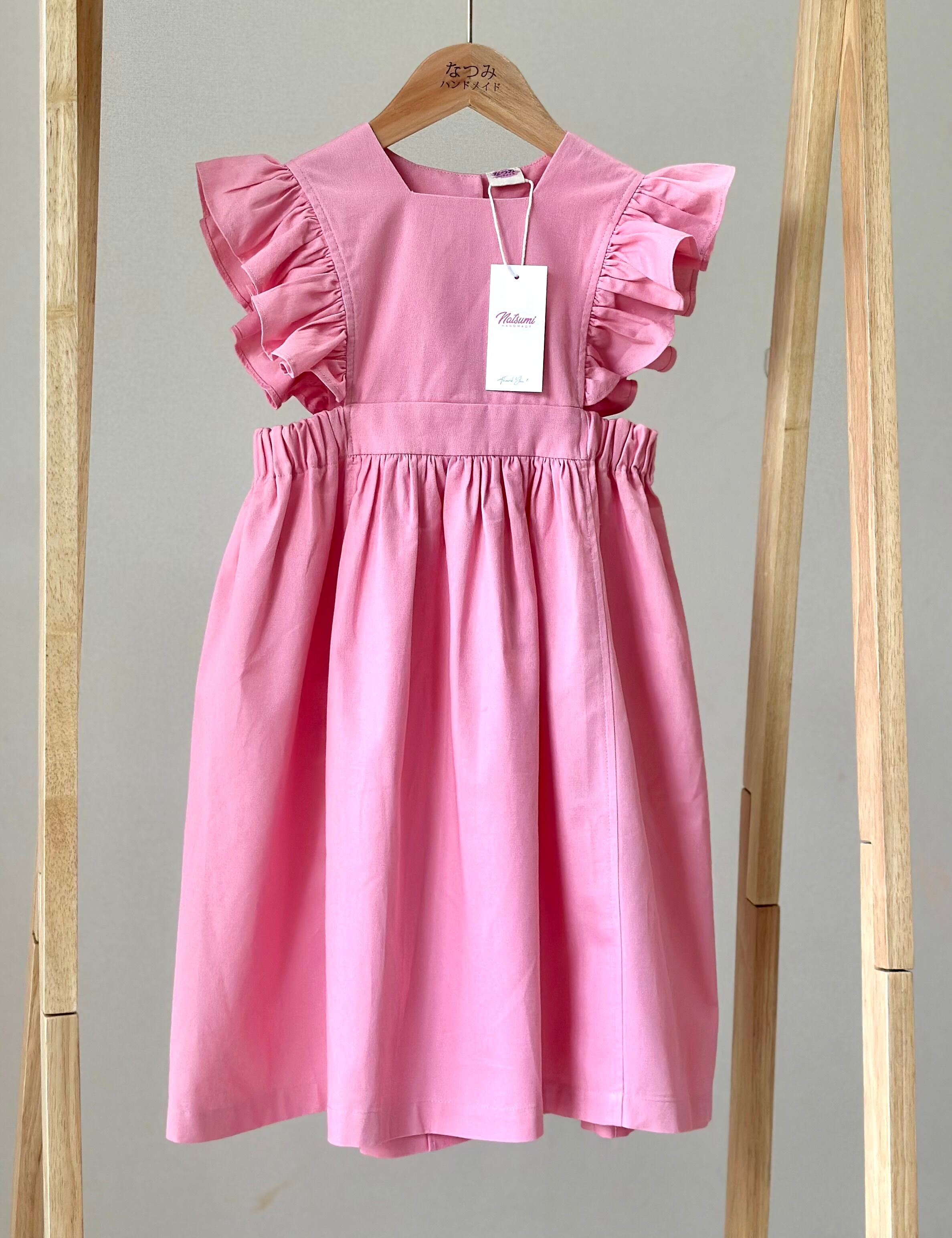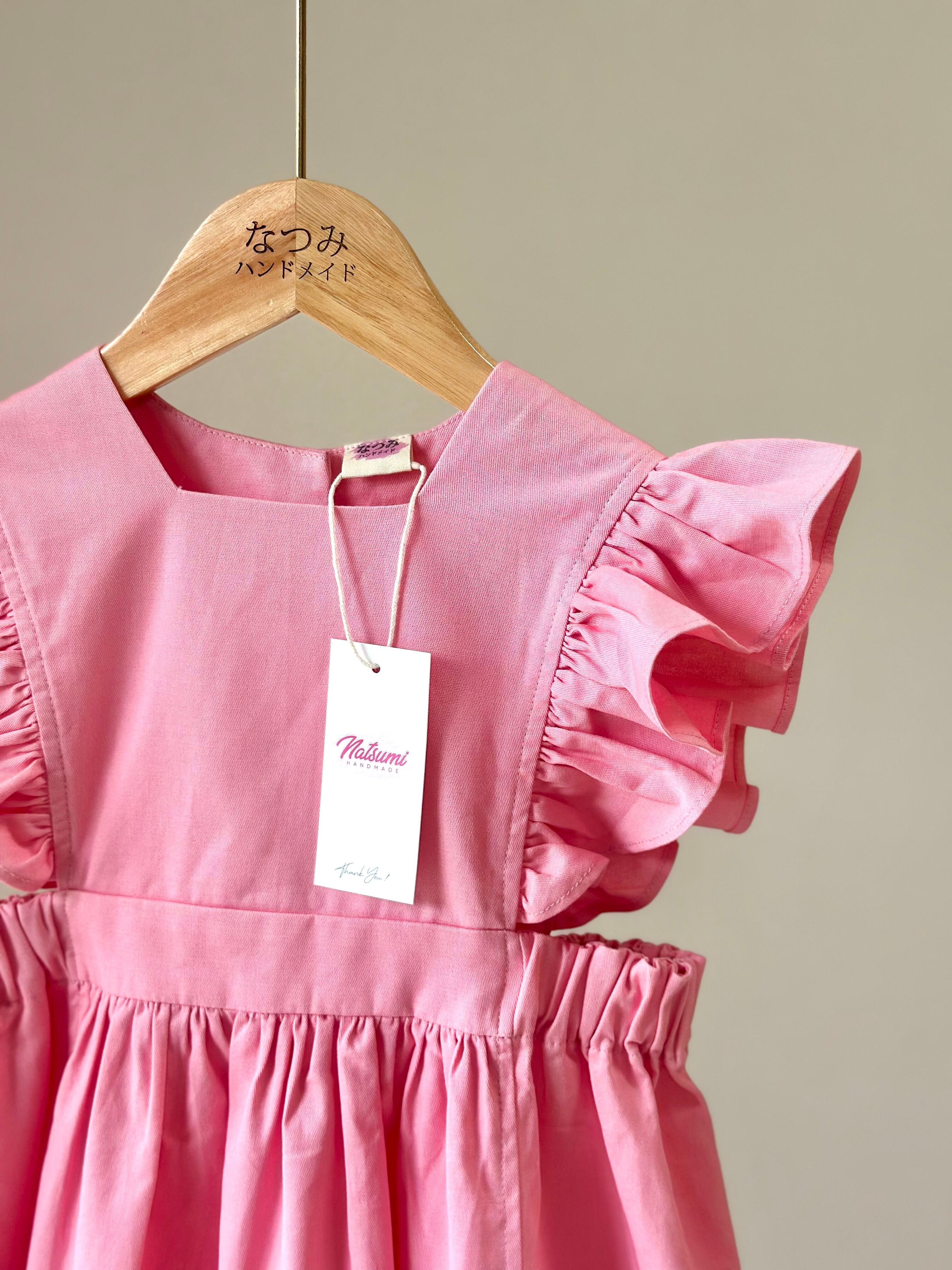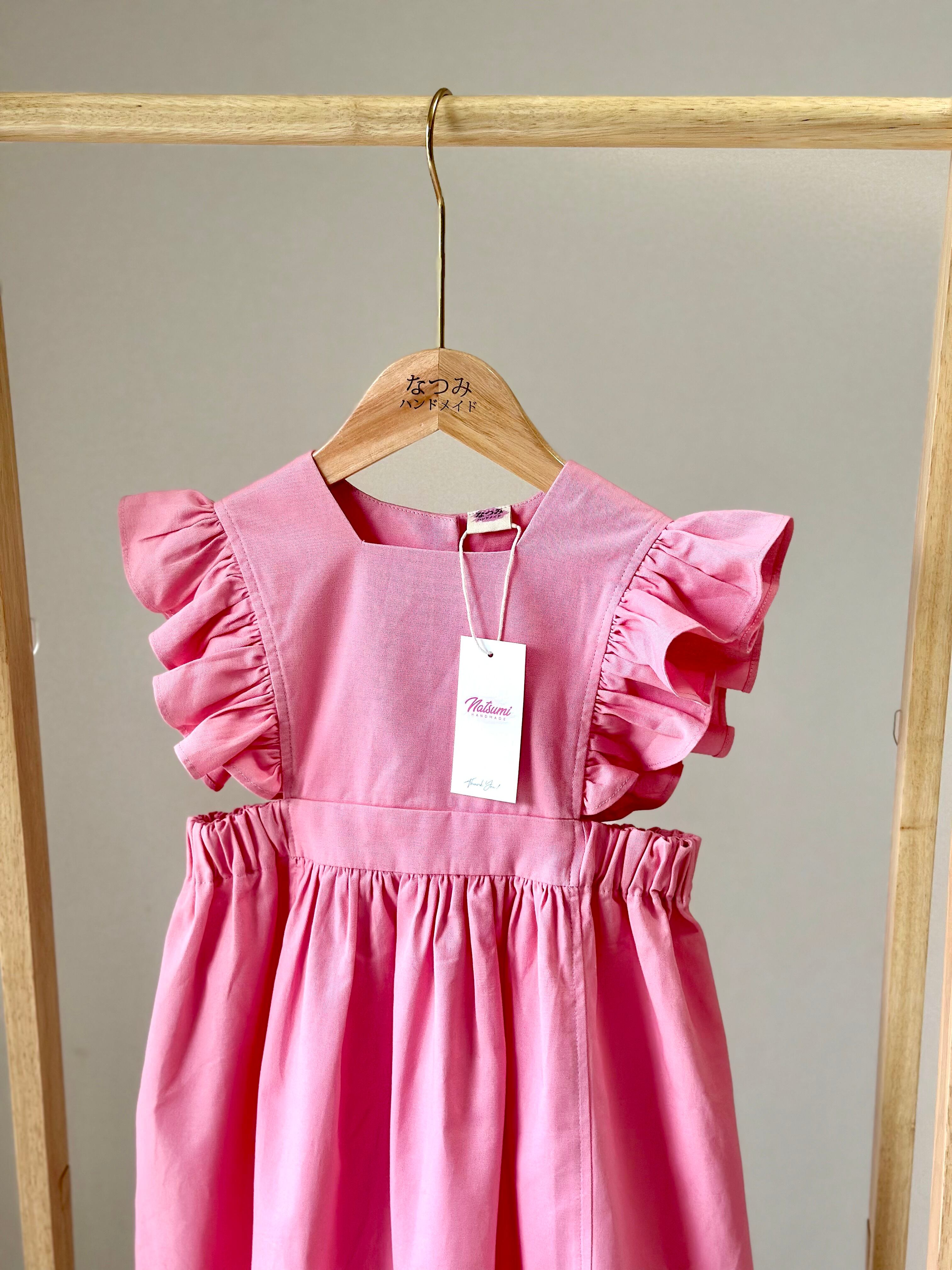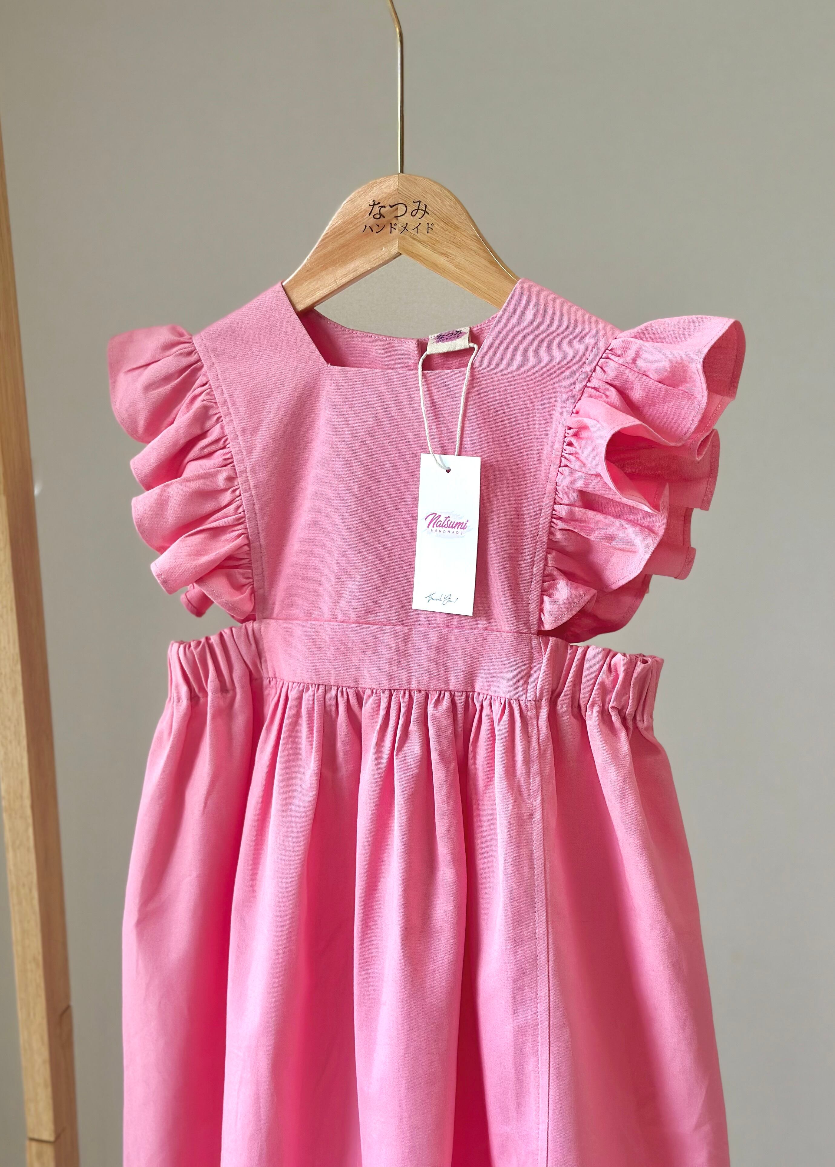 No.H2543 ハンドメイドピンクカジュアルワンピース 肩フリル&後ろリボン