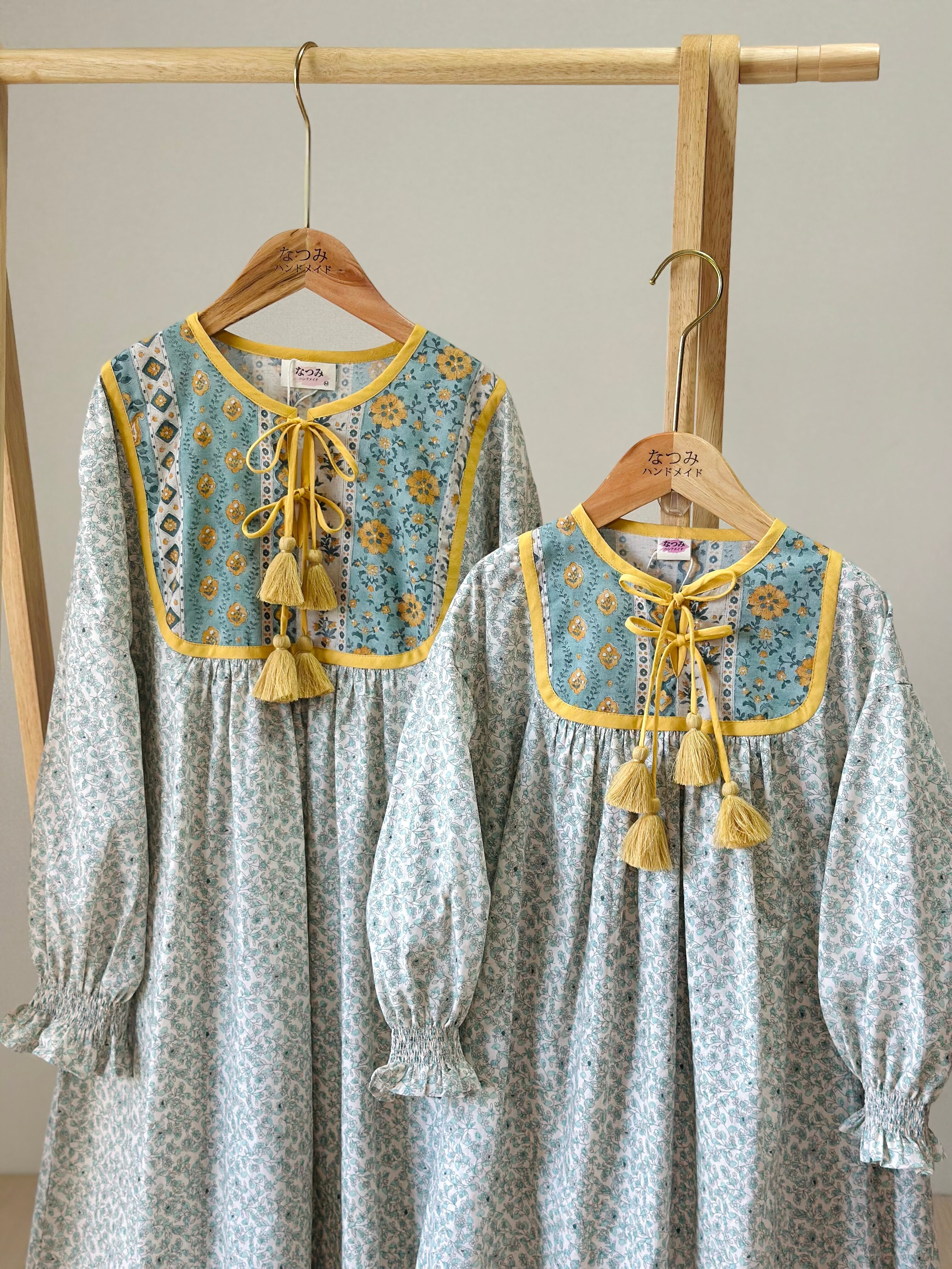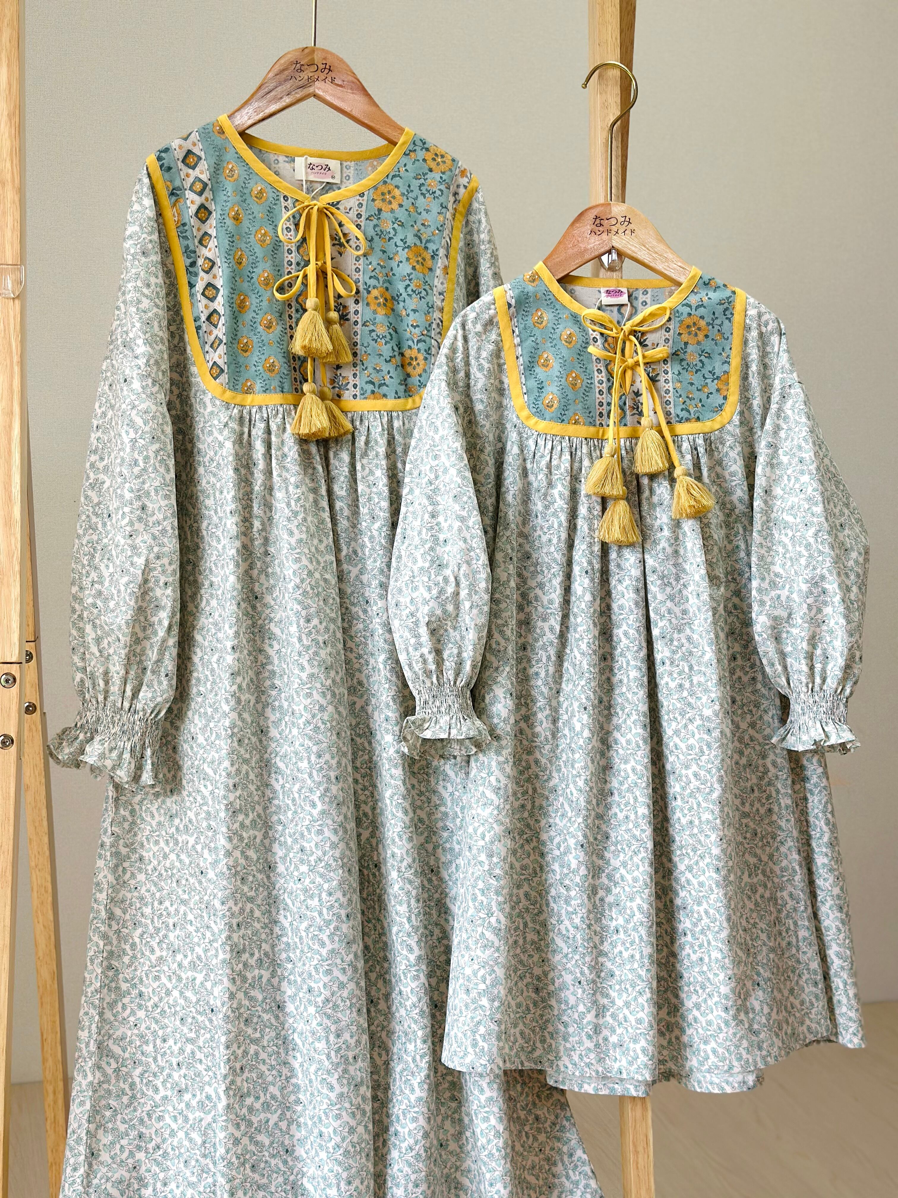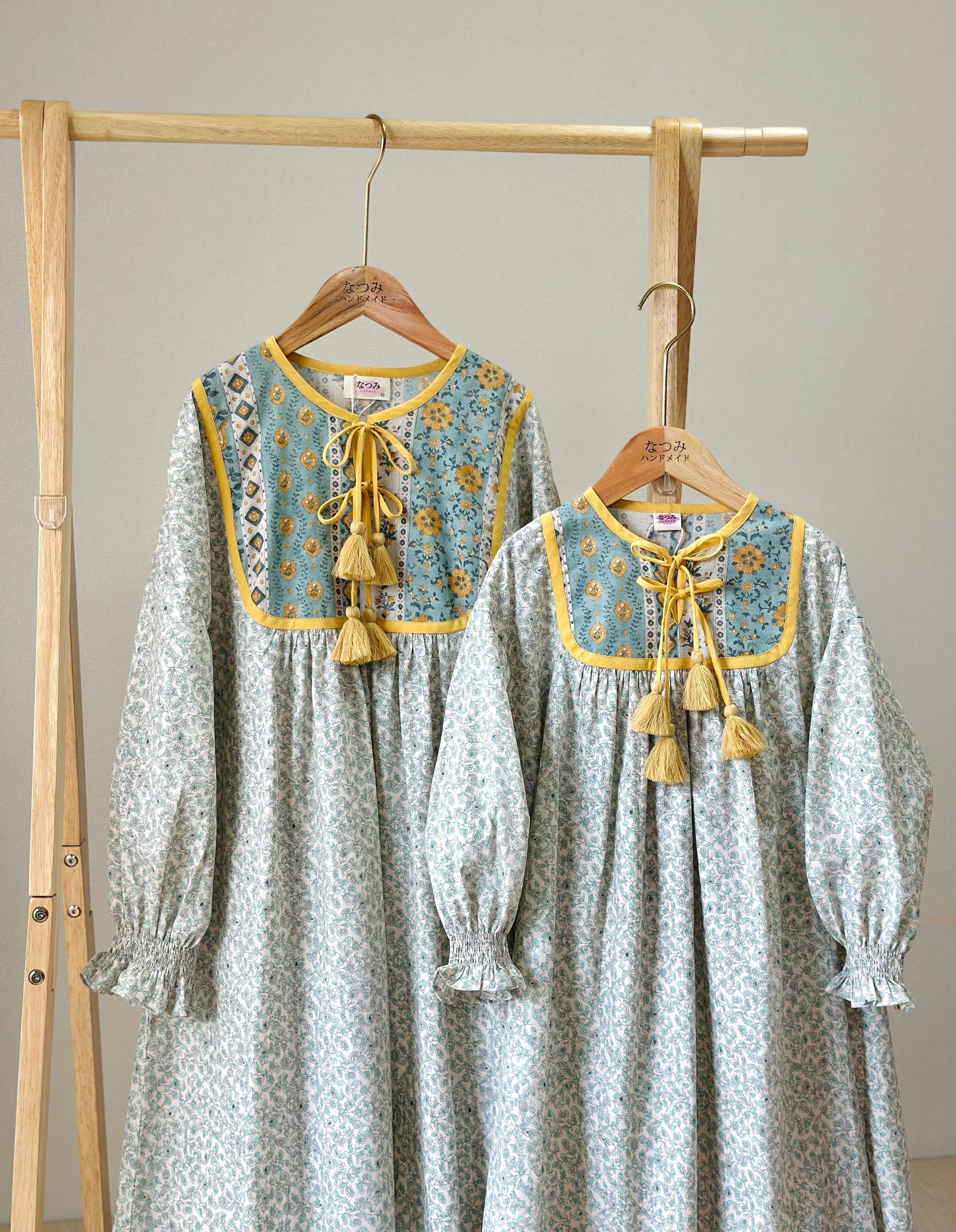 【デザイン】胸元にブルーフラワー柄の生地を合わせ、ハンドメイドのタッセルがアクセント。ゆったりロング丈&可愛いシャーリング袖で、ヴィンテージ感とモダンさを兼ね備えた1枚