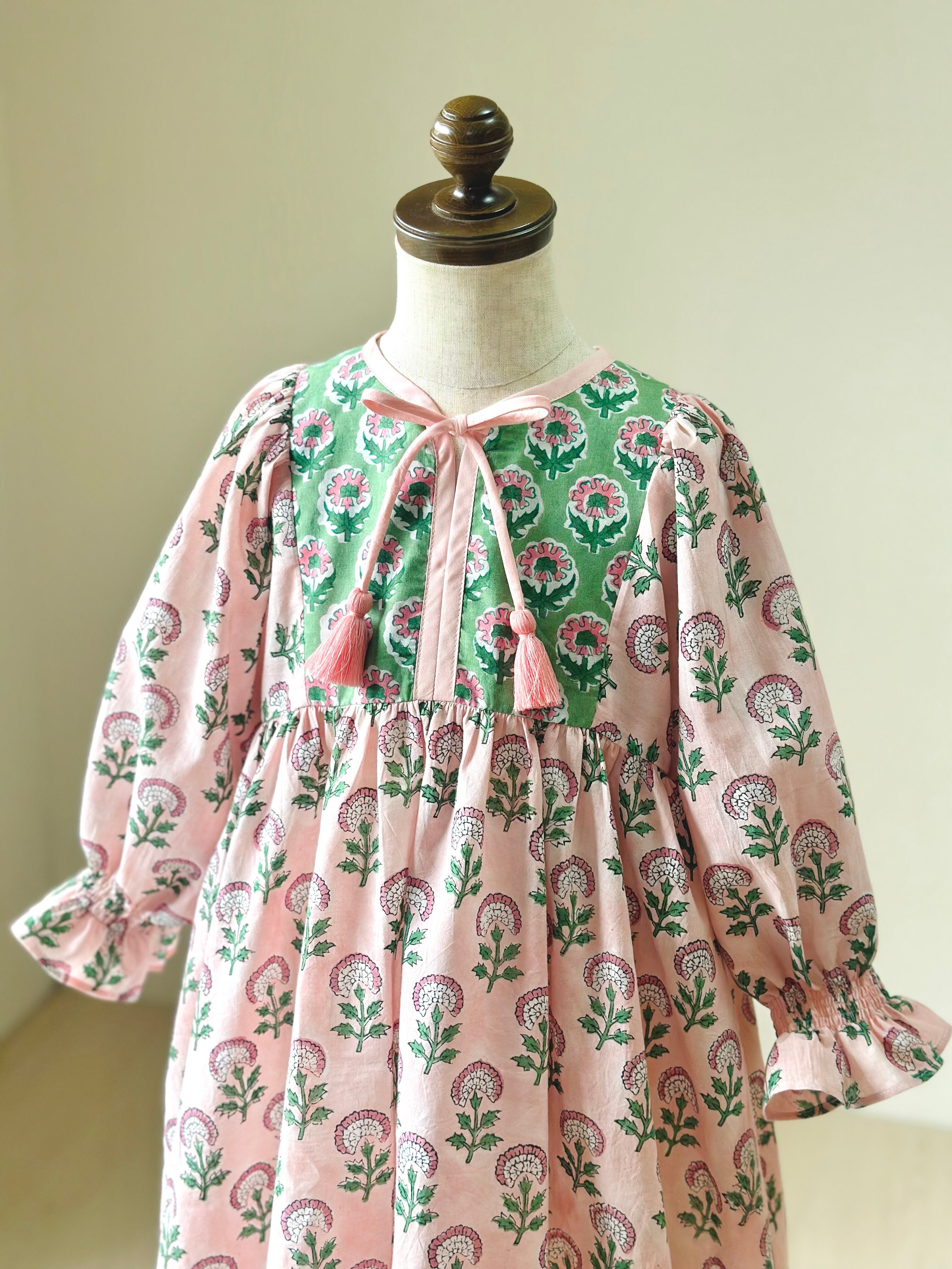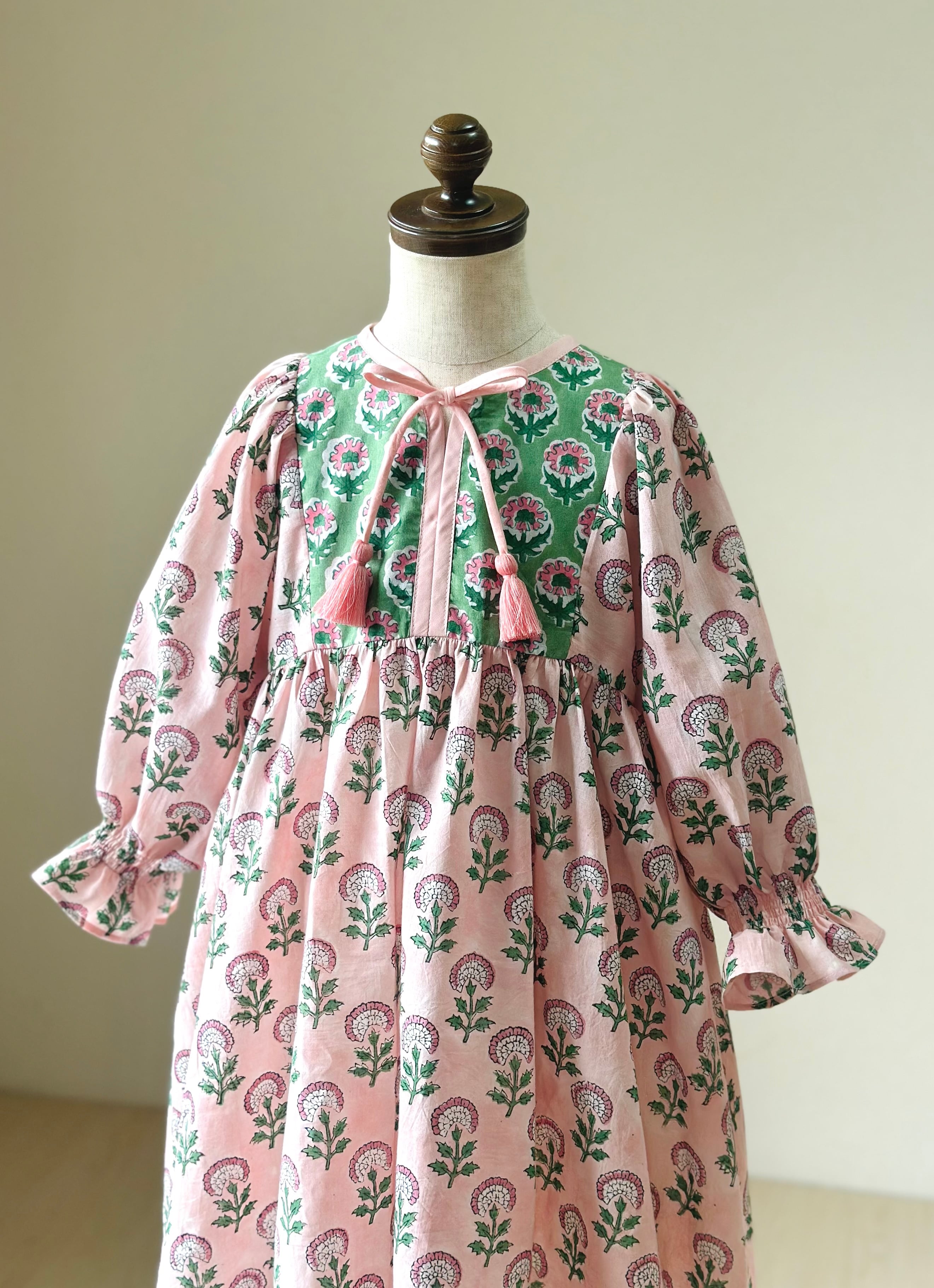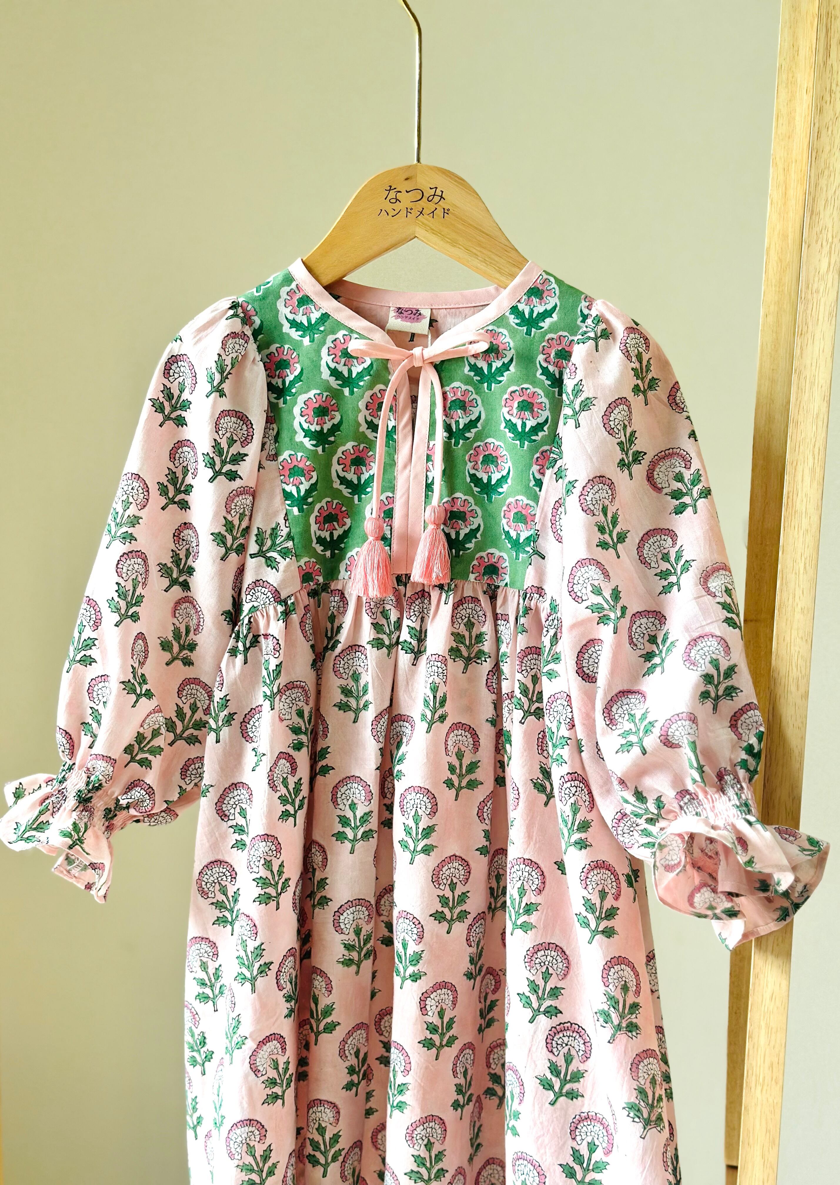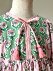 No.T2507ハンドメイドインド生地ブロックプリントピンク×グリーンワンピース