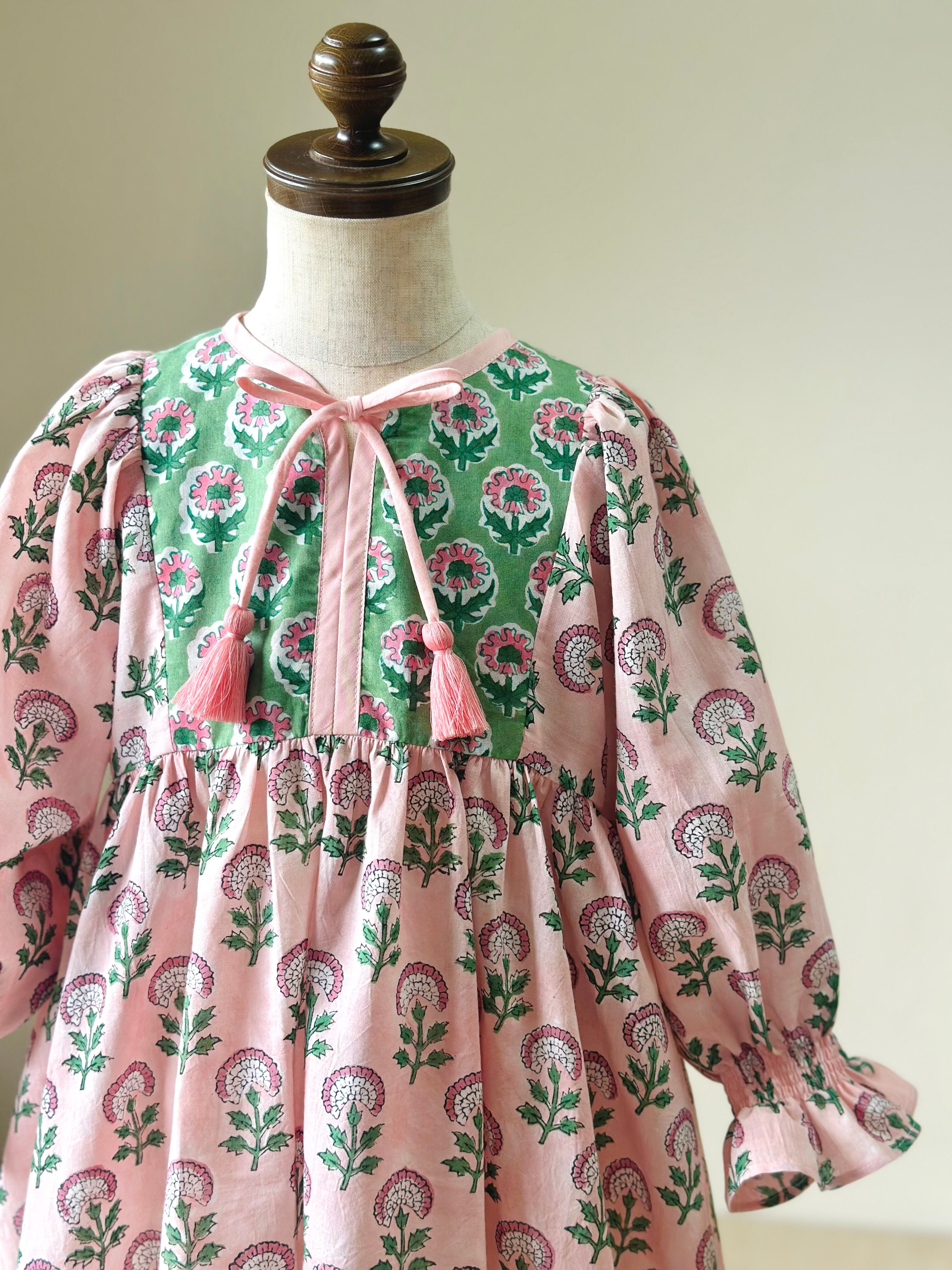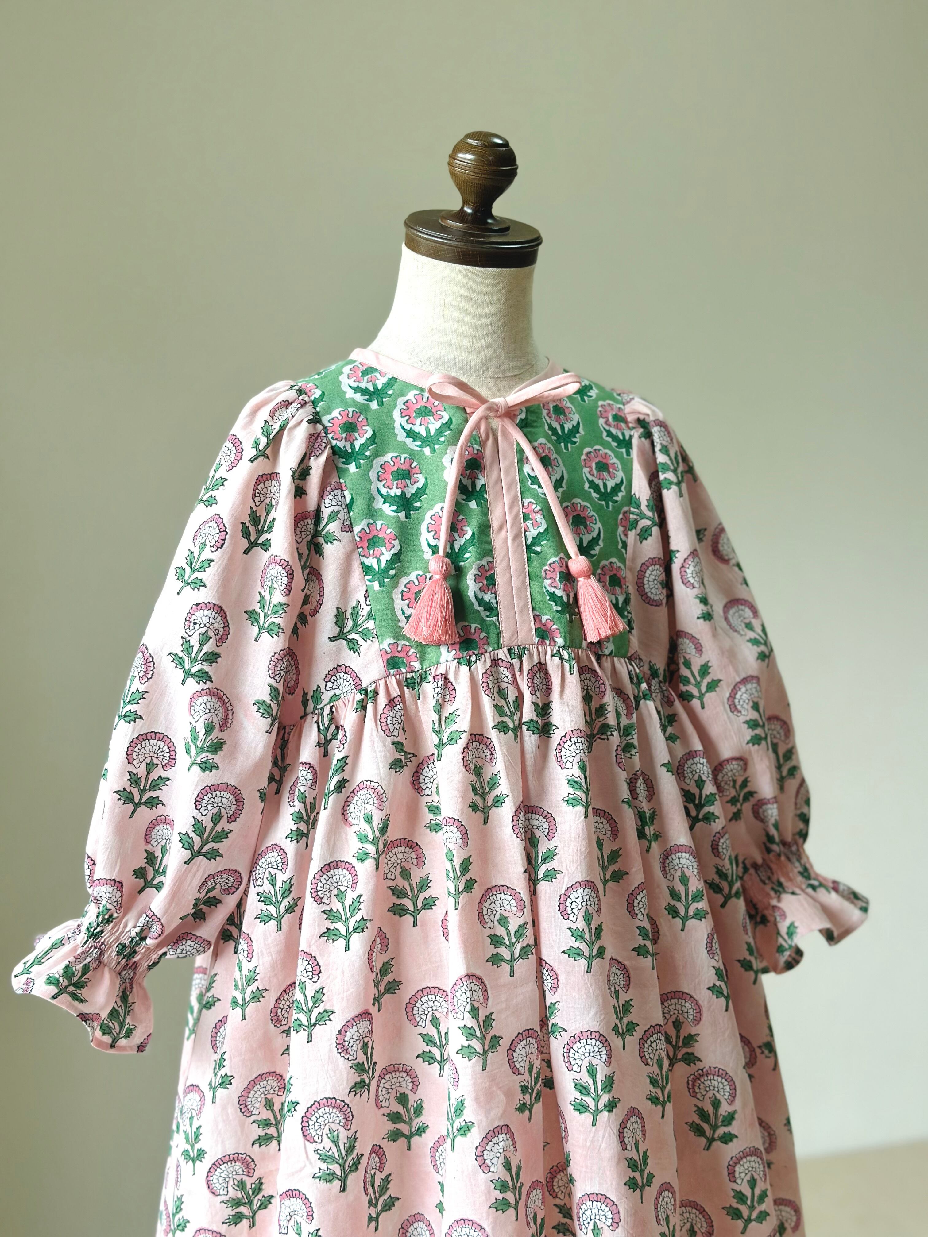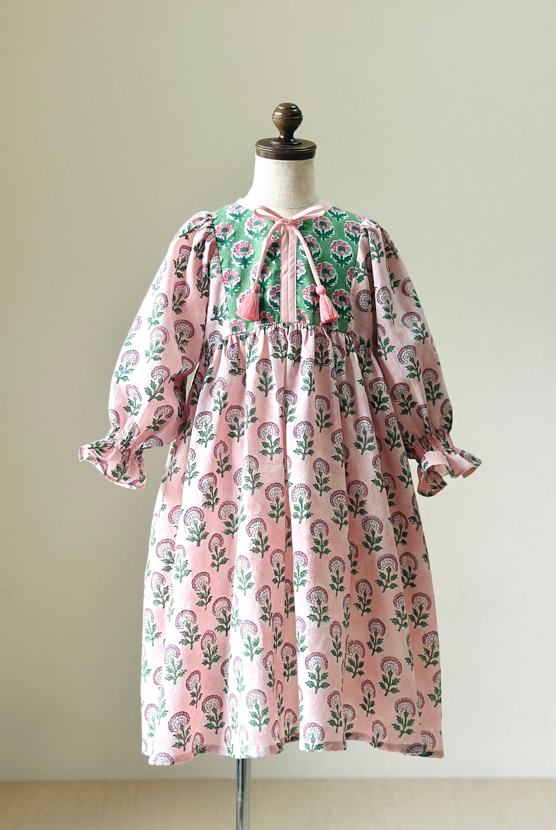 No.T2507ハンドメイドインド生地ブロックプリントピンク×グリーンワンピース