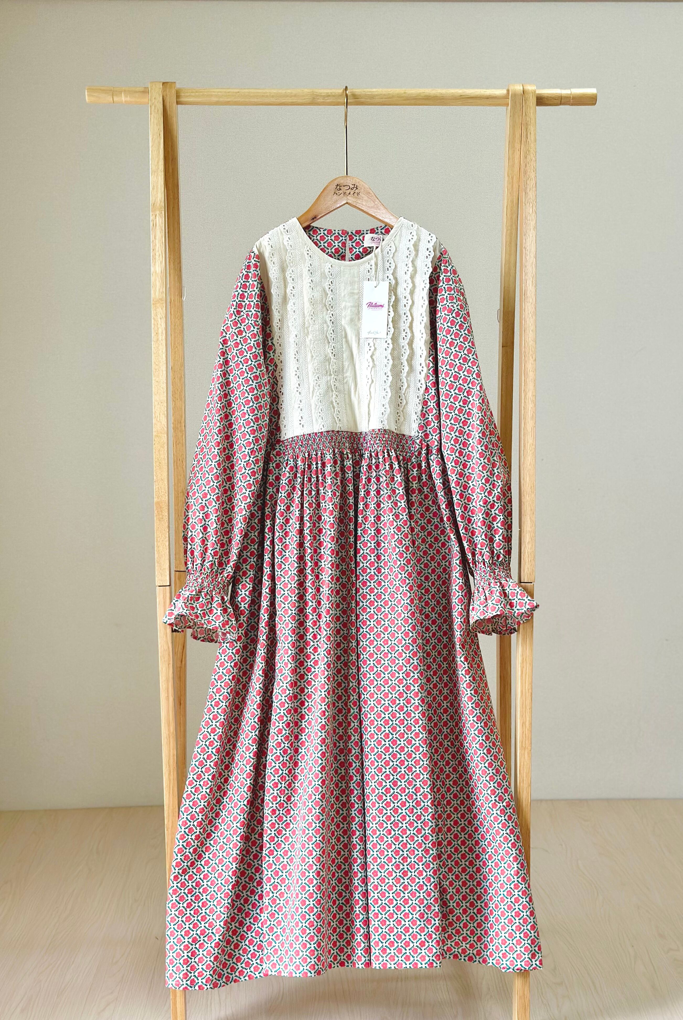 ◎ 胸元の可愛いレースとふんわりシルエットが特徴のワンピース。