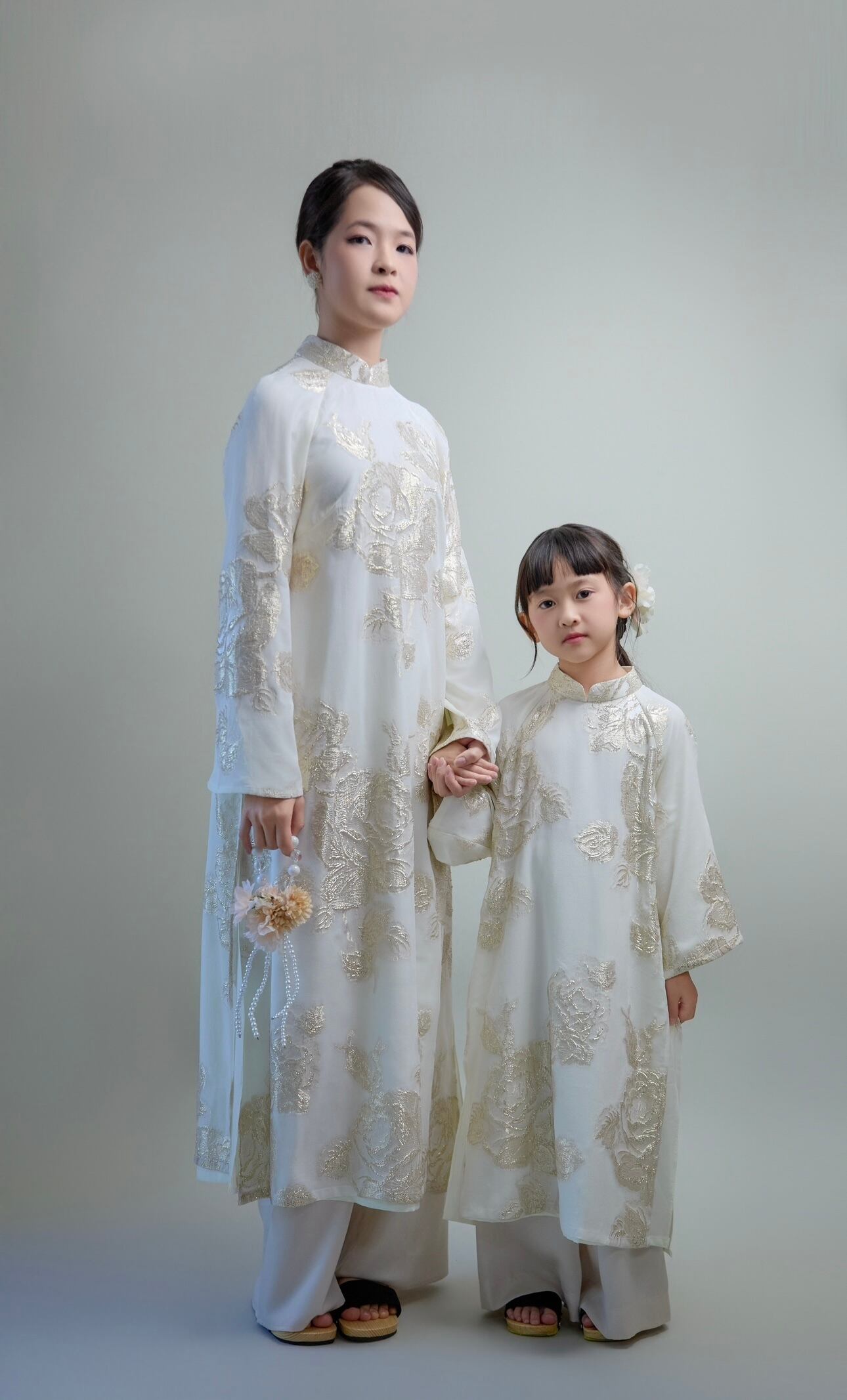 上品な光沢のあるゴールド刺繍シルク生地を使用した、ナツミハンドメイドオリジナルのアオザイセットです。