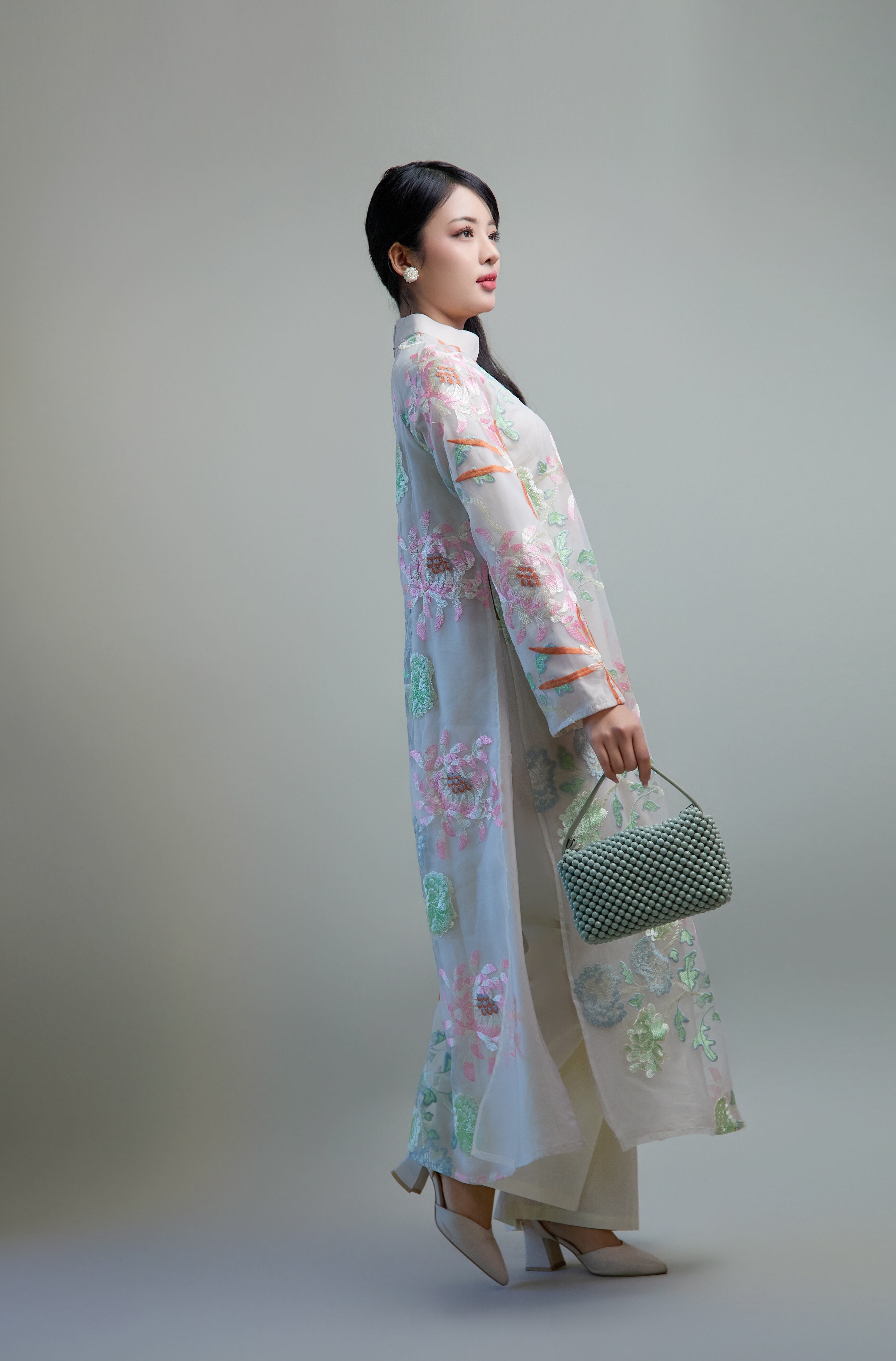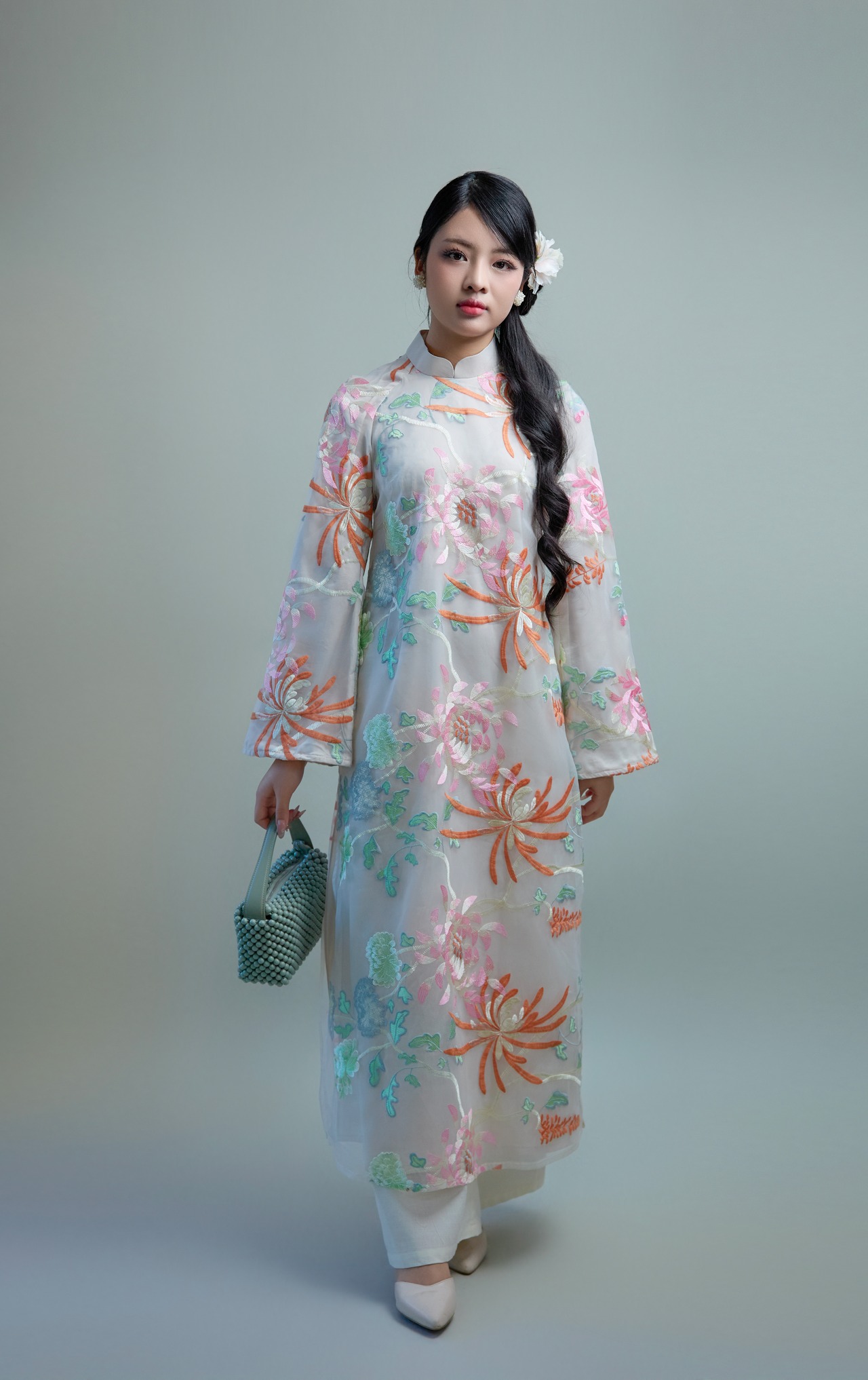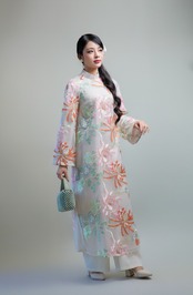 軽やかで透け感のある刺繍入りオーガンジーシルク生地を使用した、ナツミハンドメイドオリジナルのアオザイセットです。