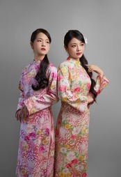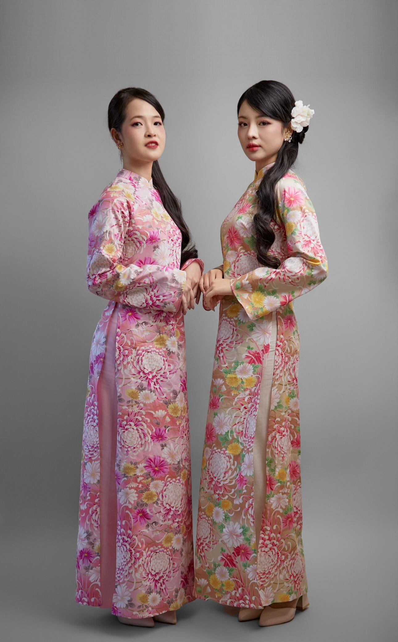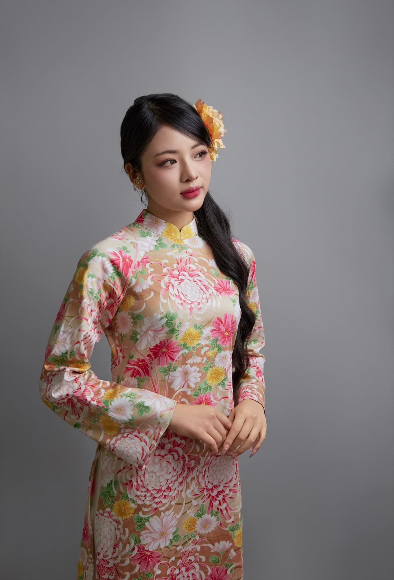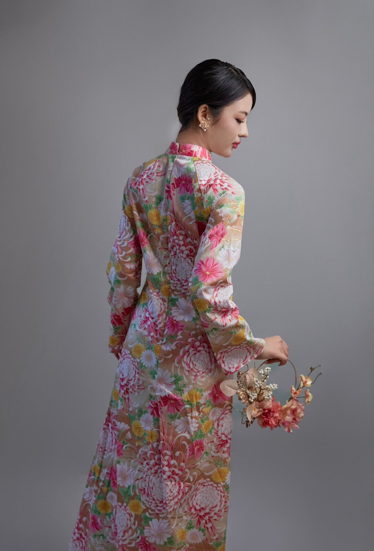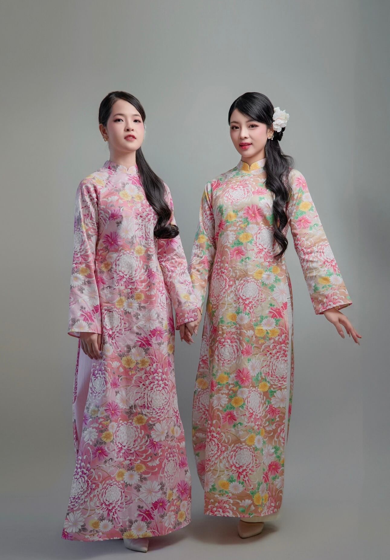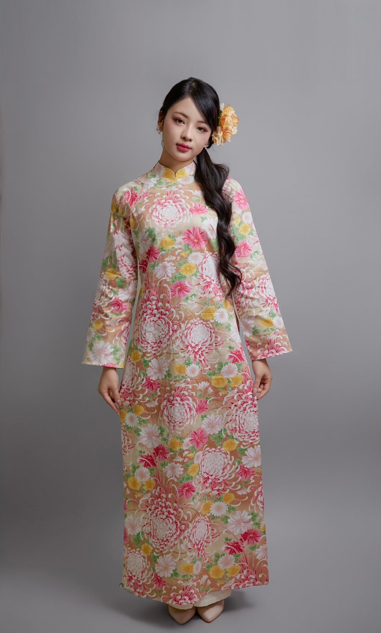 日本製の綿コットン100%生地に、華やかな菊花柄をあしらった上品なアオザイセットです。