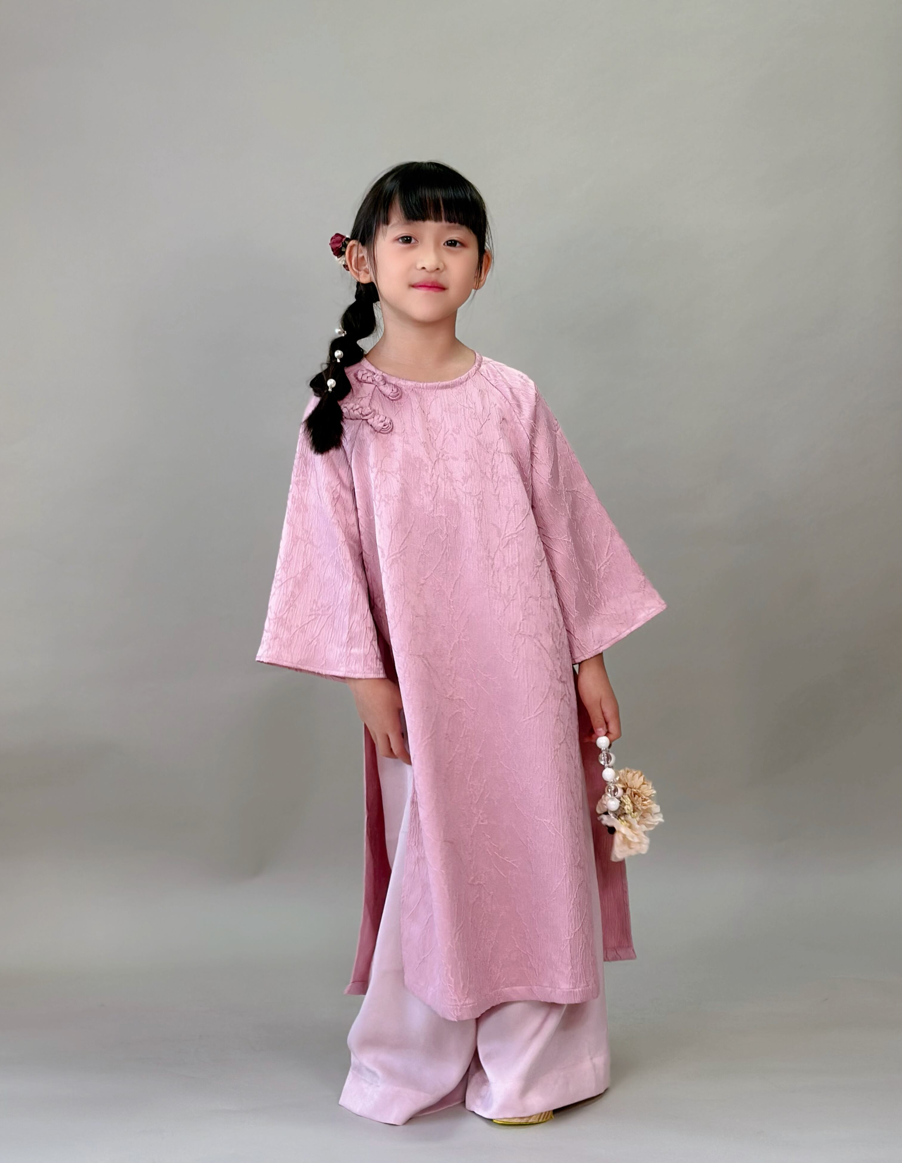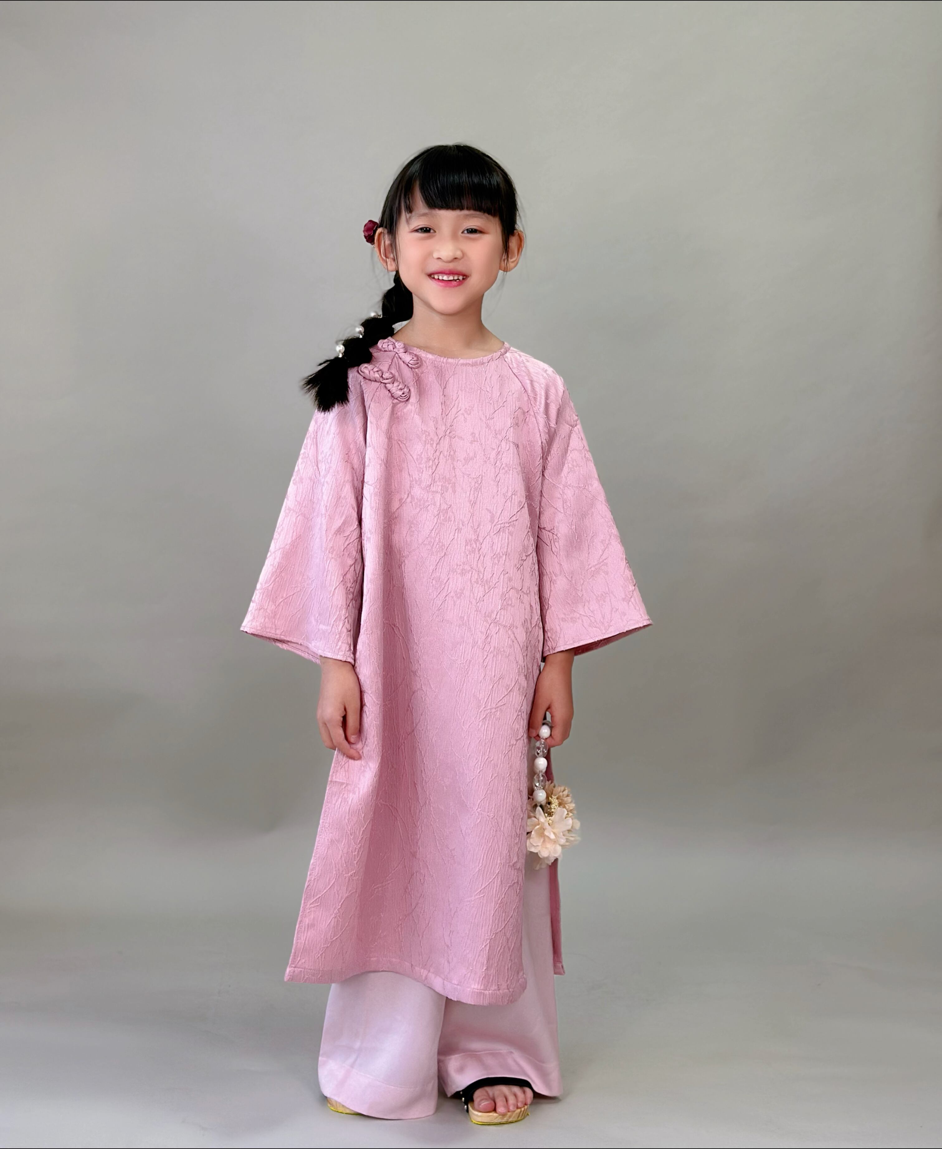 柔らかく上品な光沢を持つシルクジャカード生地を使用した、可憐なピンクアオザイ。
