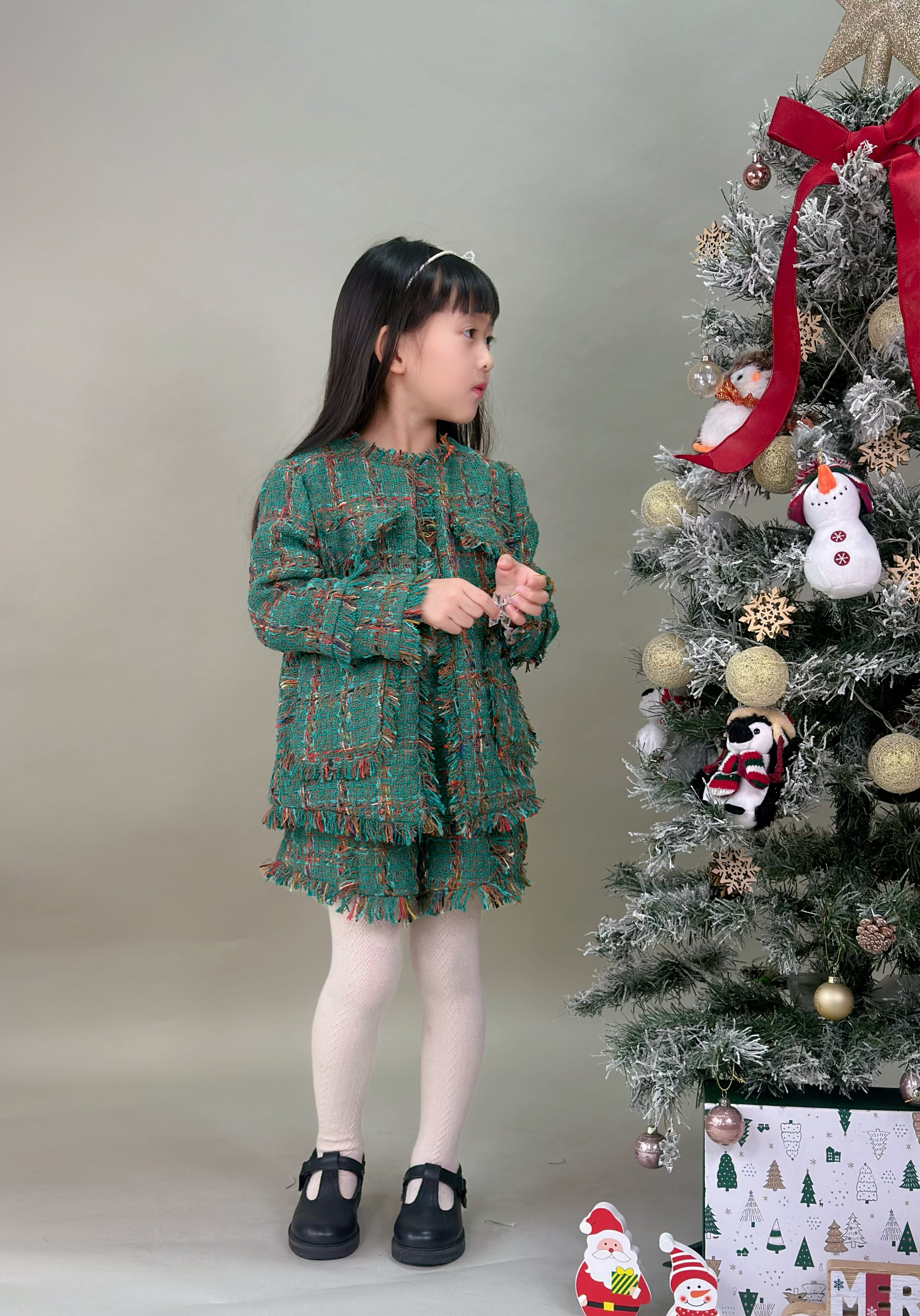 No.GS2609|グリーンツイードフリンジセットアップ子供服カチューシャ付き