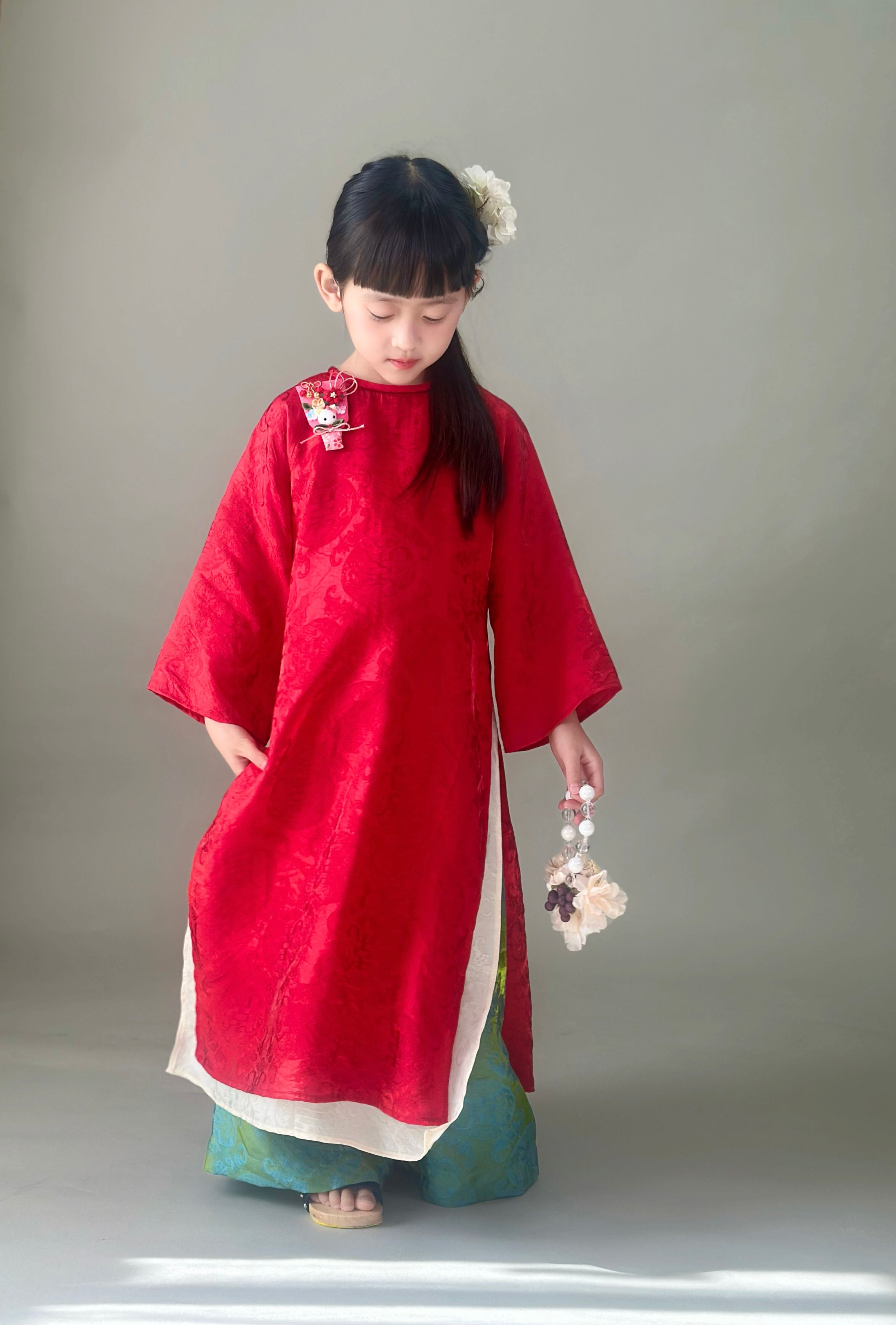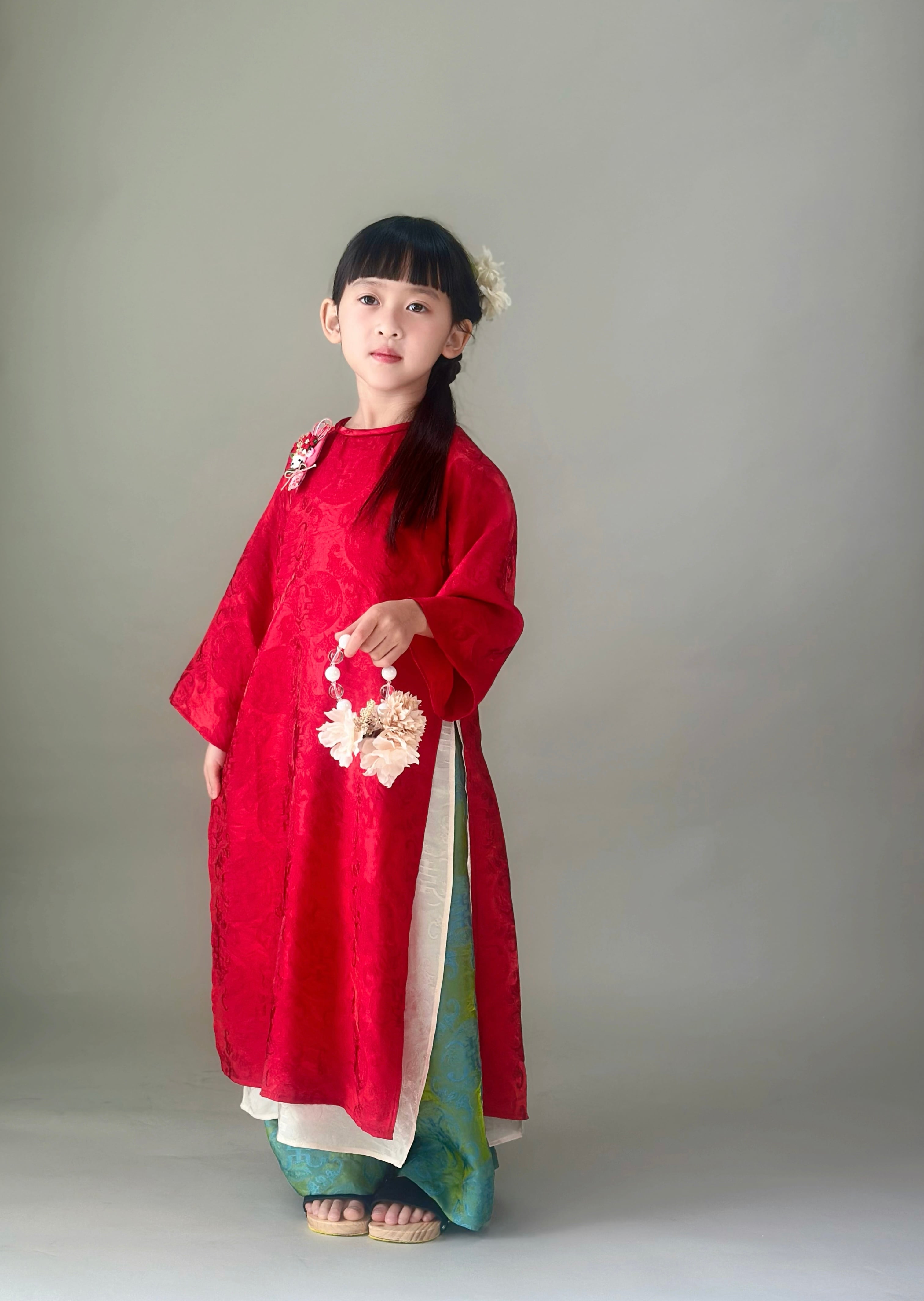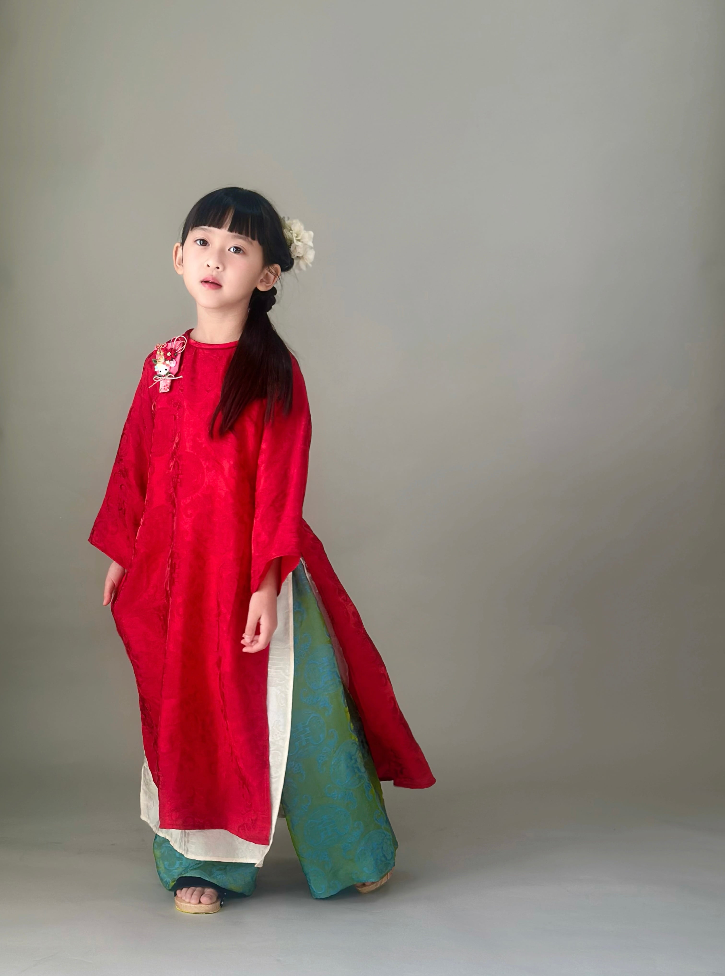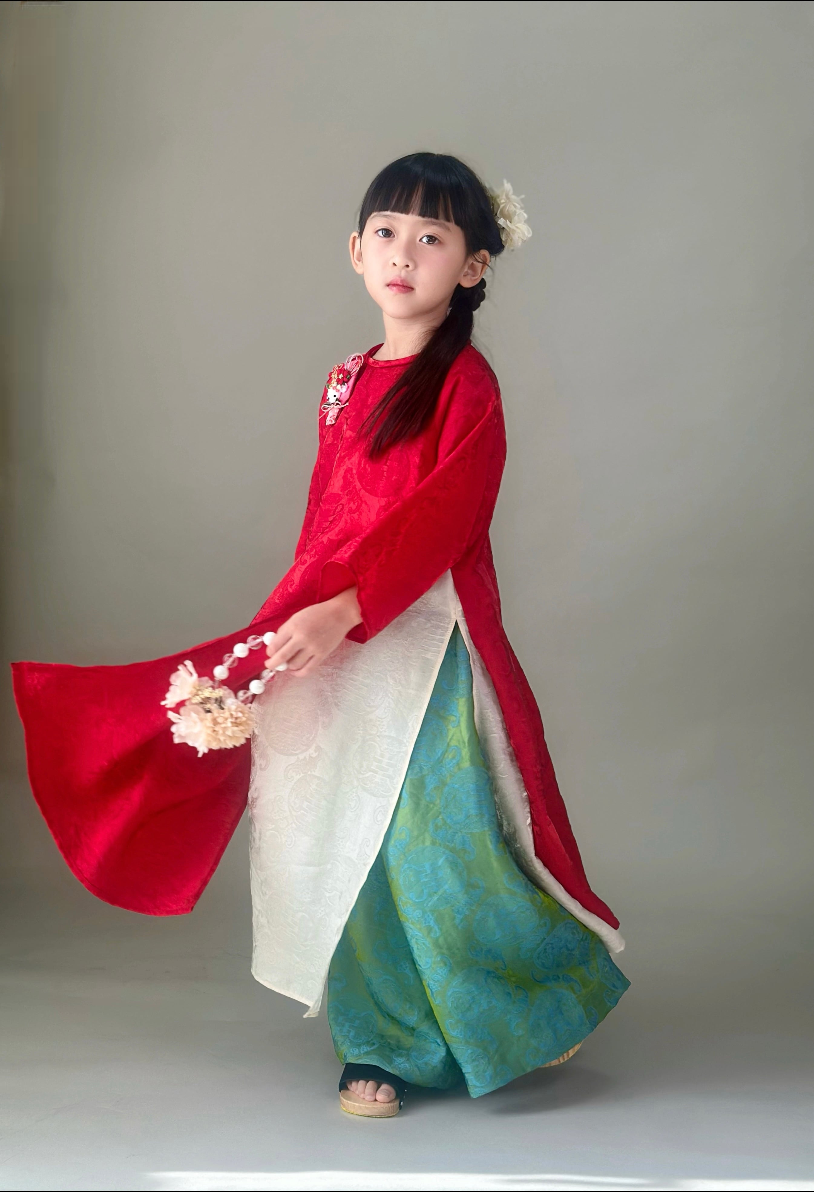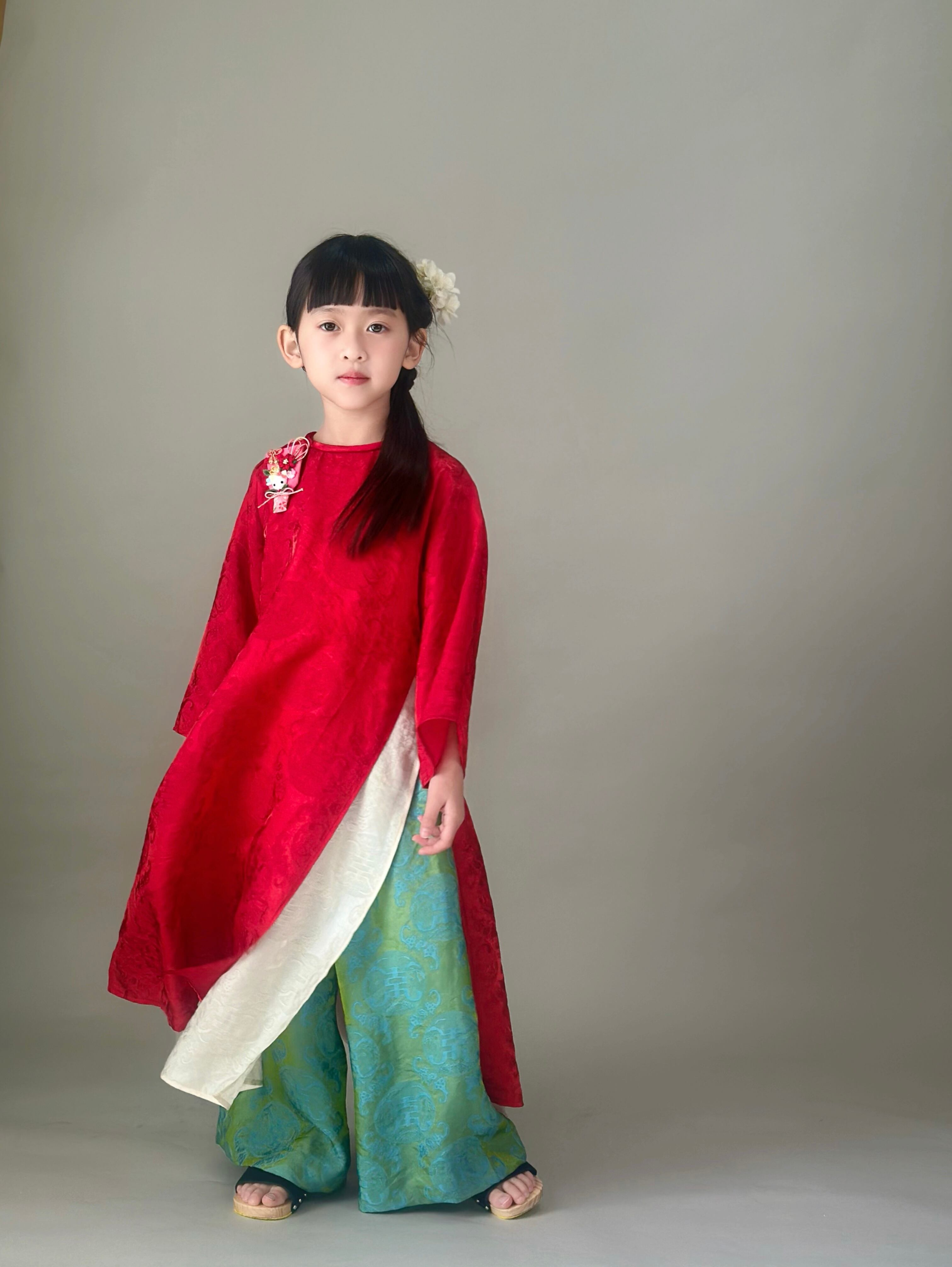 No.T2635|ハンドメイド女の子可愛いシルクアオザイ セット手作り胸飾り付き