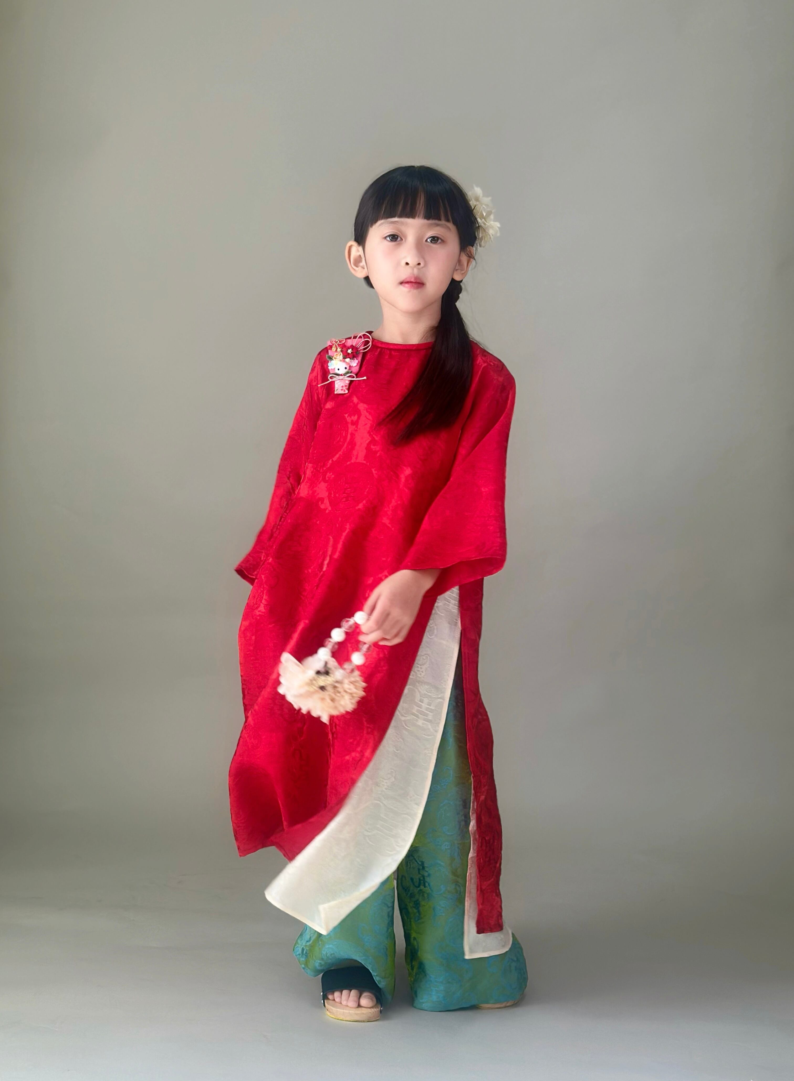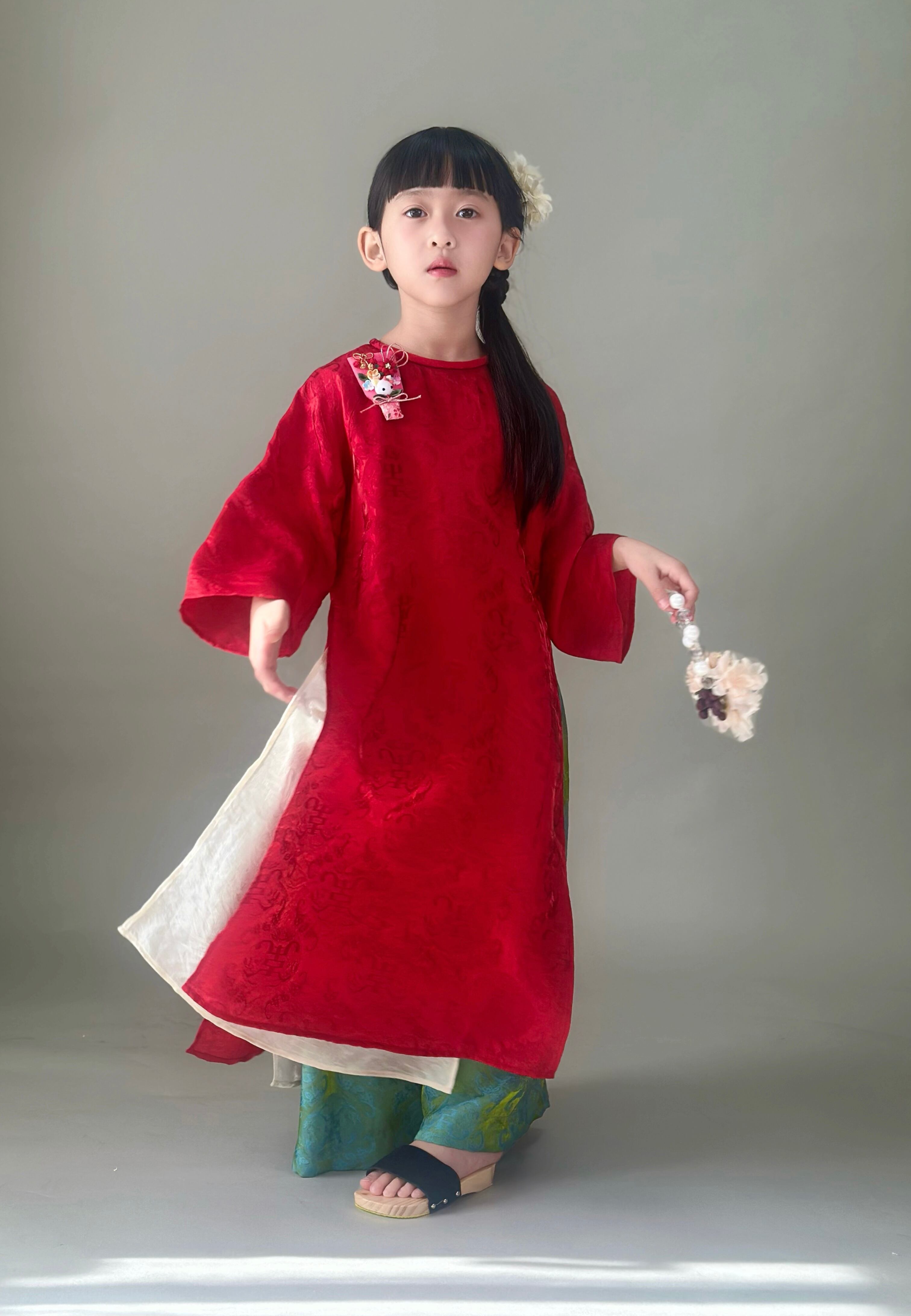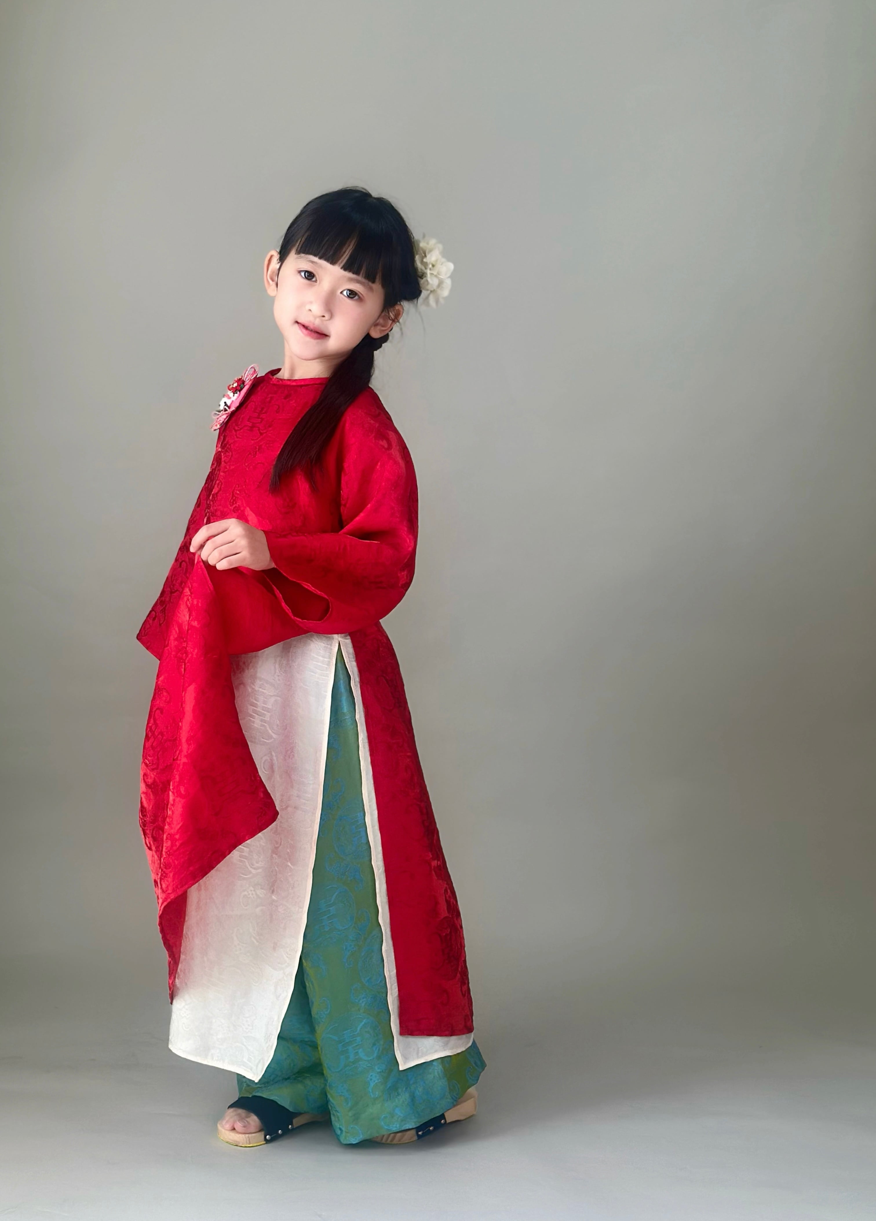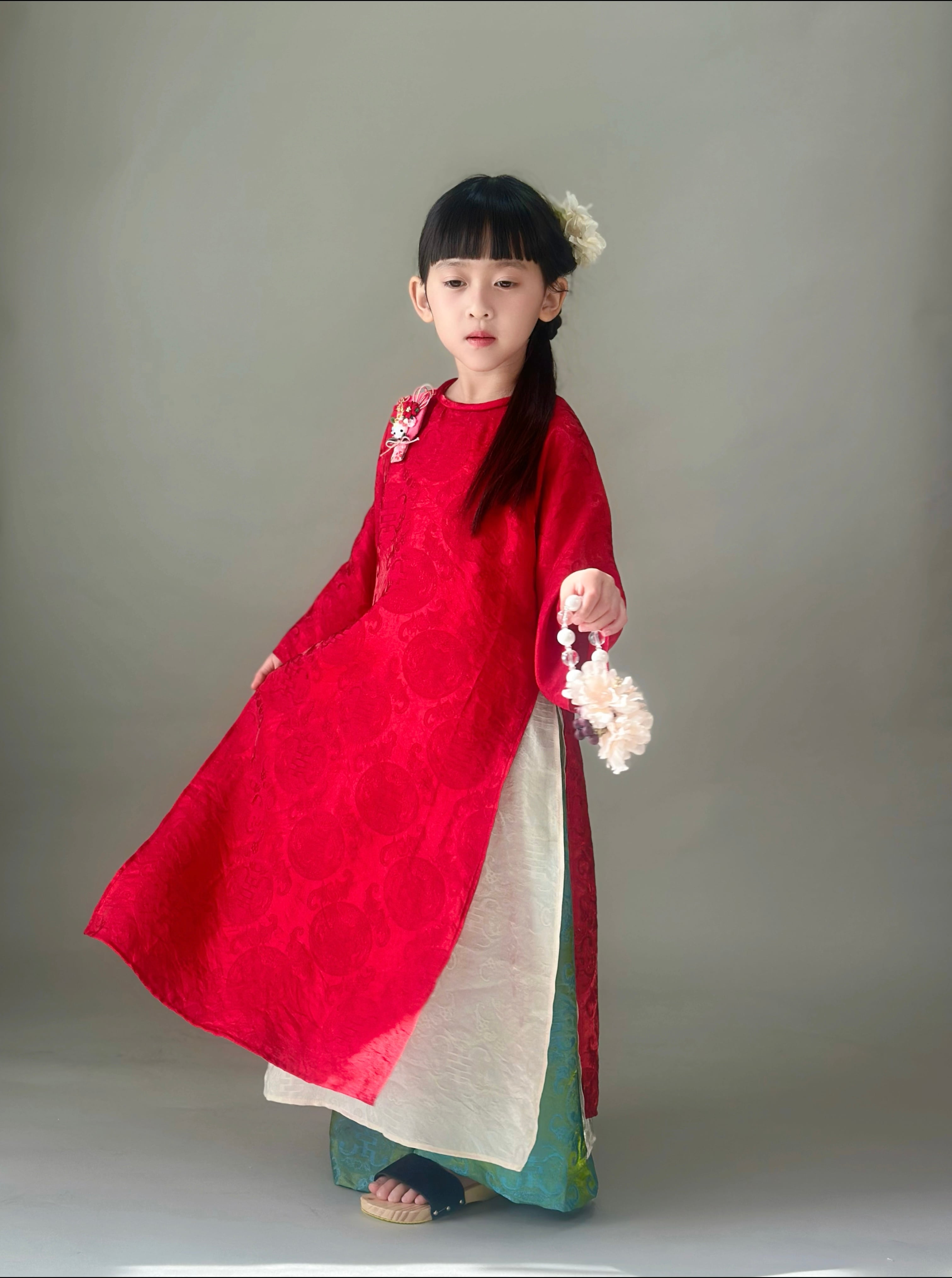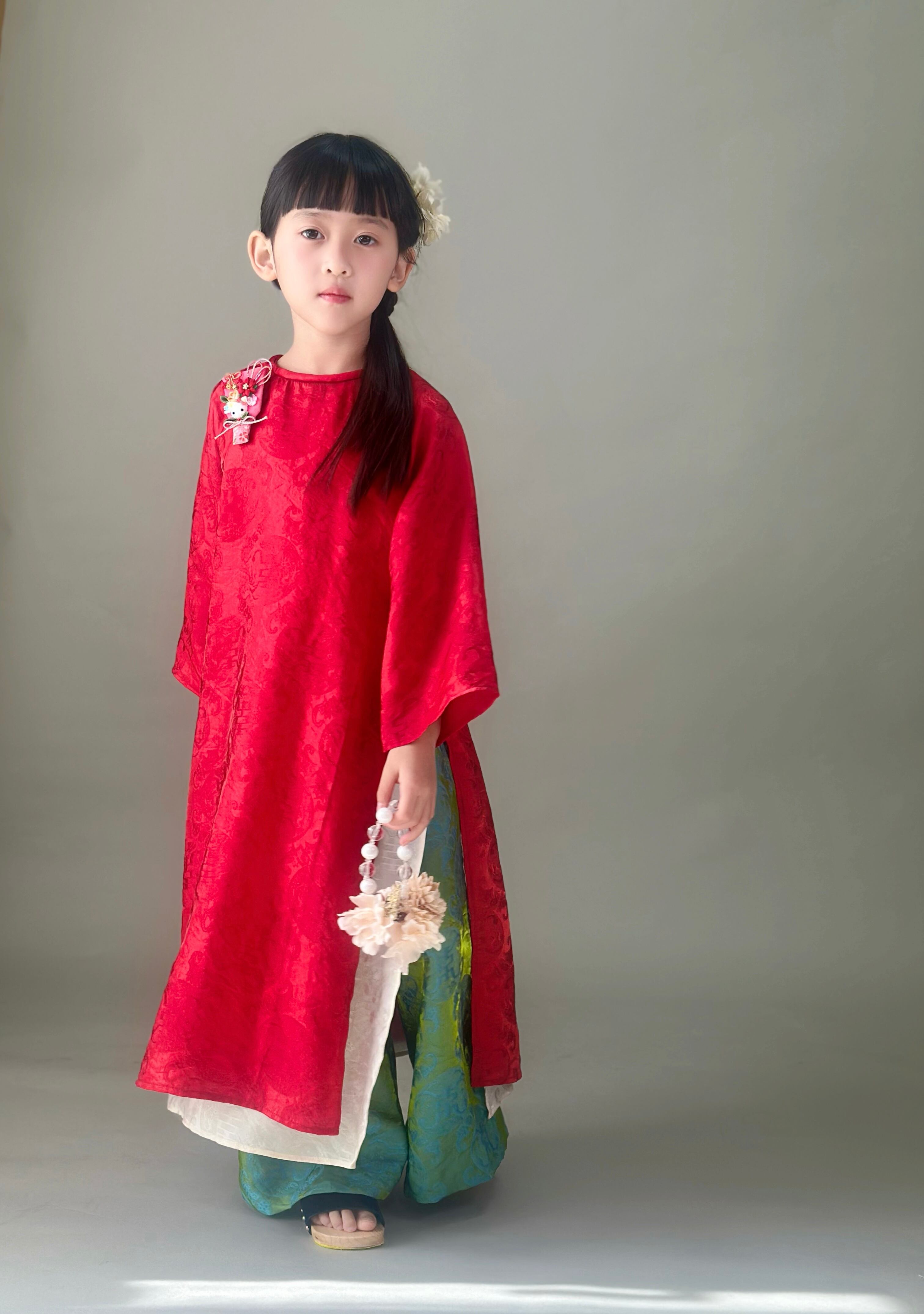 No.T2635|ハンドメイド女の子可愛いシルクアオザイ セット手作り胸飾り付き