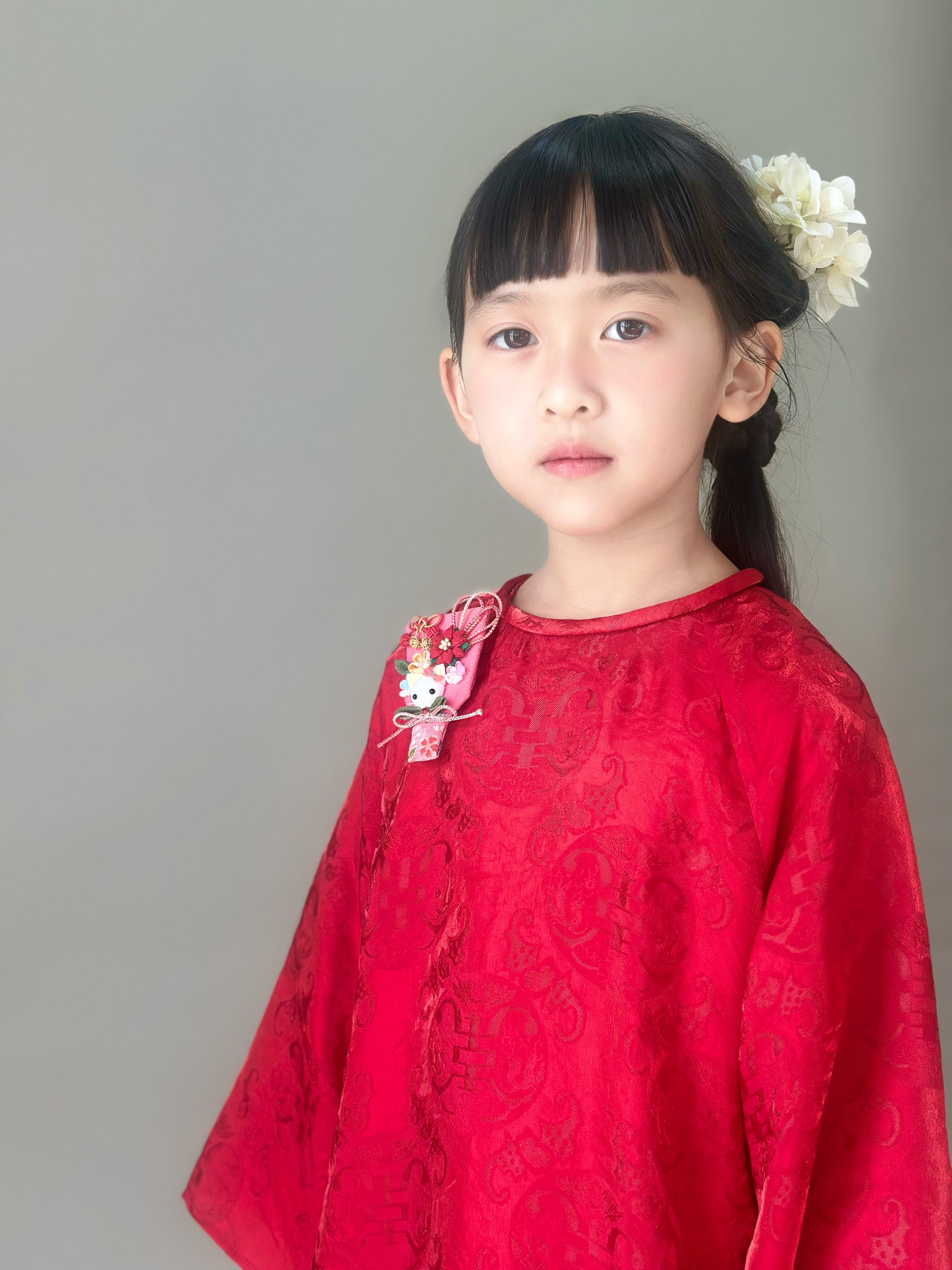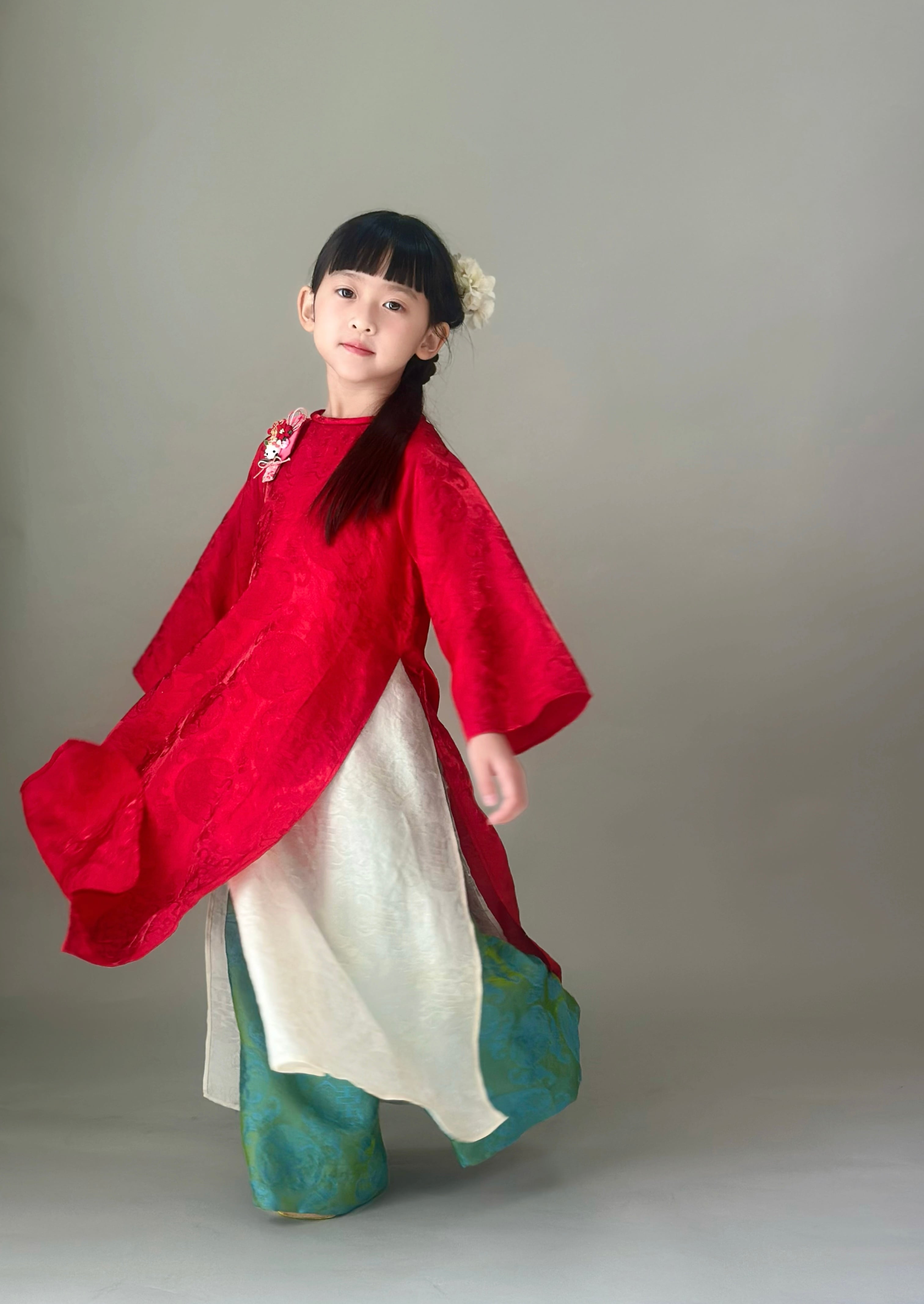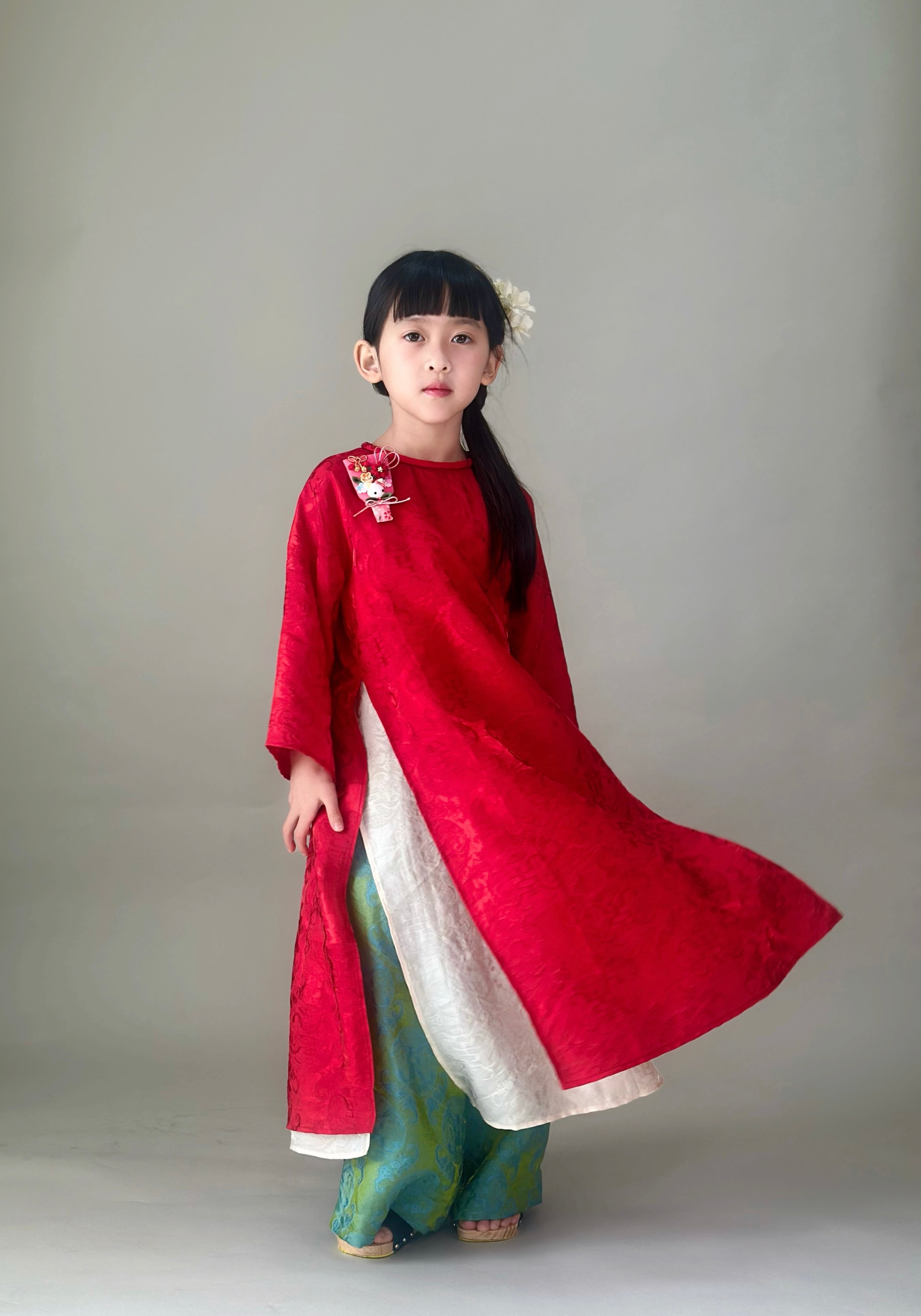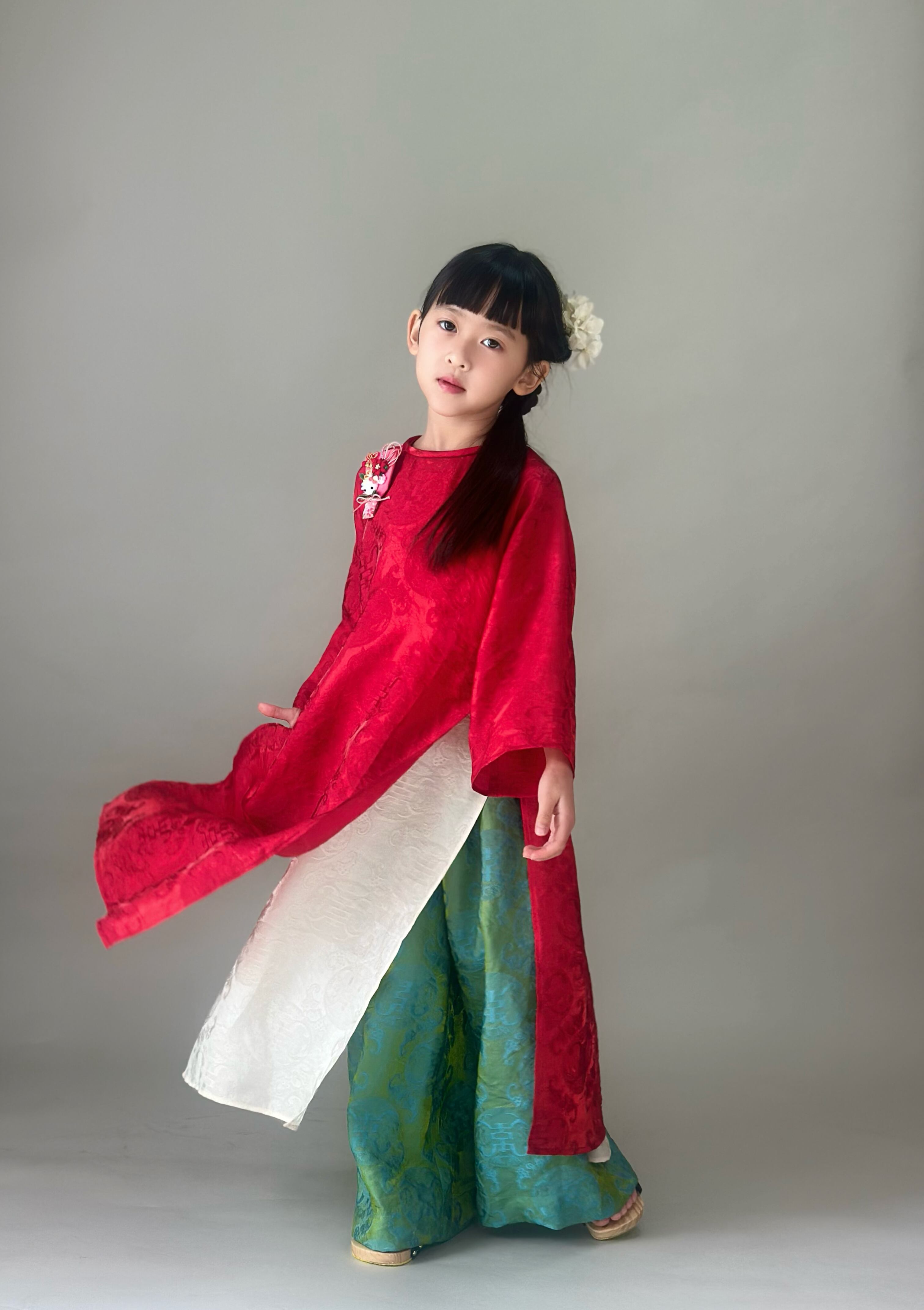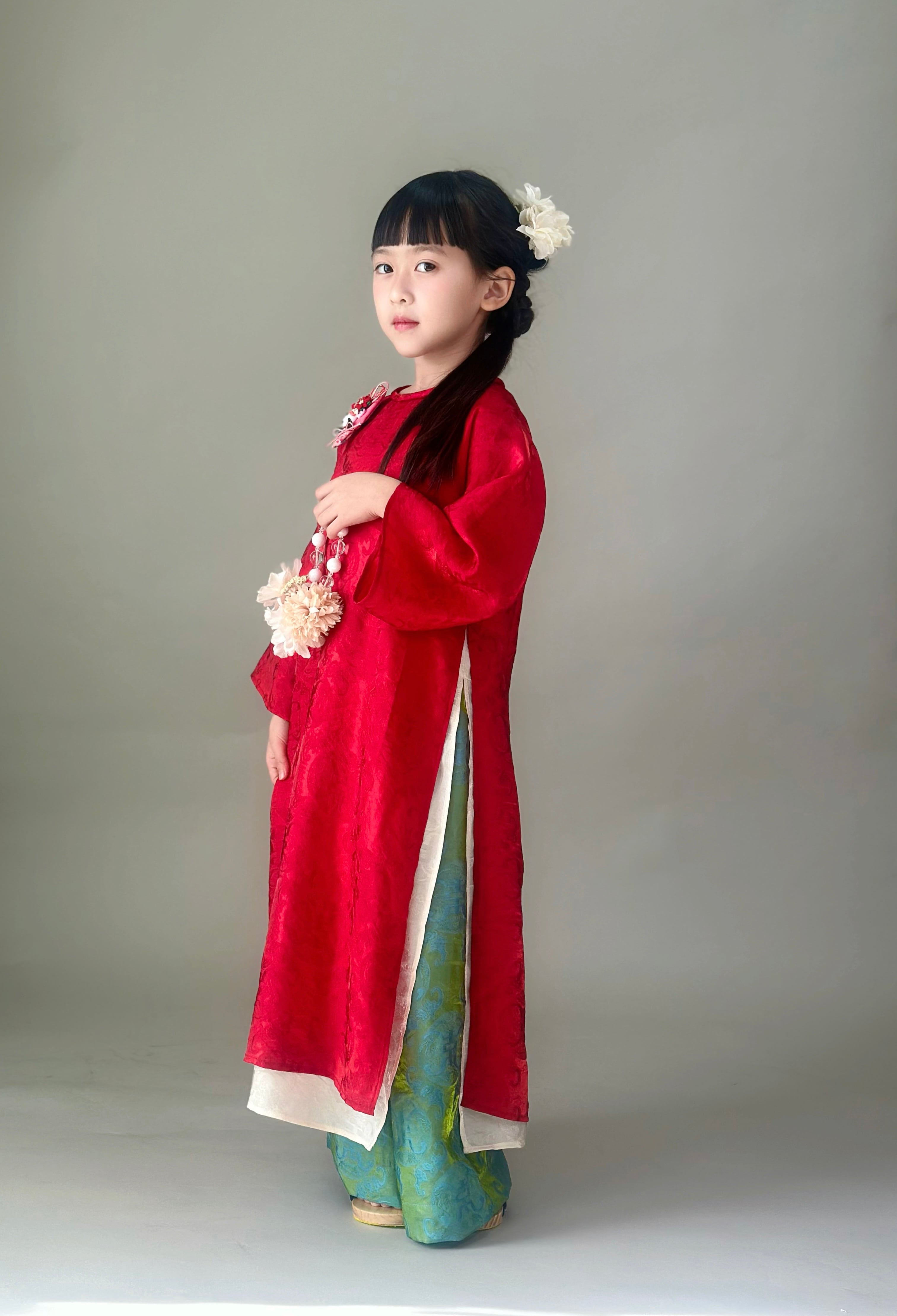 No.T2635|ハンドメイド女の子可愛いシルクアオザイ セット手作り胸飾り付き