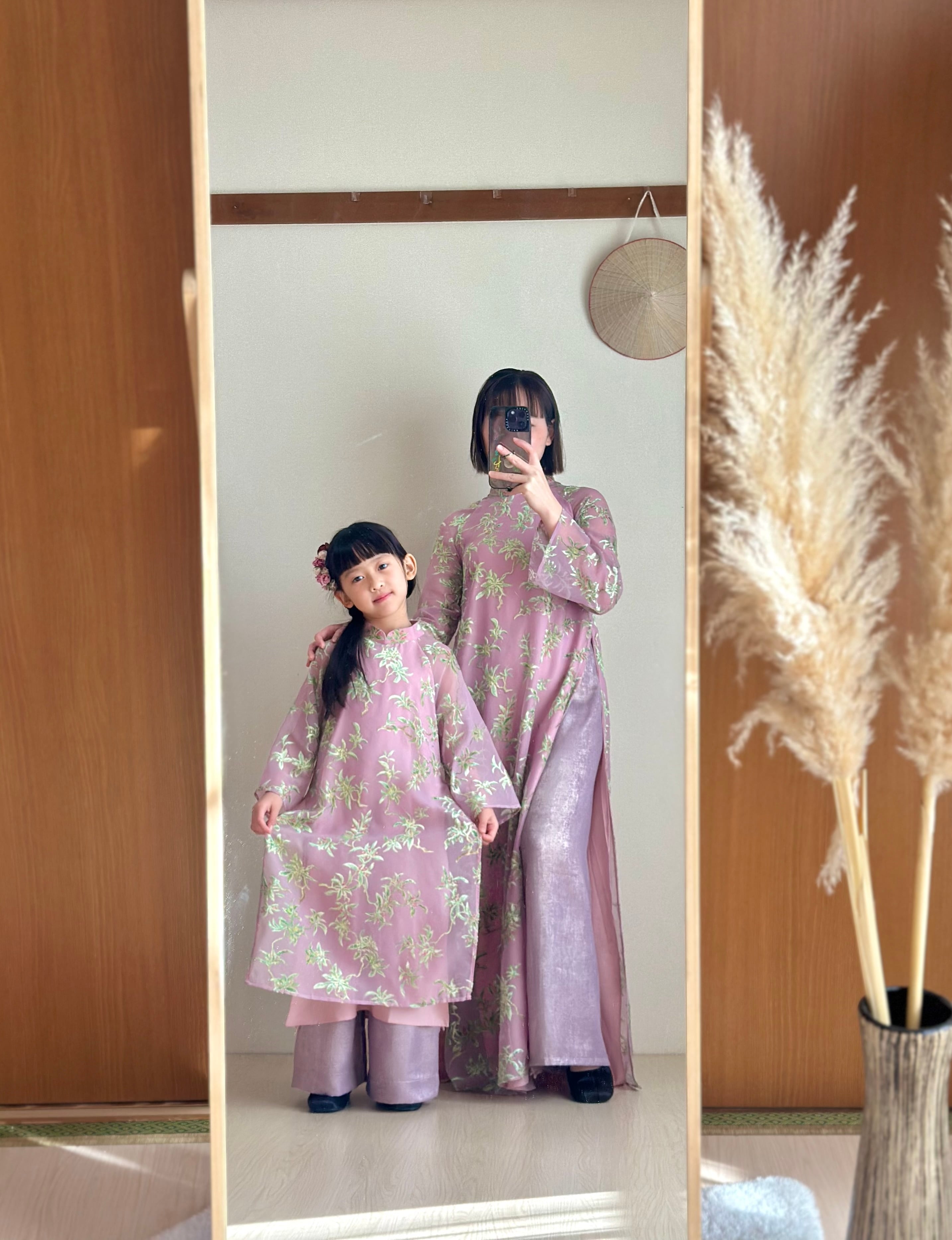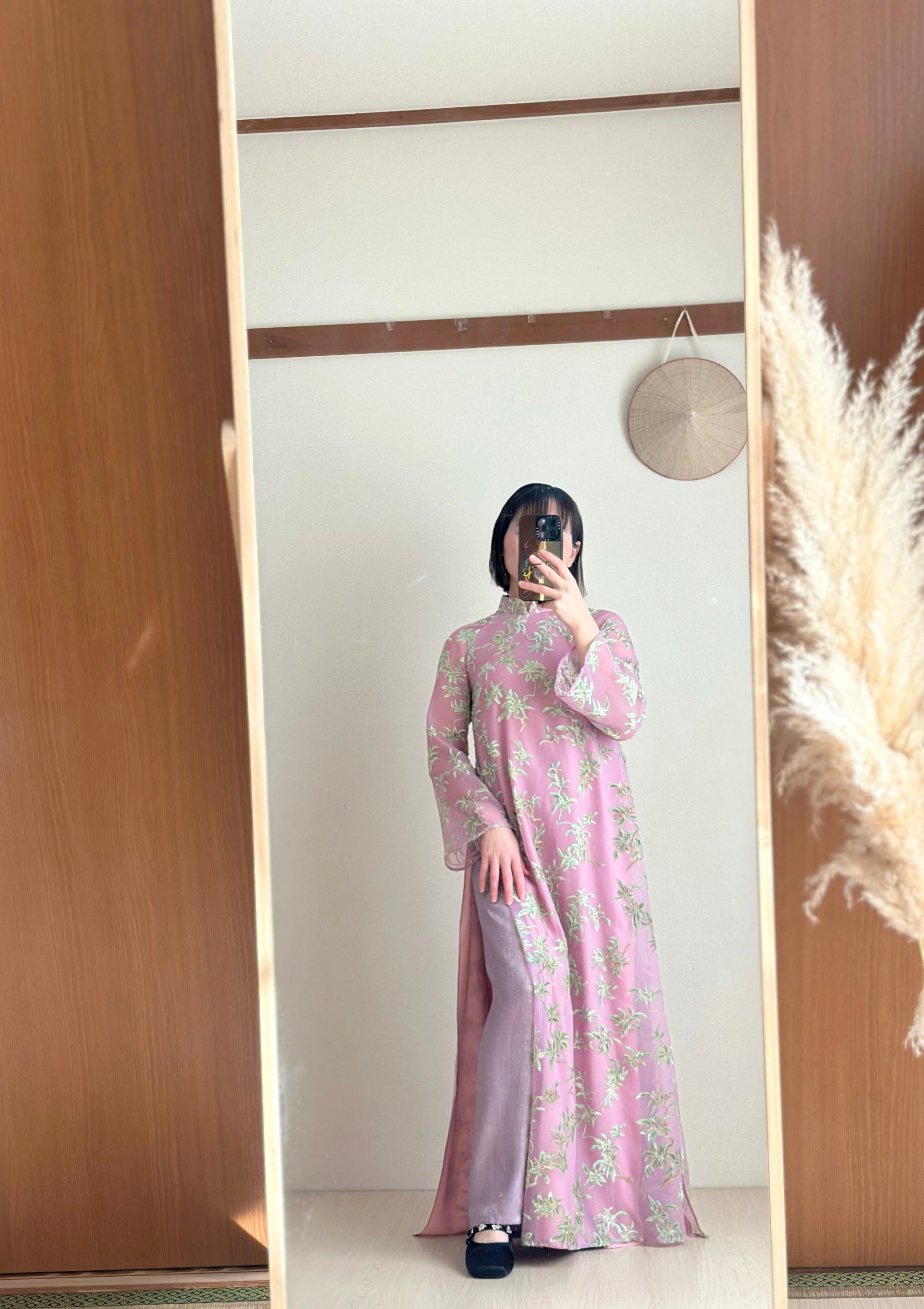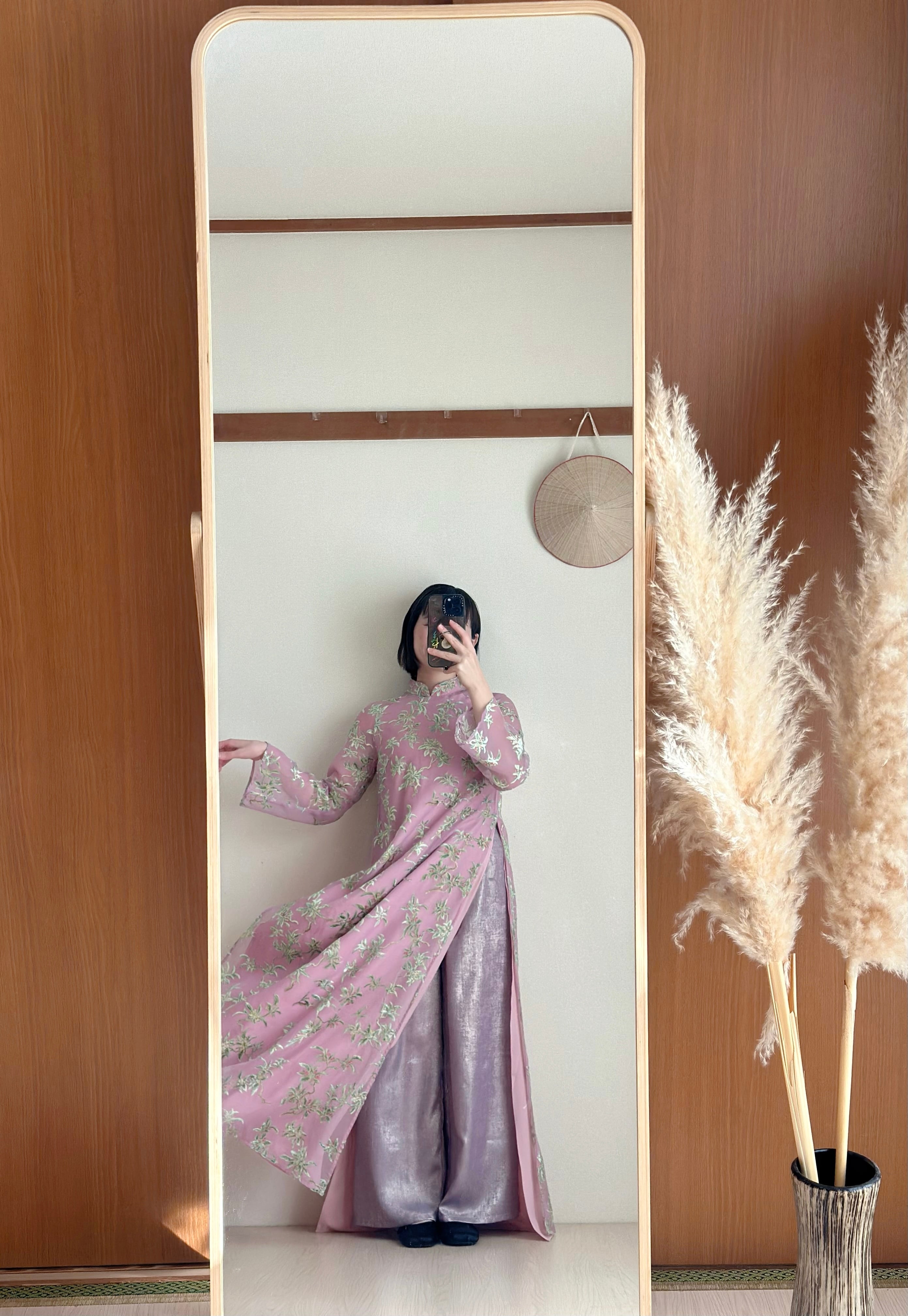 シンプルで上品なデザインのアオザイに、ベルベット生地で仕立てた立体花モチーフをあしらいました。