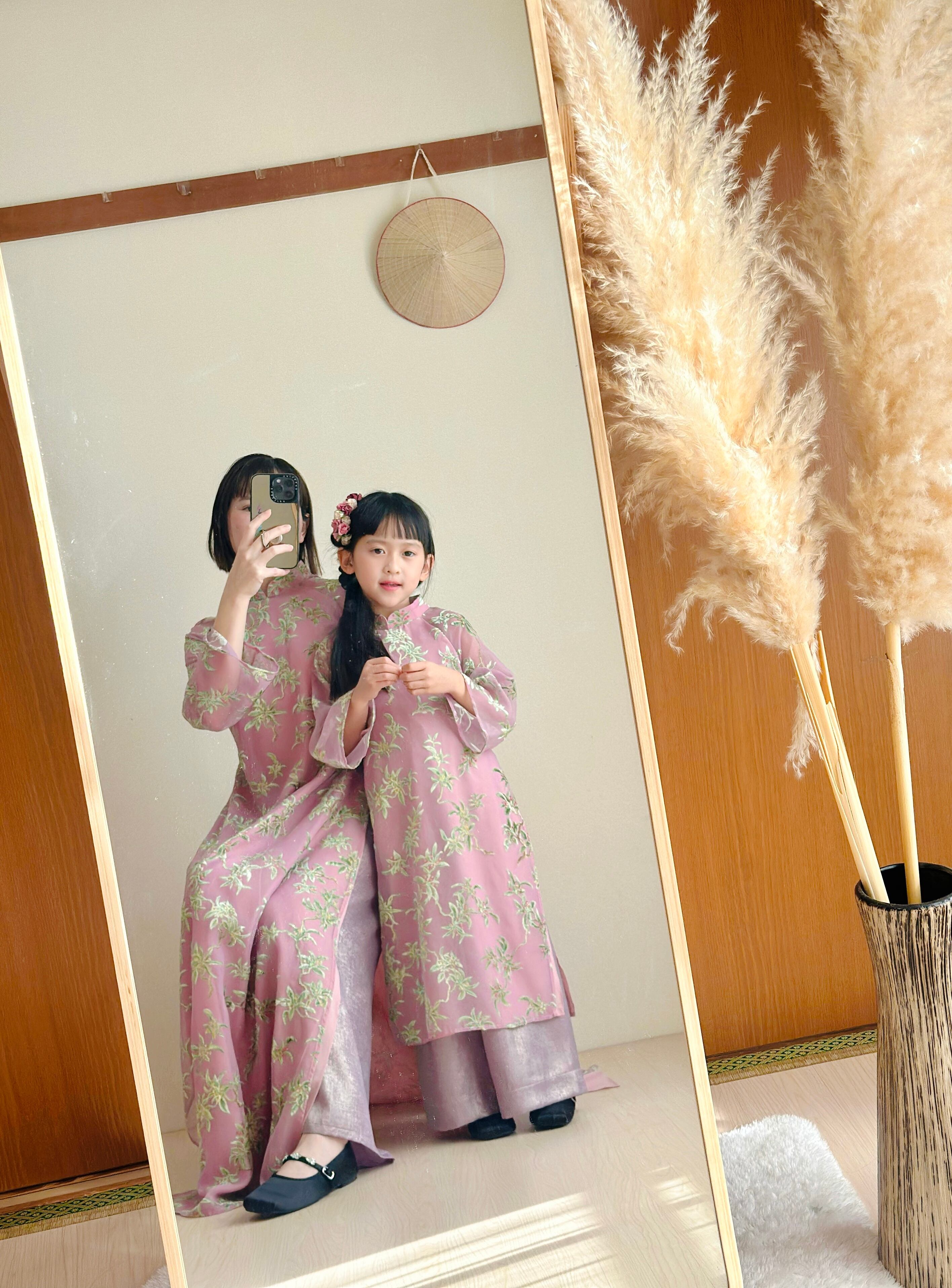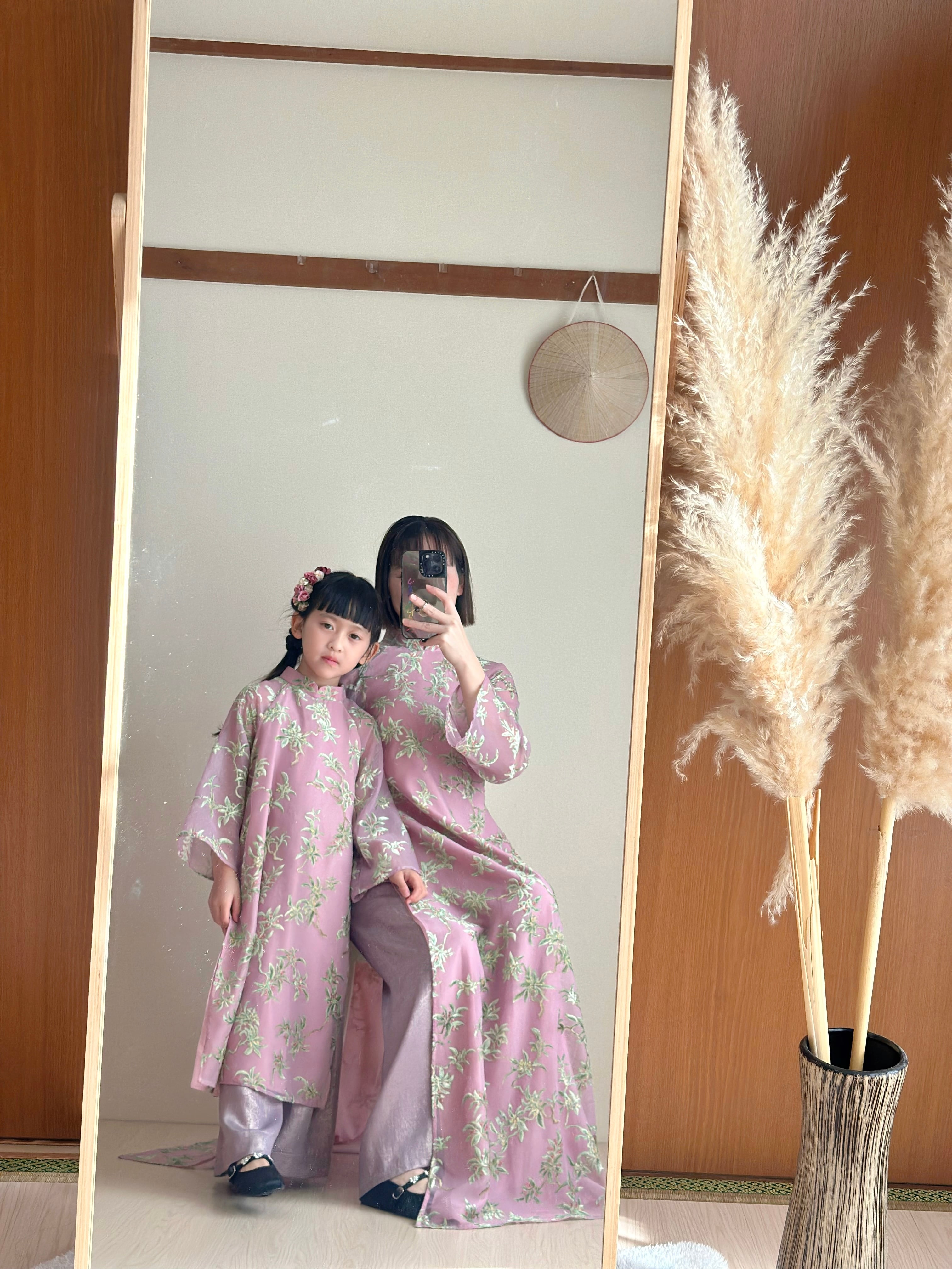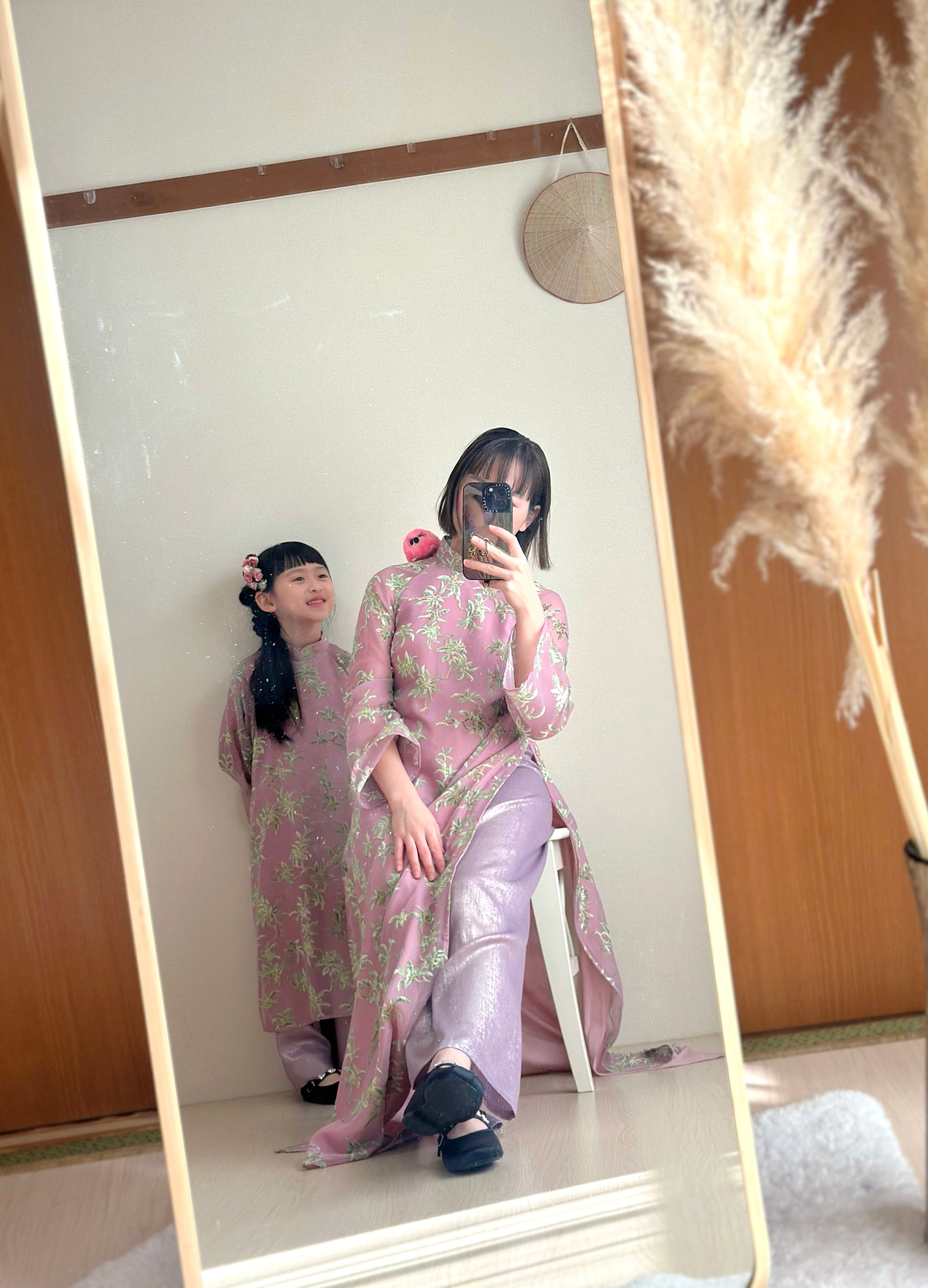 シンプルで上品なデザインのアオザイに、ベルベット生地で仕立てた立体花モチーフをあしらいました。