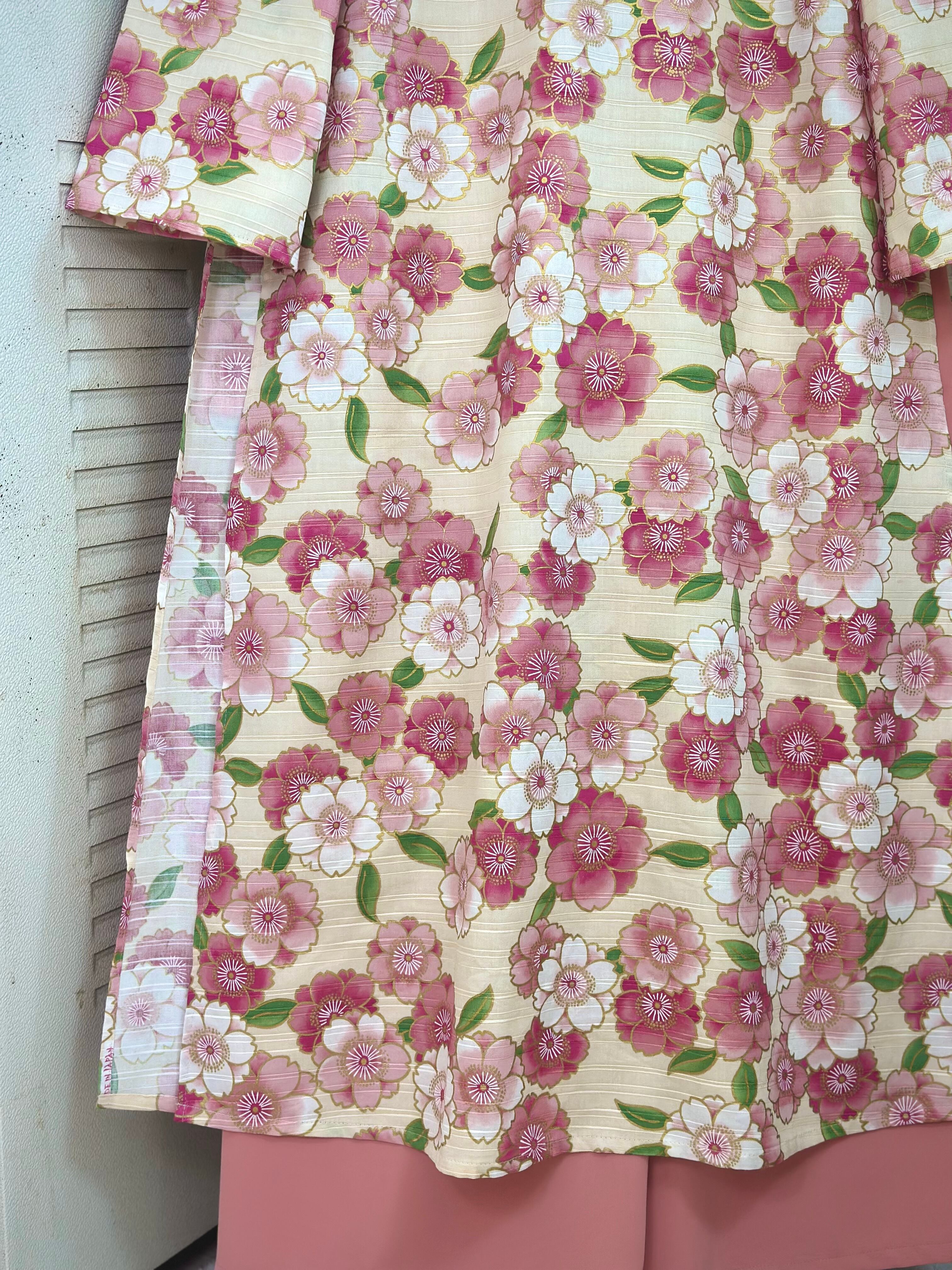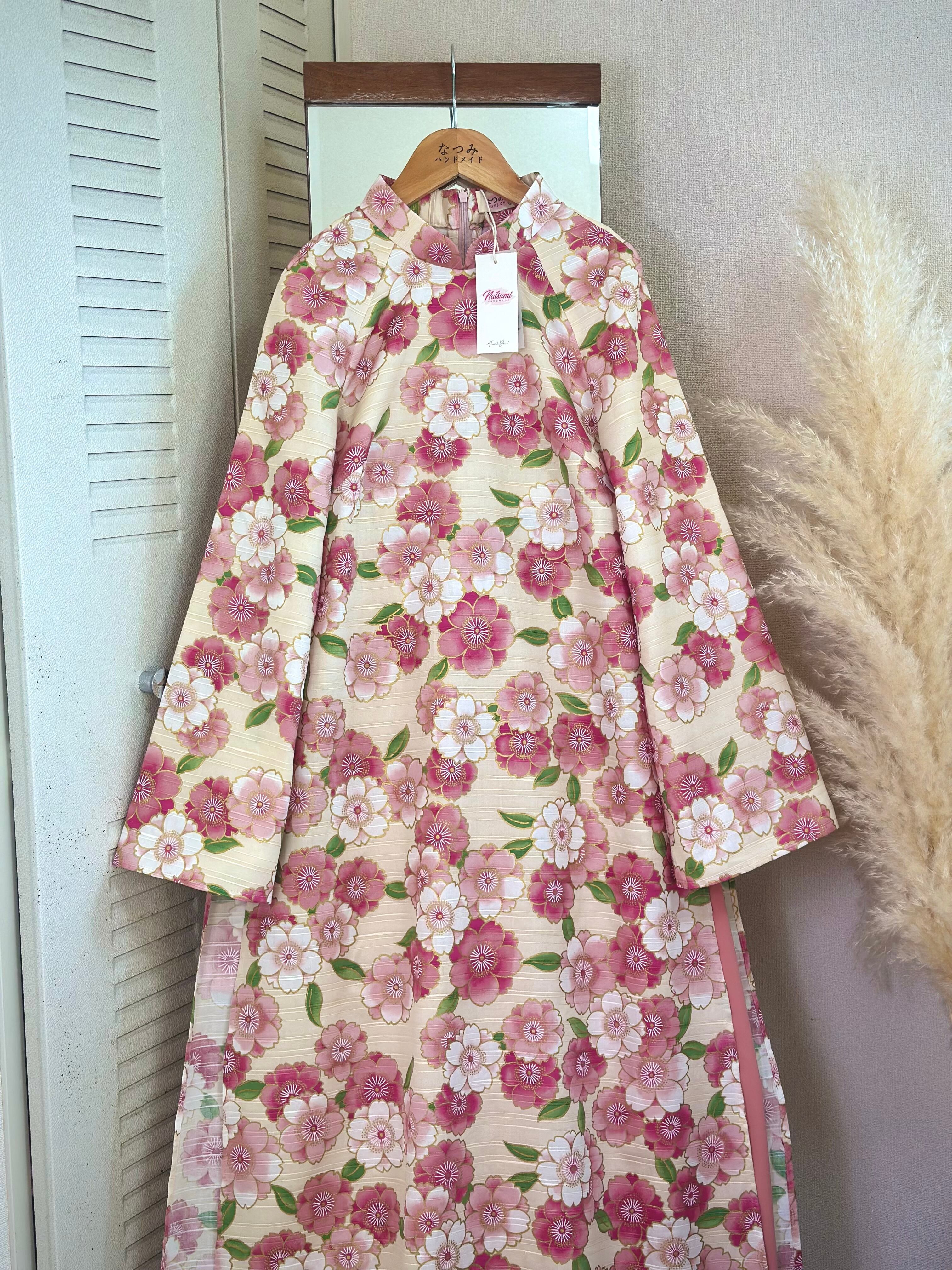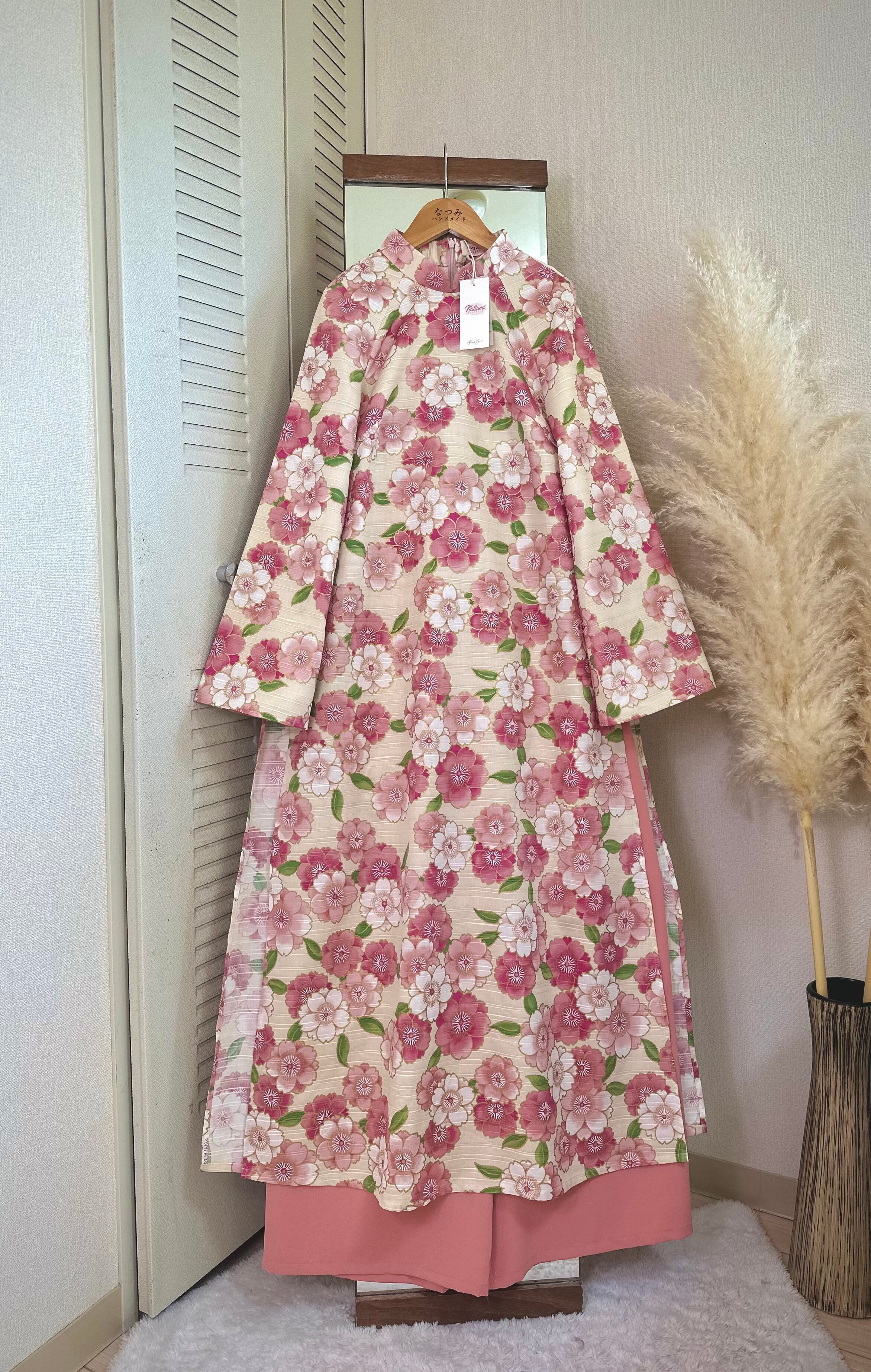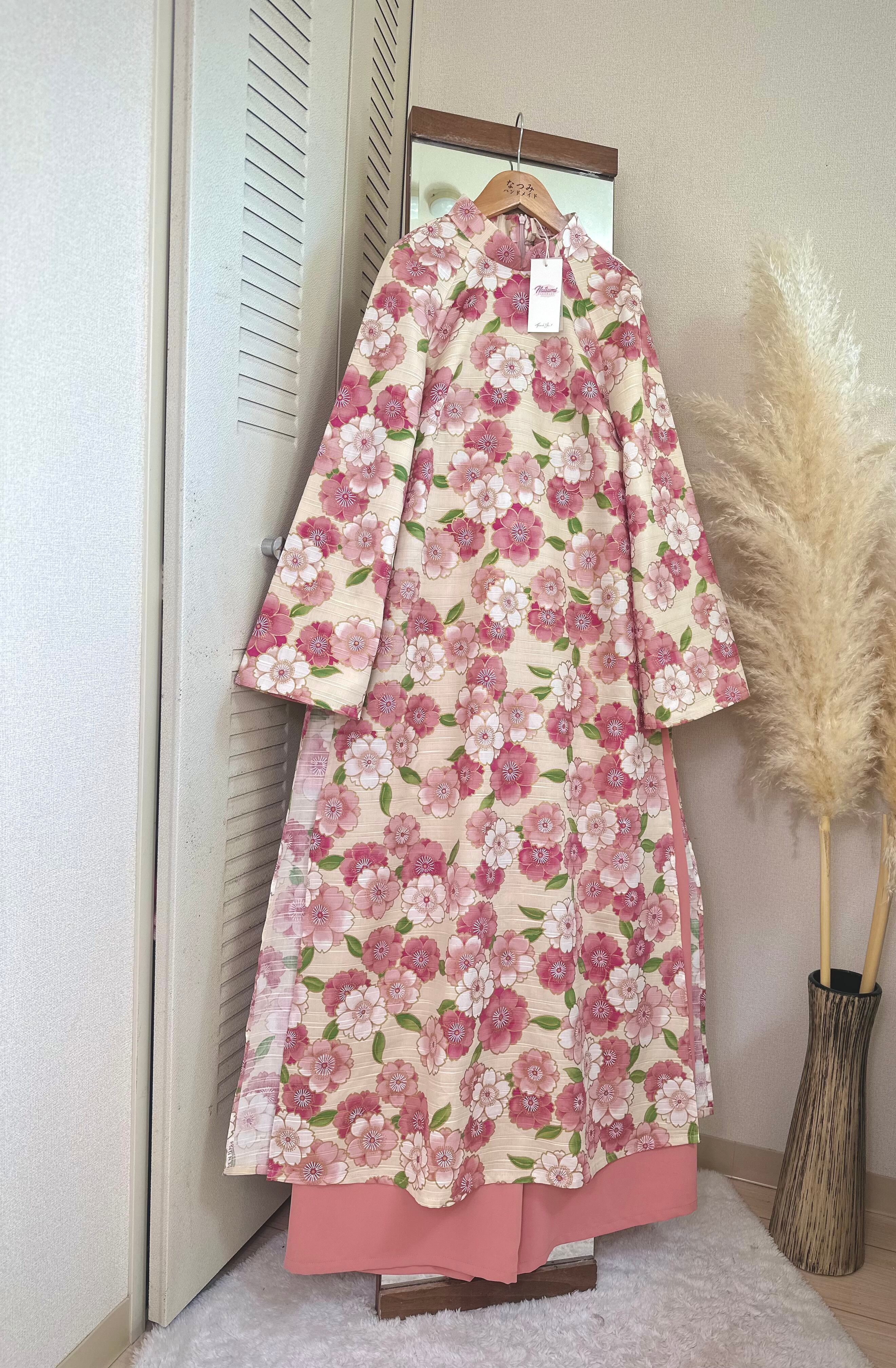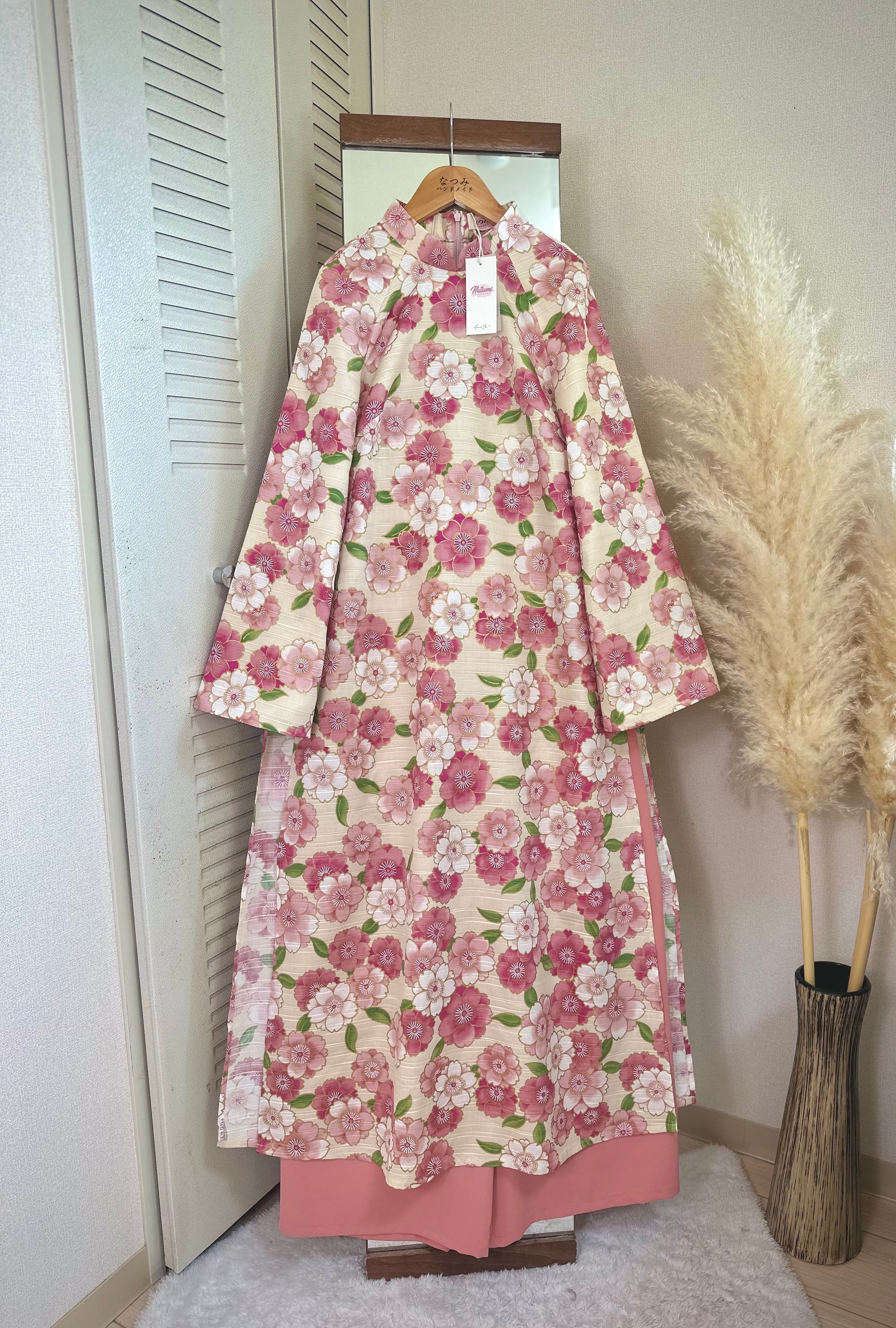 ・アオザイ:アイボリーベース × ピンク花柄