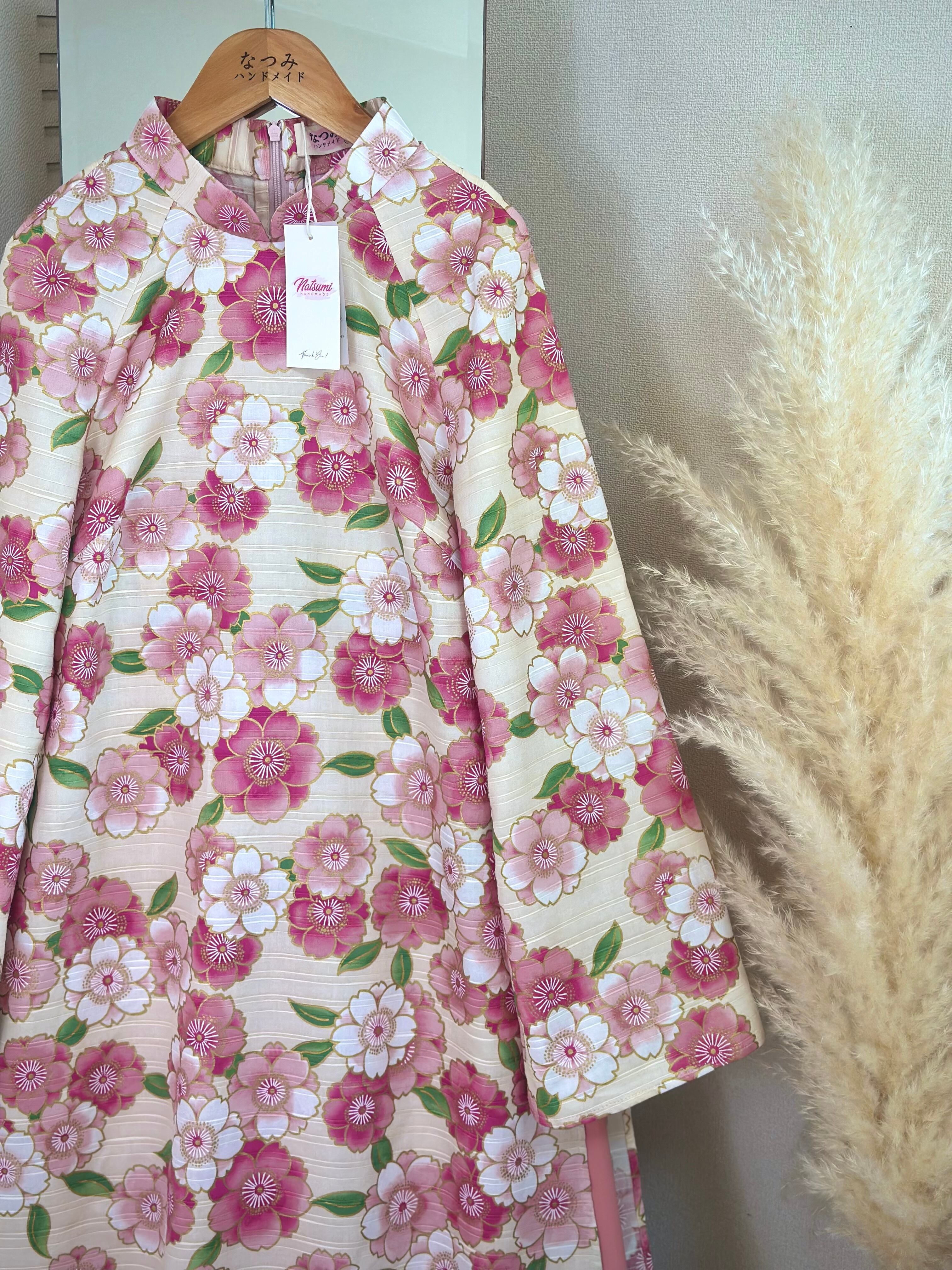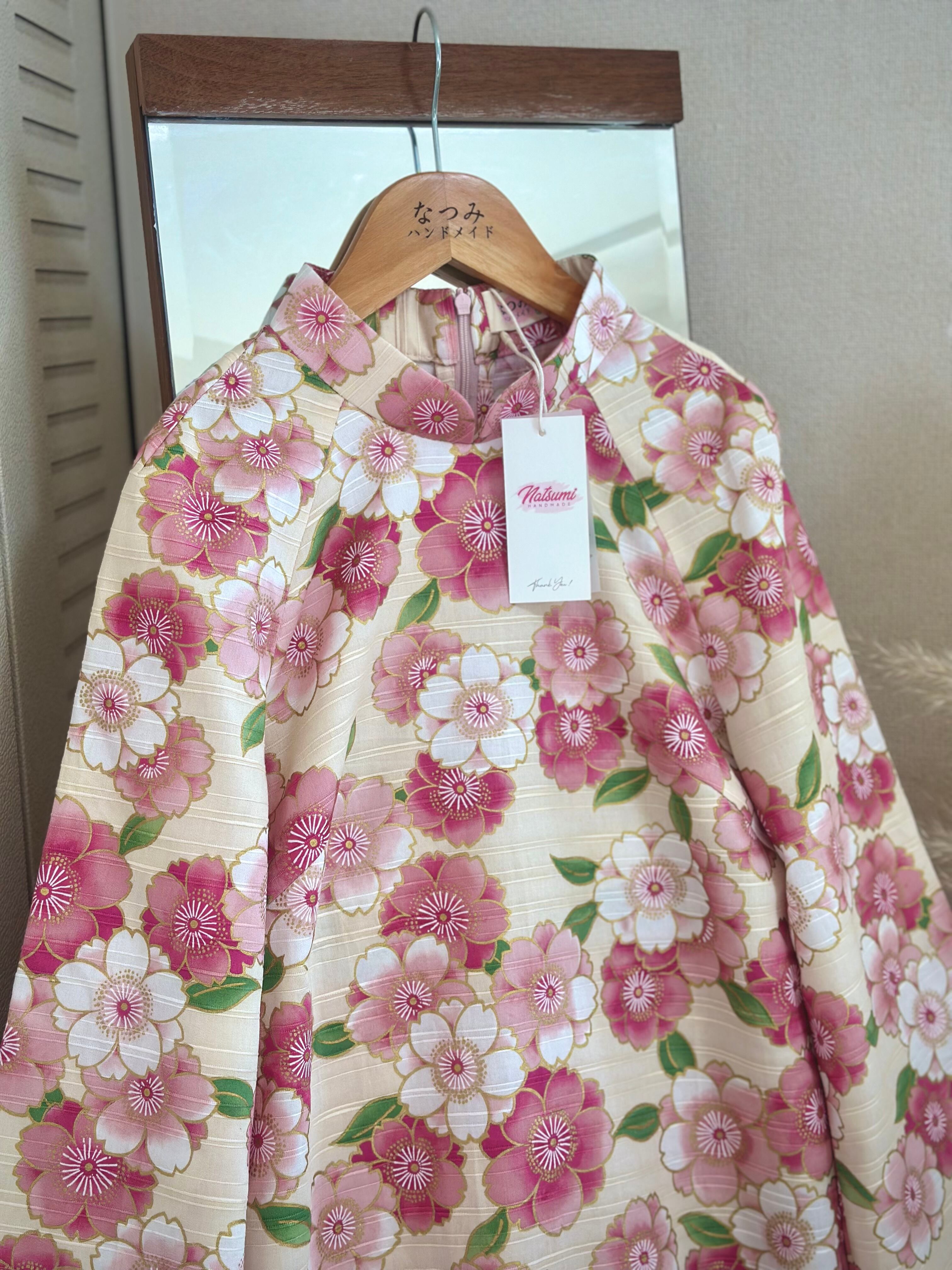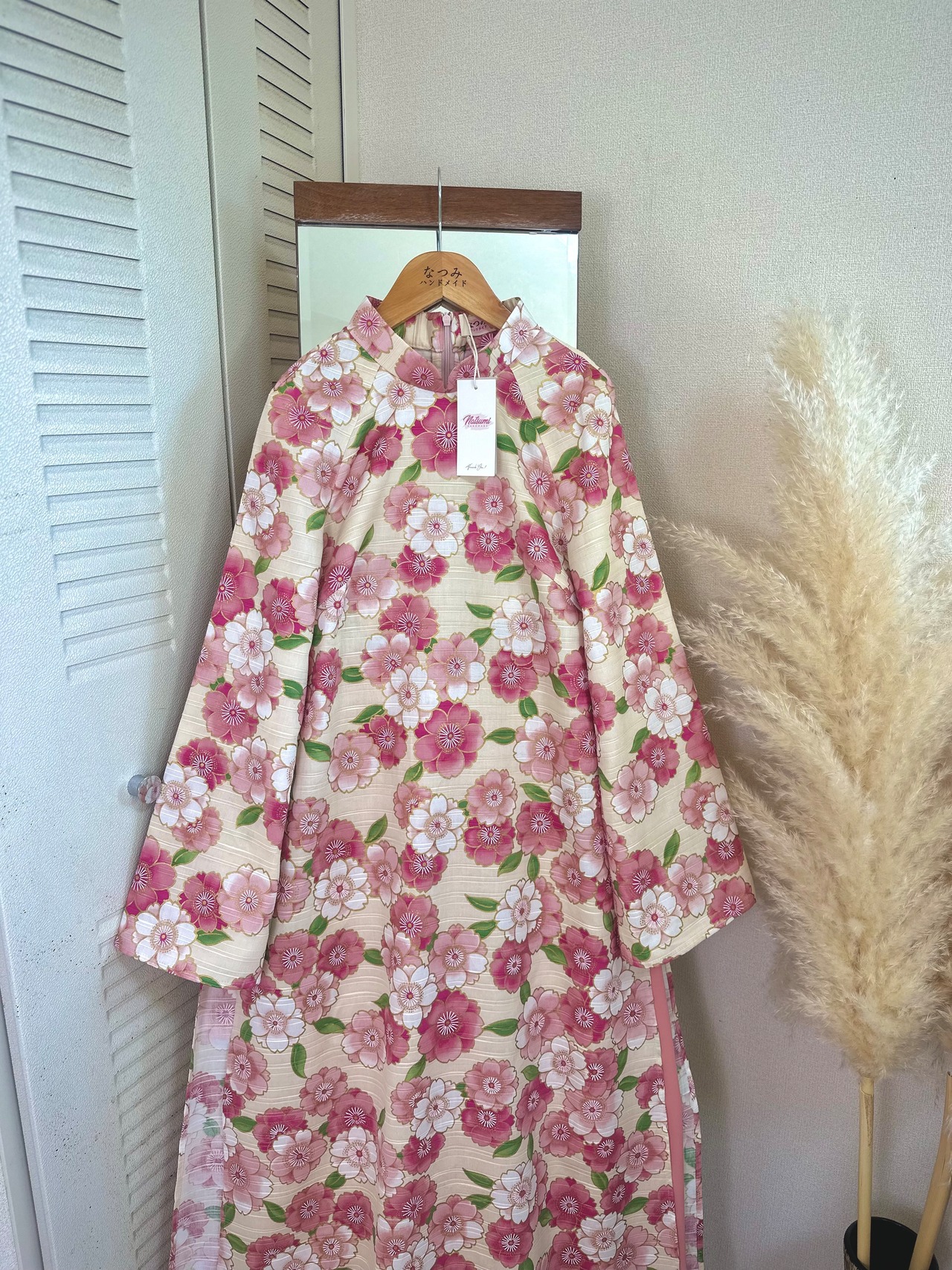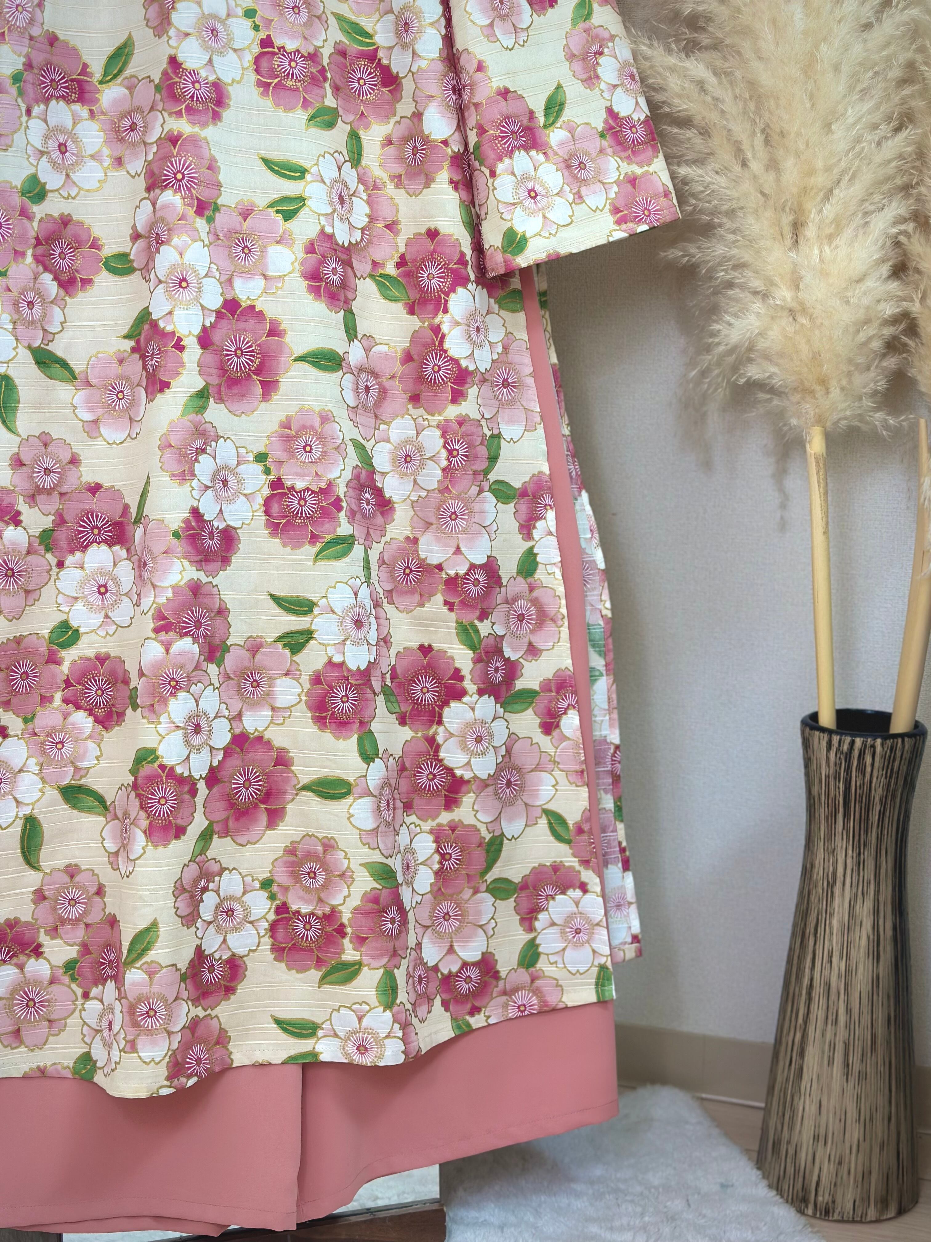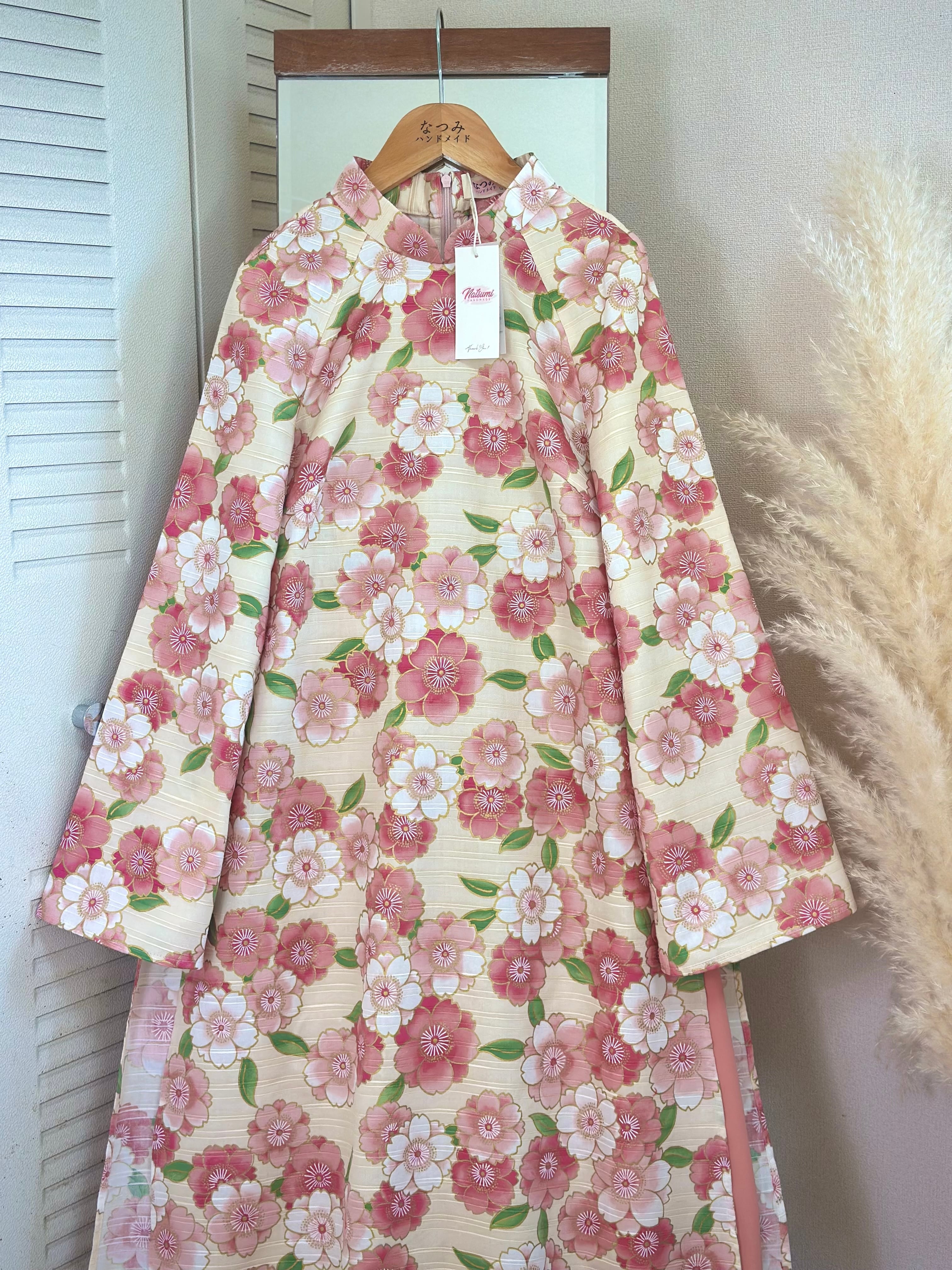 ・アオザイ:アイボリーベース × ピンク花柄