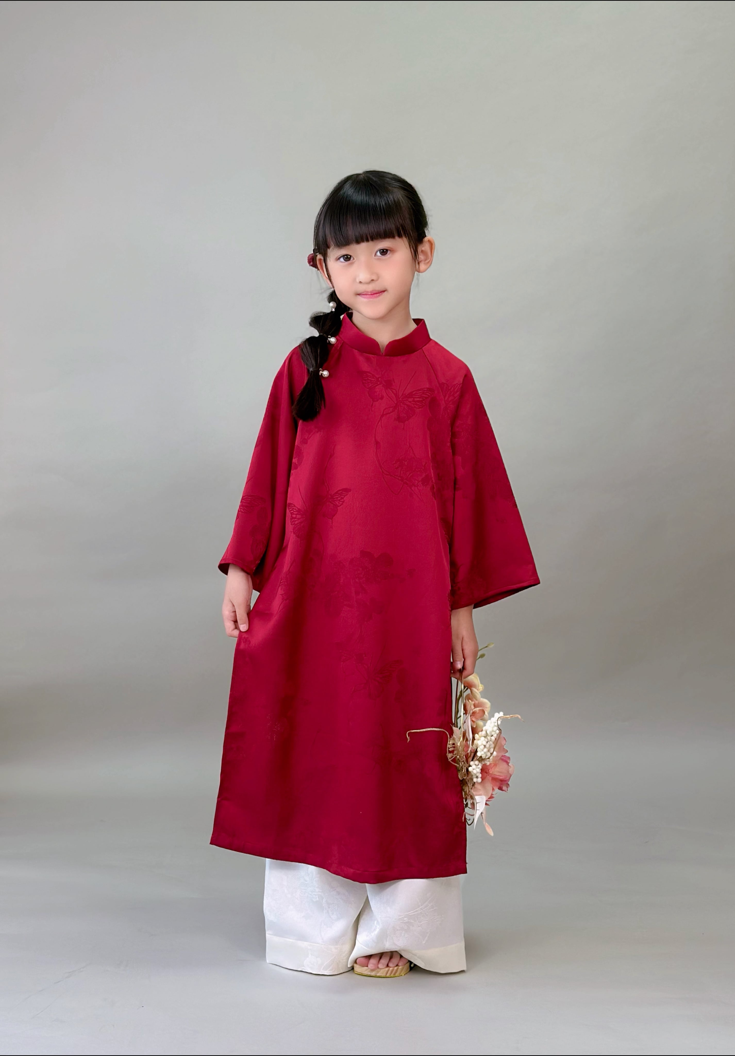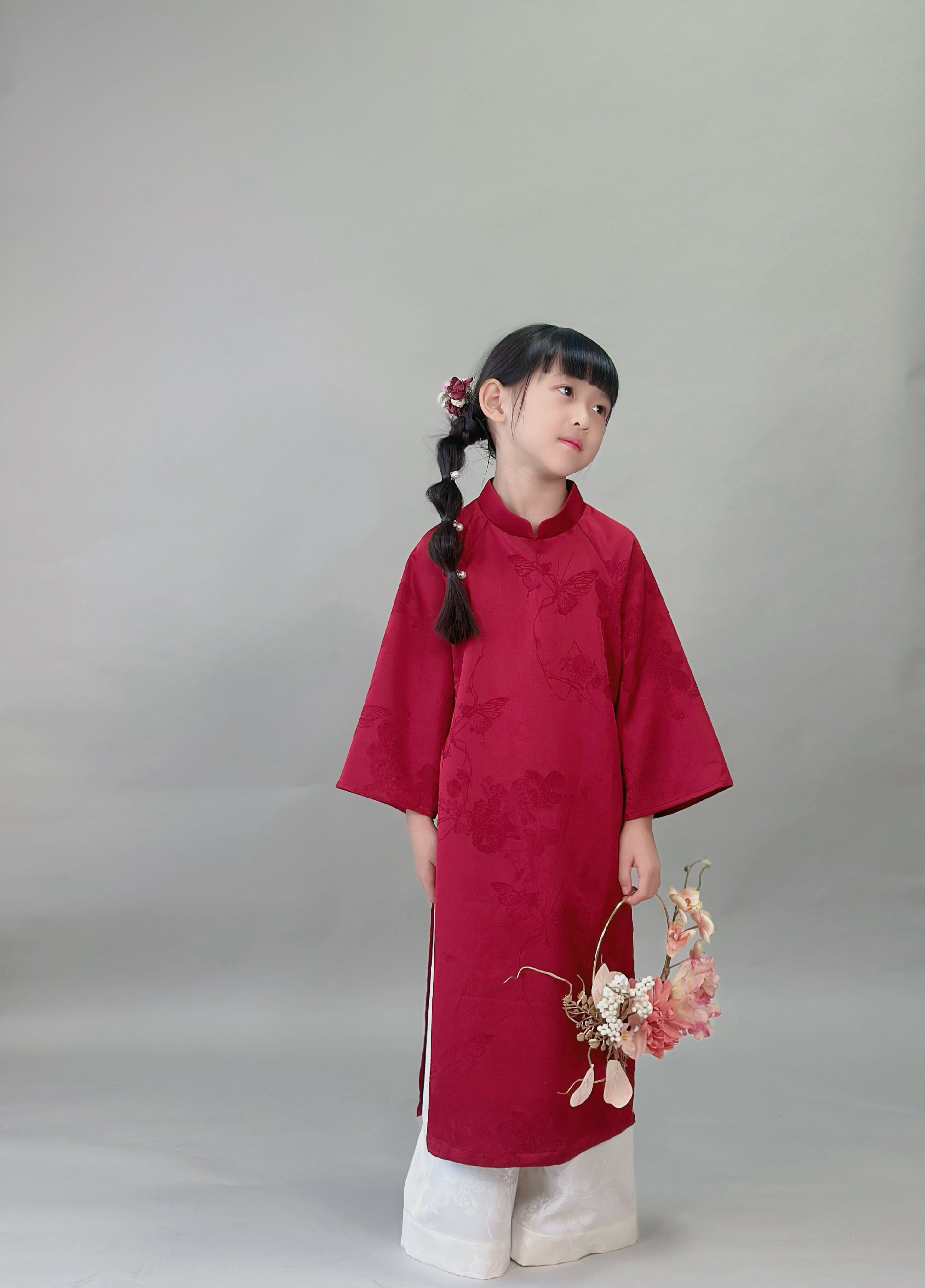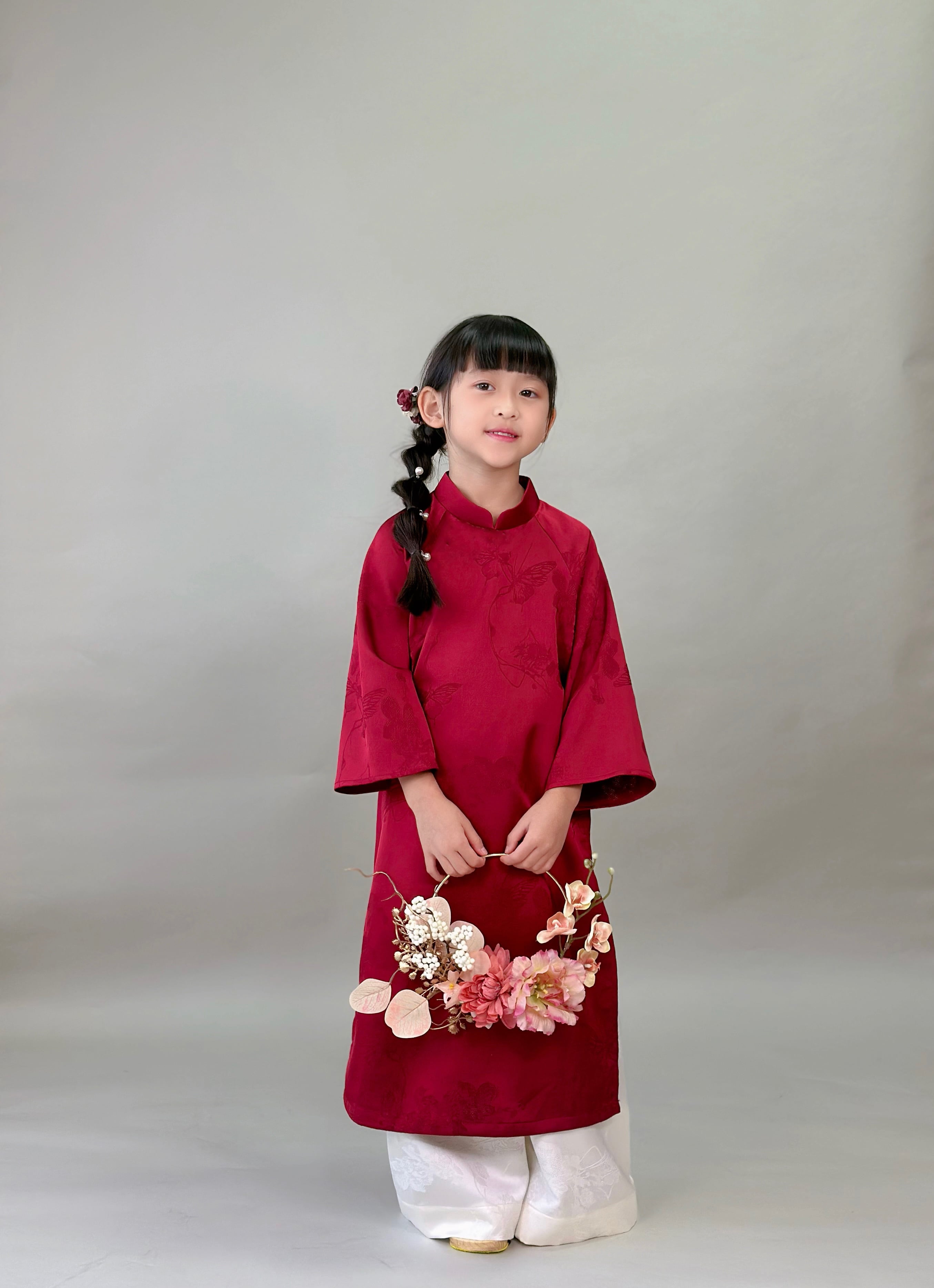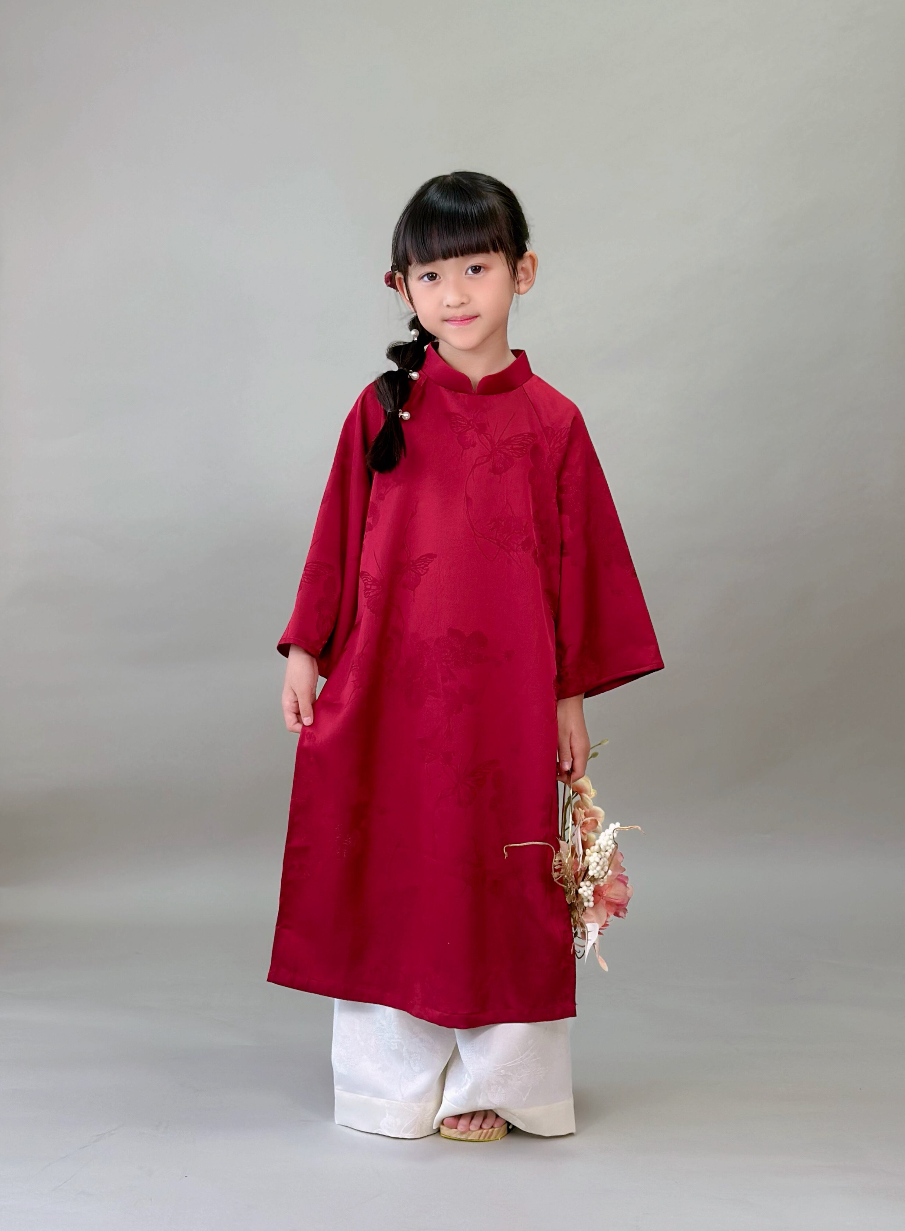 No.T2645|ハンドメイド 女の子アオザイシルク・花と蝶の織り柄