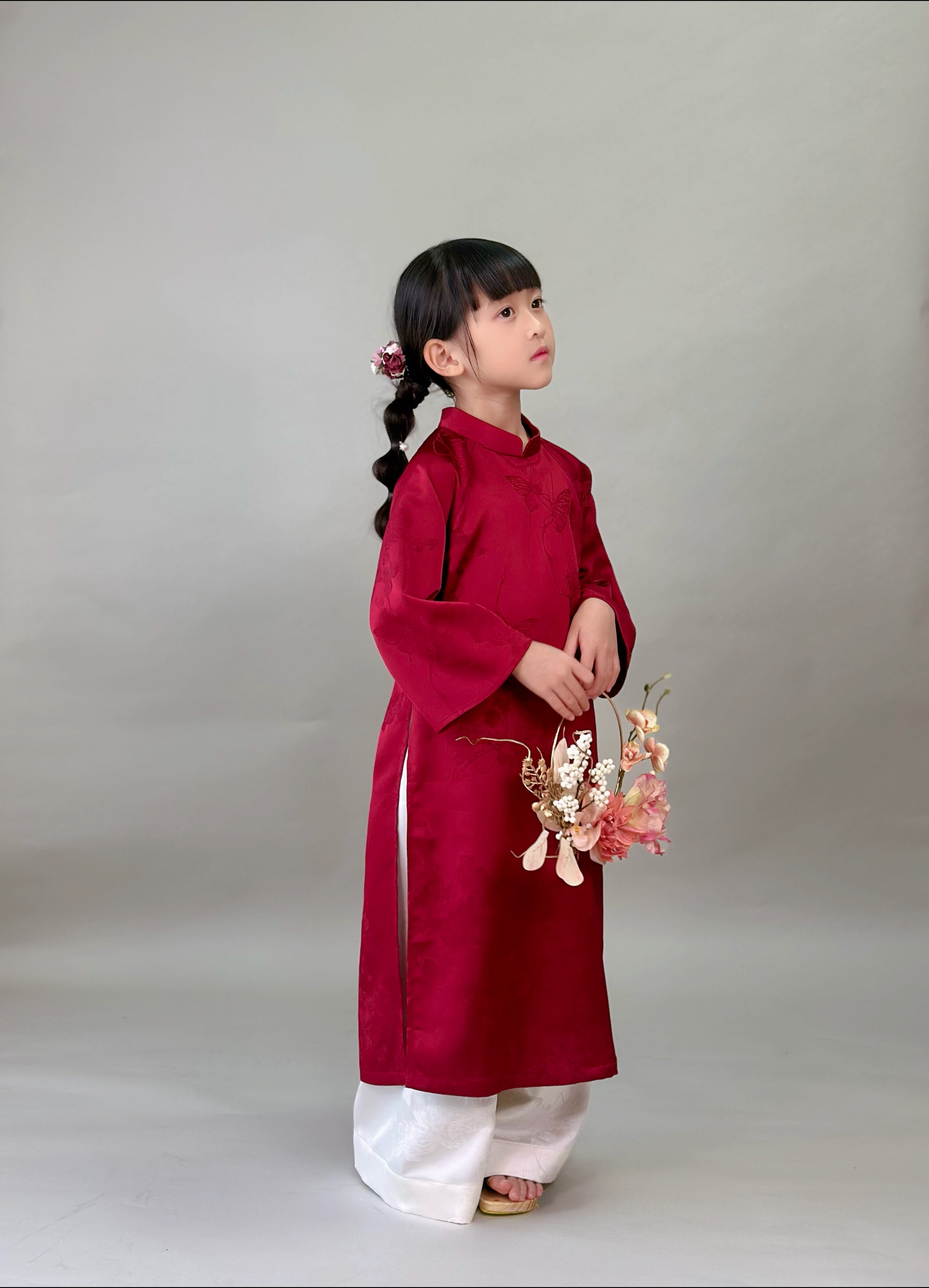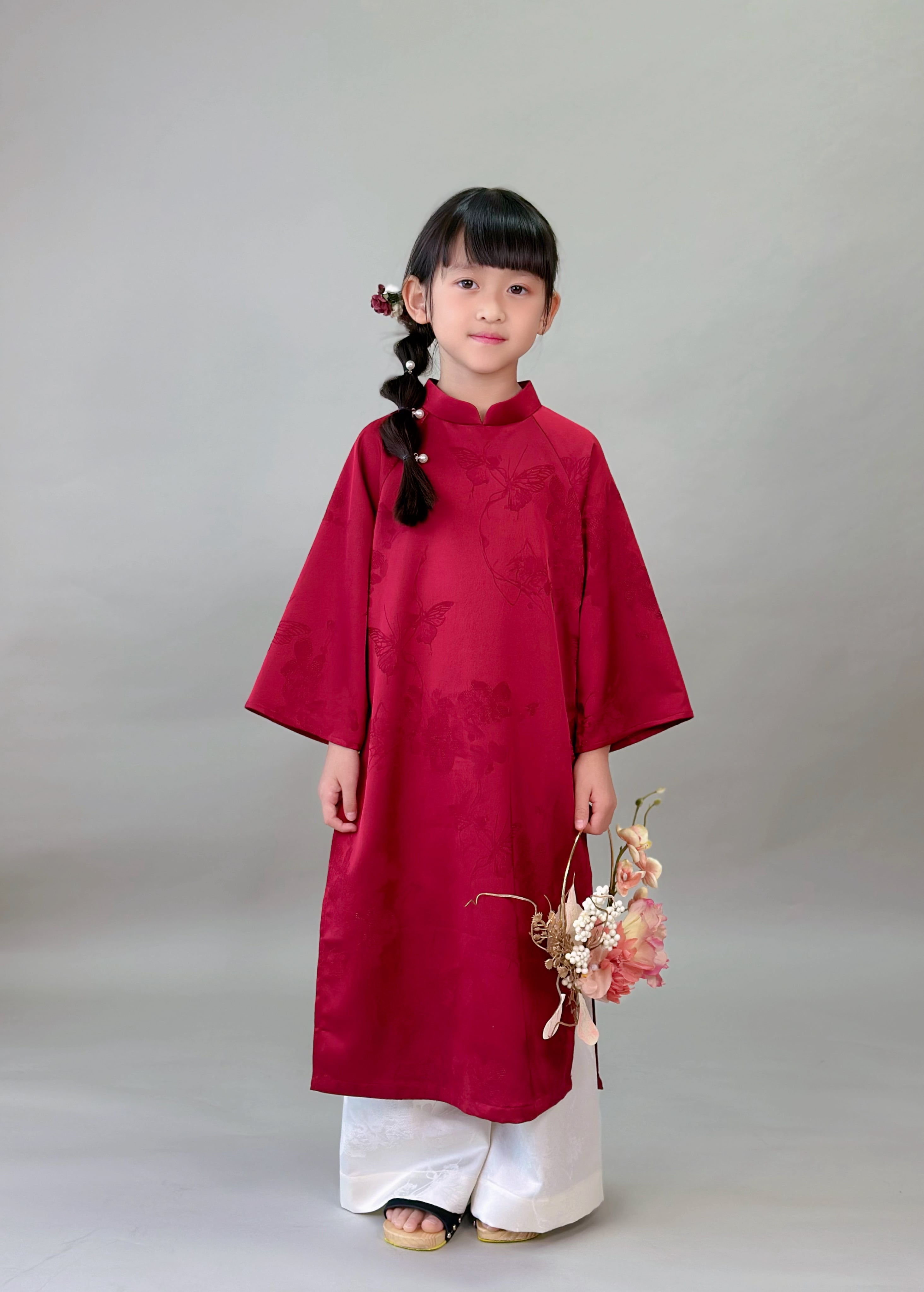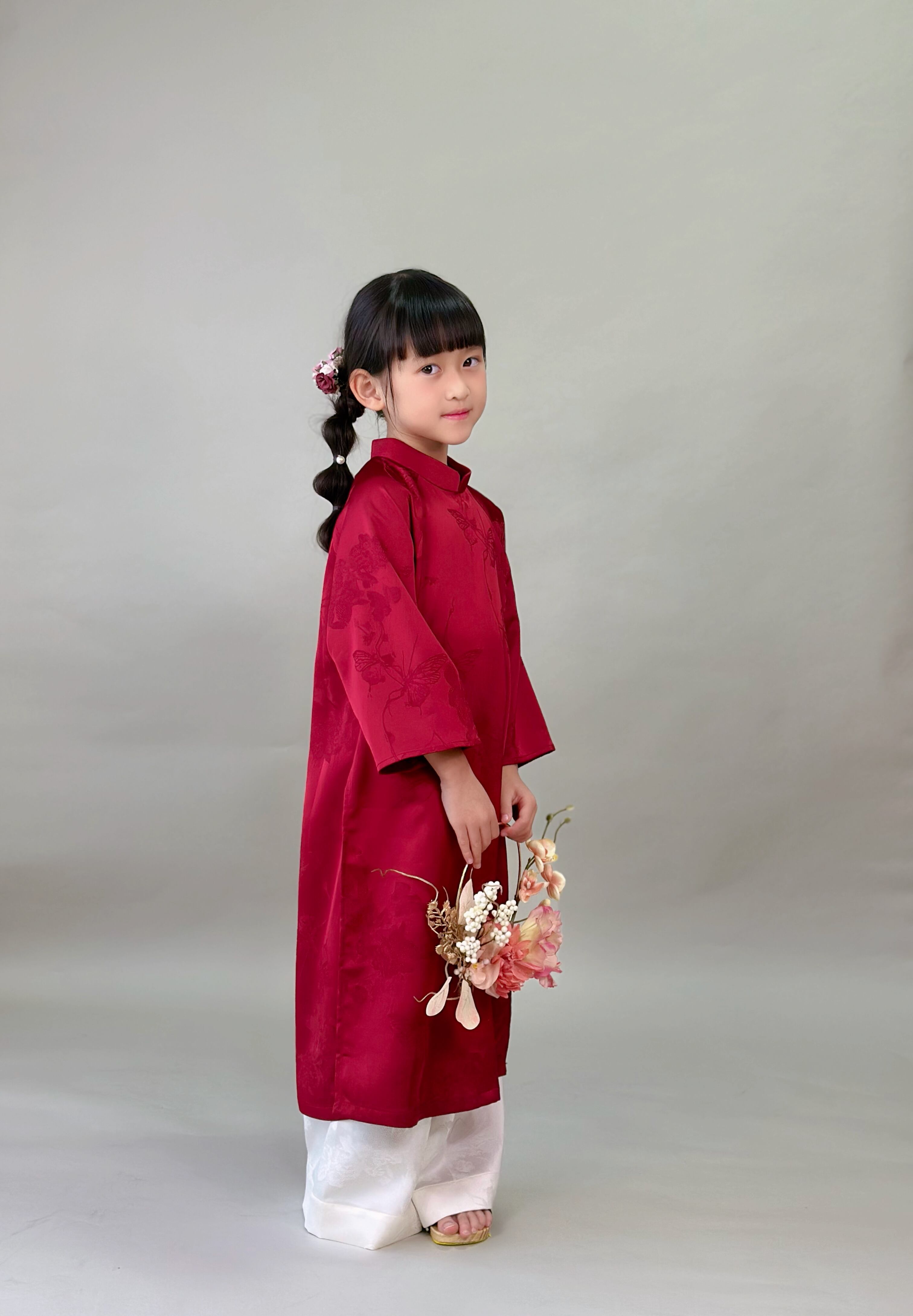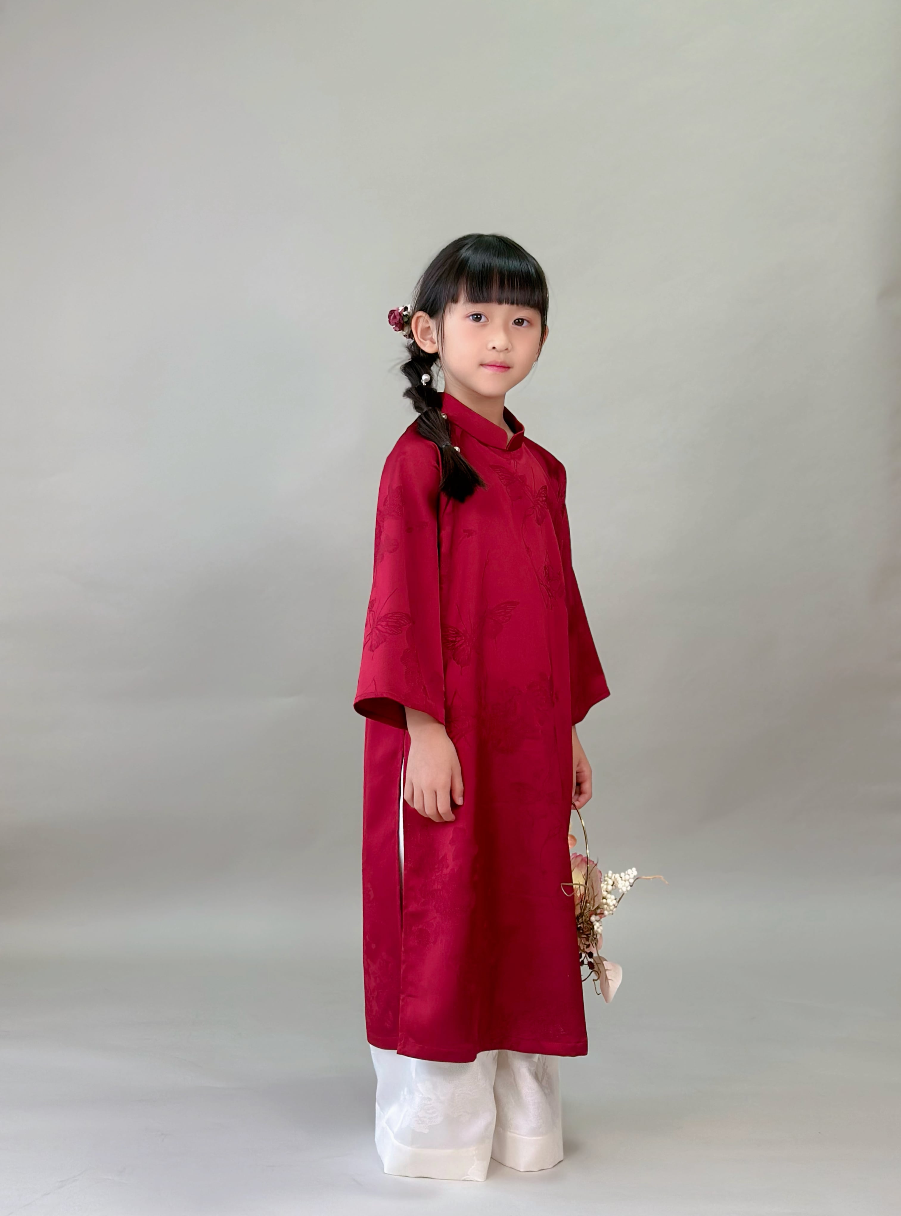 No.T2645|ハンドメイド 女の子アオザイシルク・花と蝶の織り柄