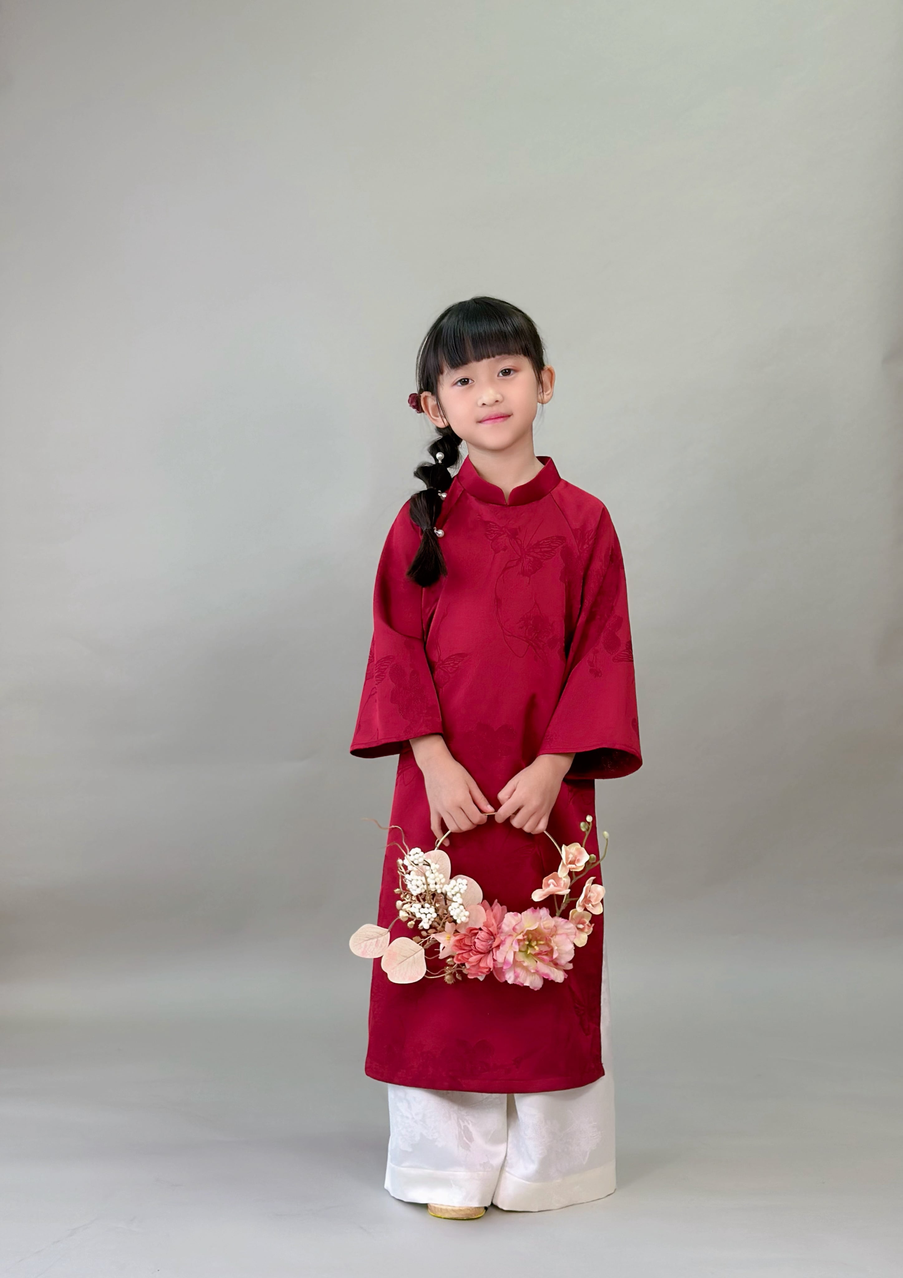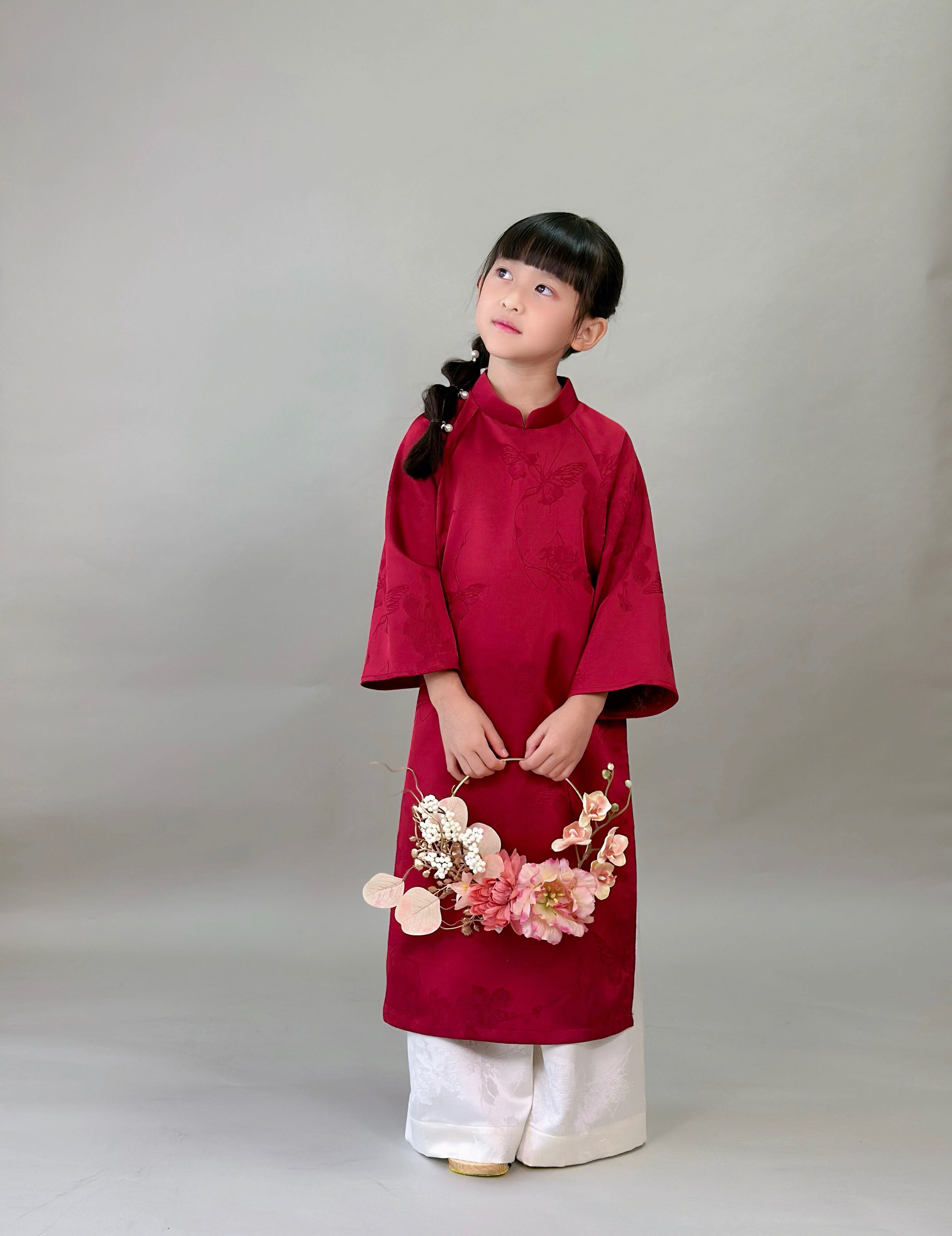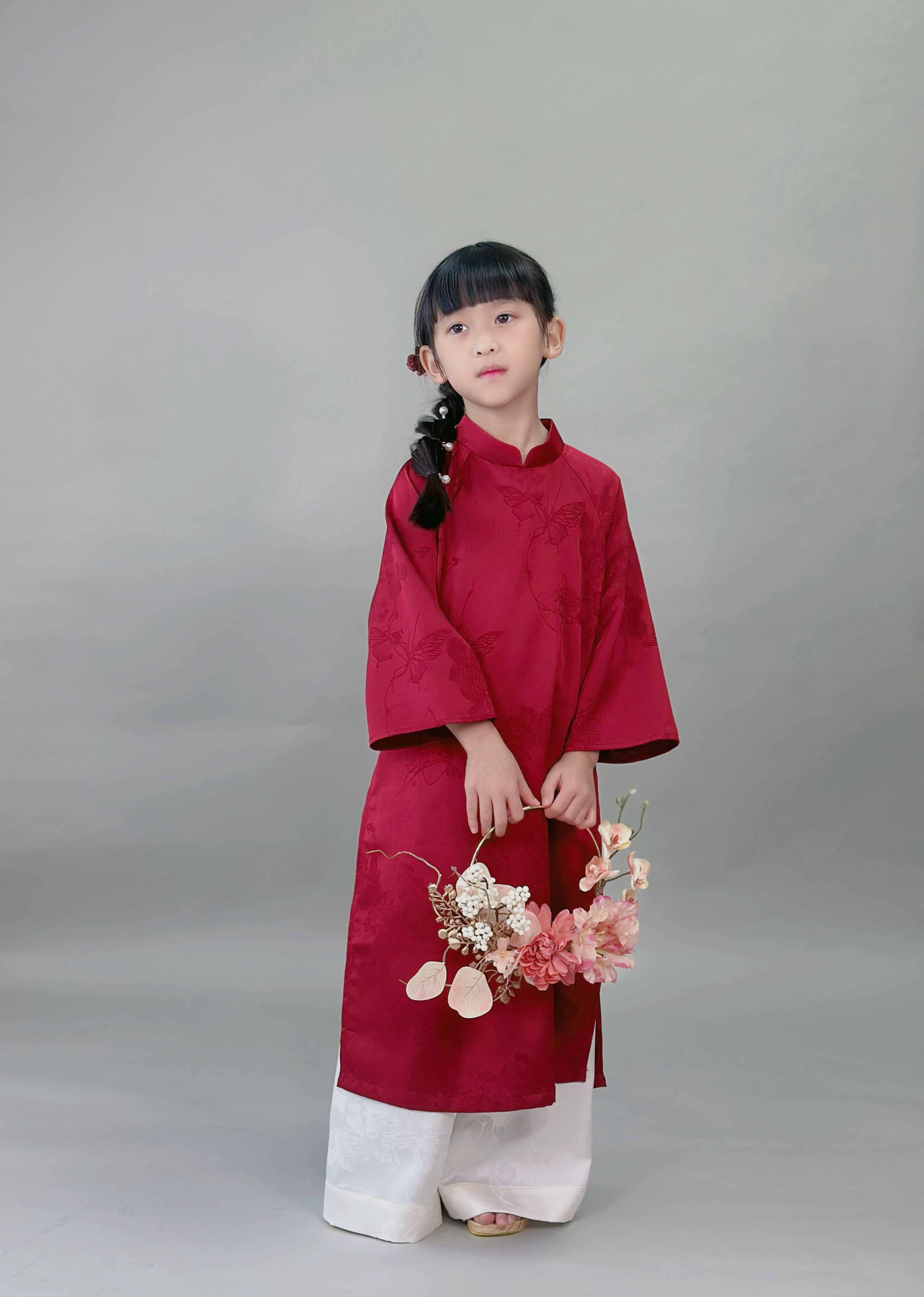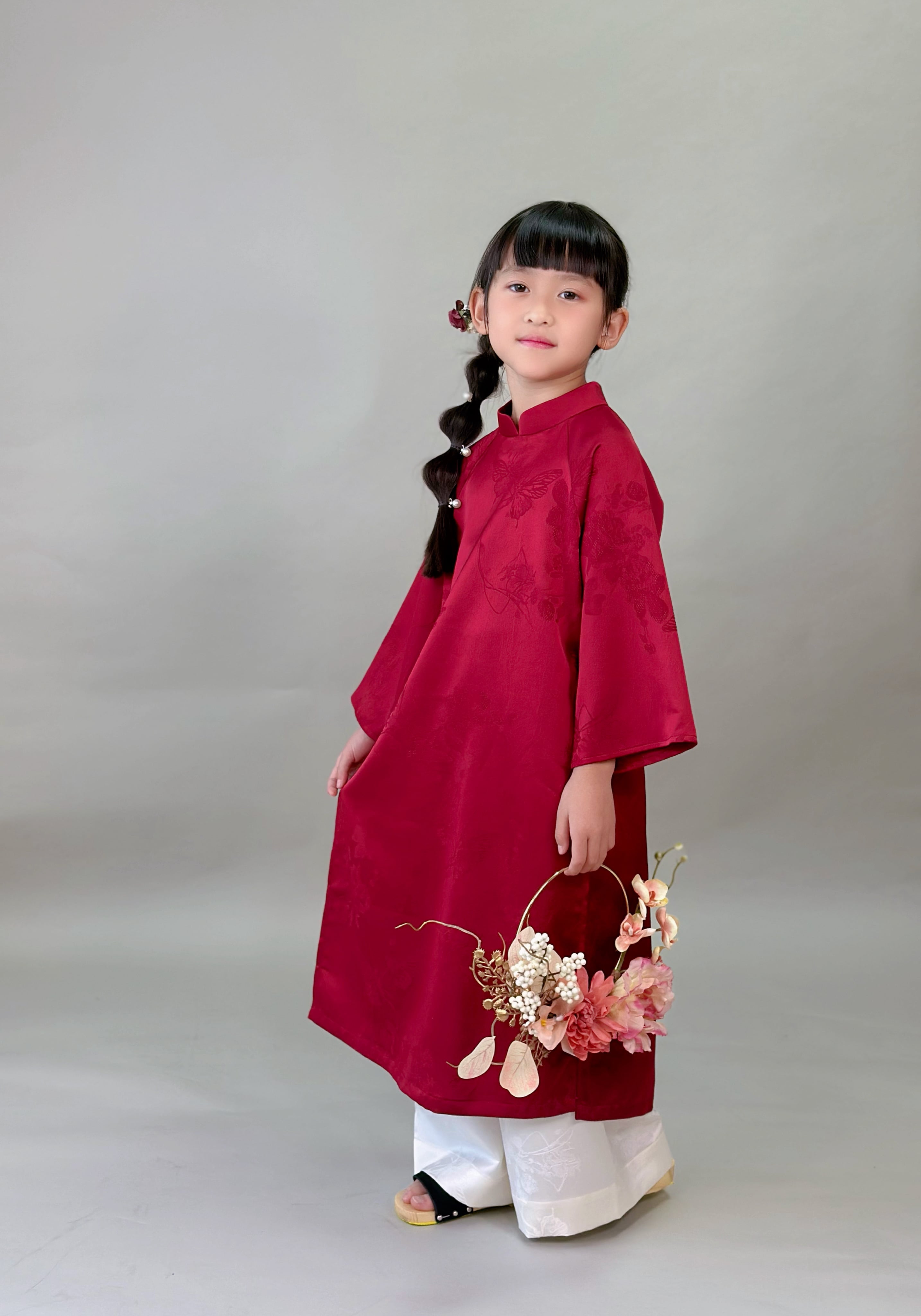 No.T2645|ハンドメイド 女の子アオザイシルク・花と蝶の織り柄
