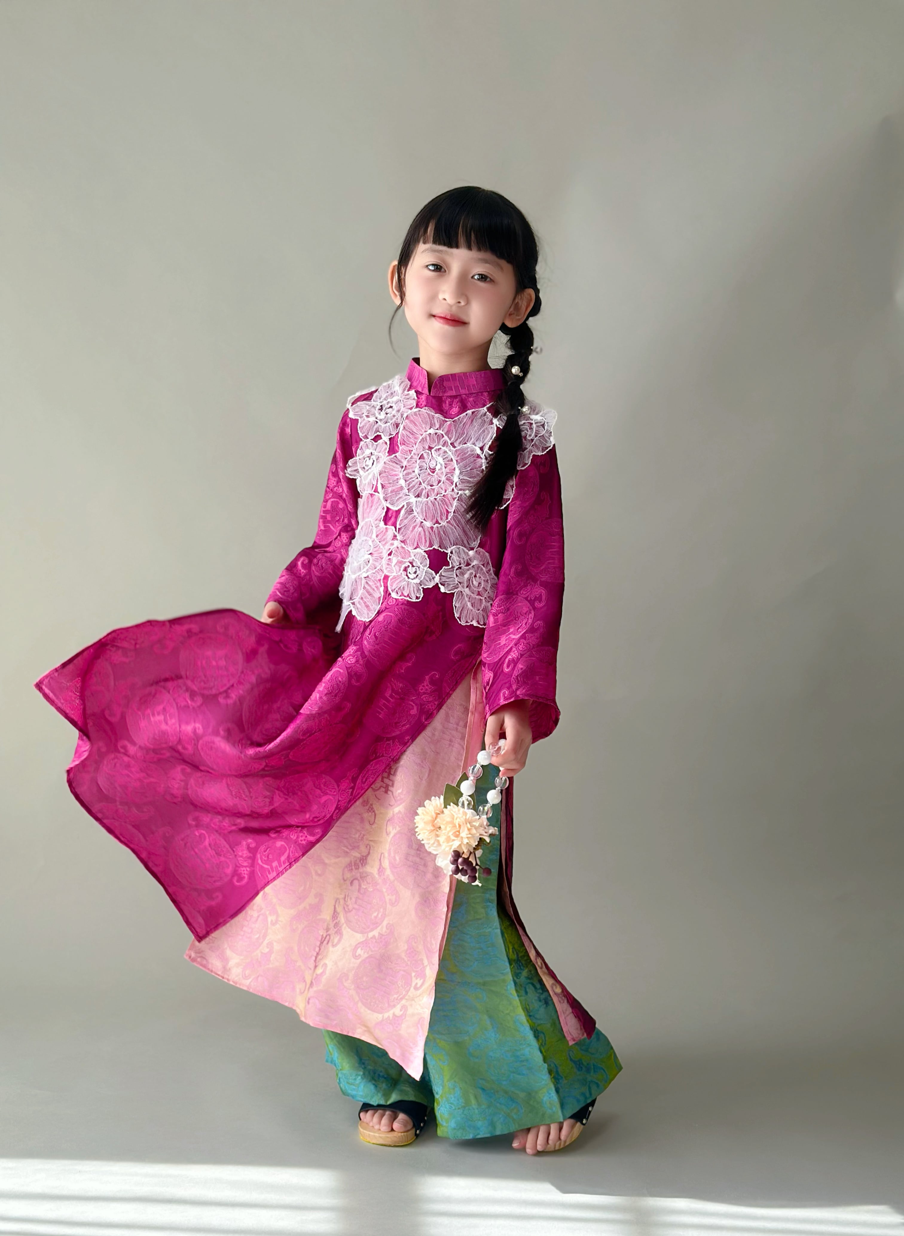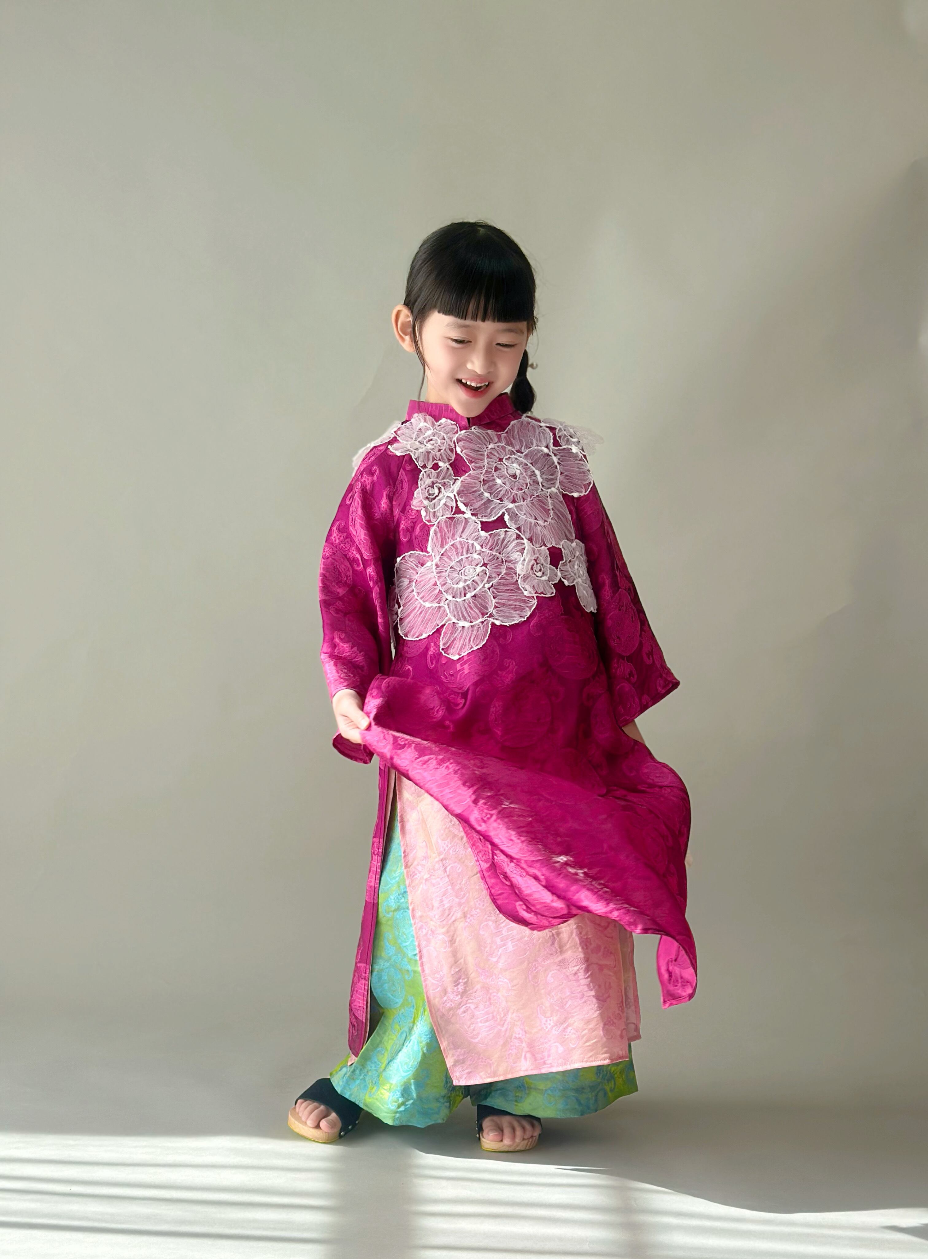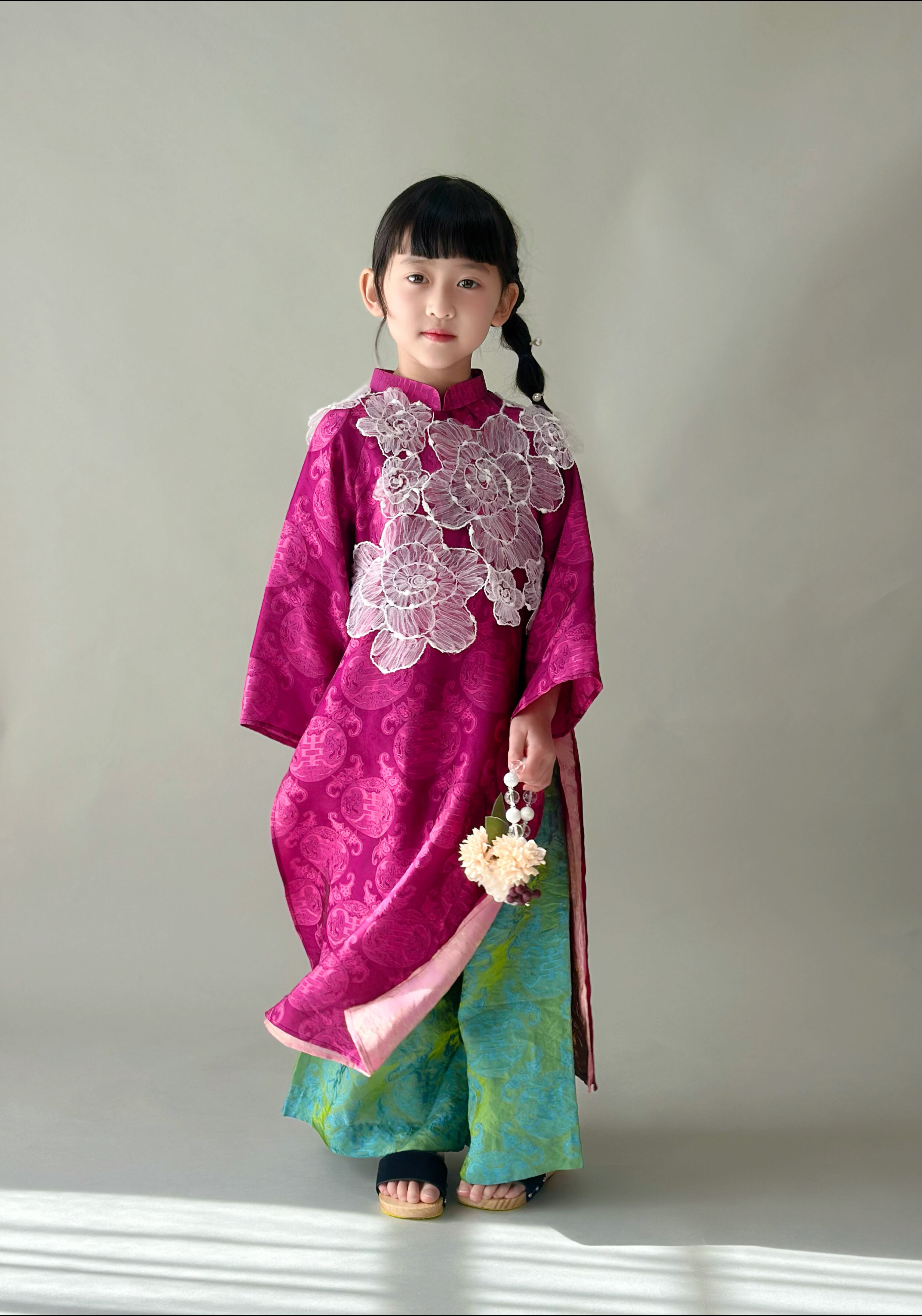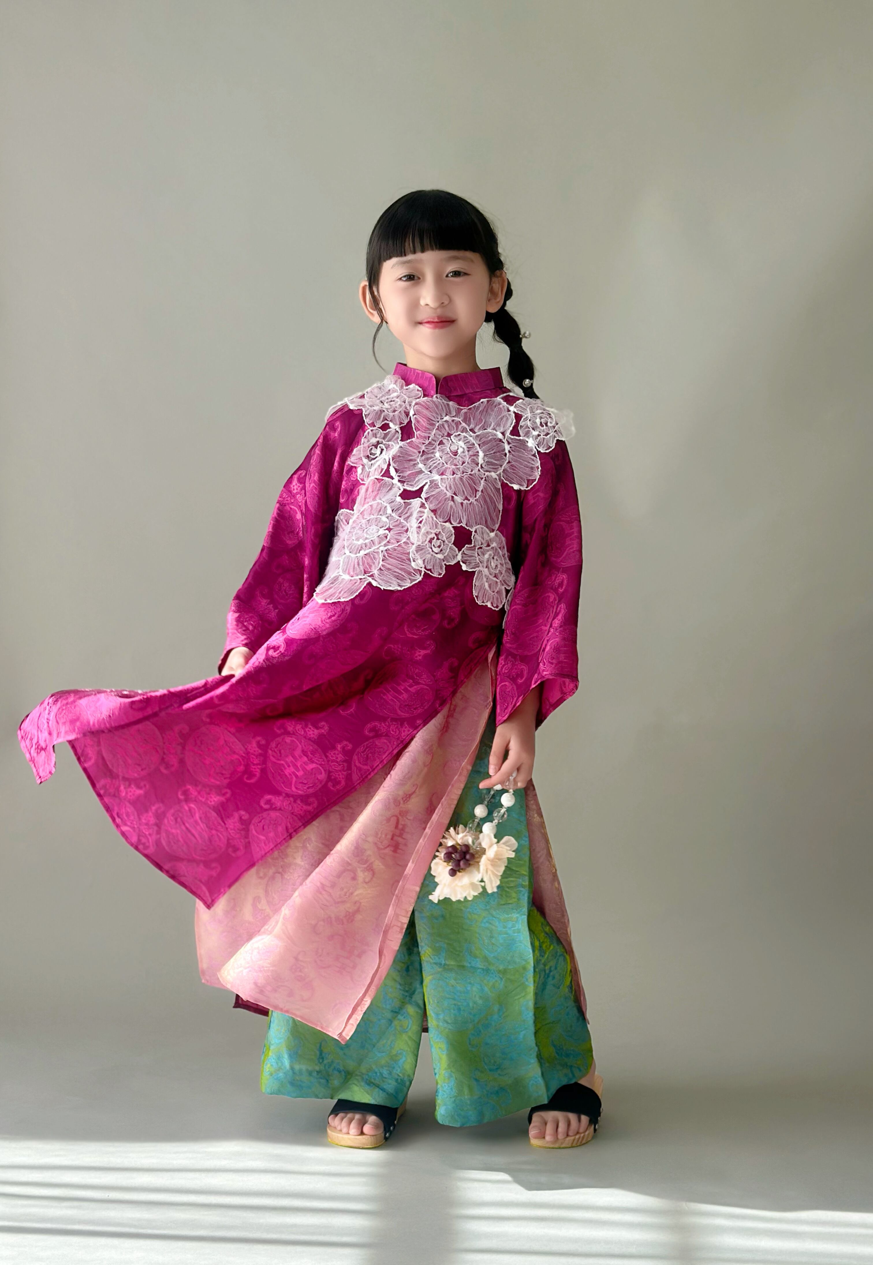 No.T2652|ハンドメイド 子供用アオザイセット シルク レース花モチーフ手縫い
