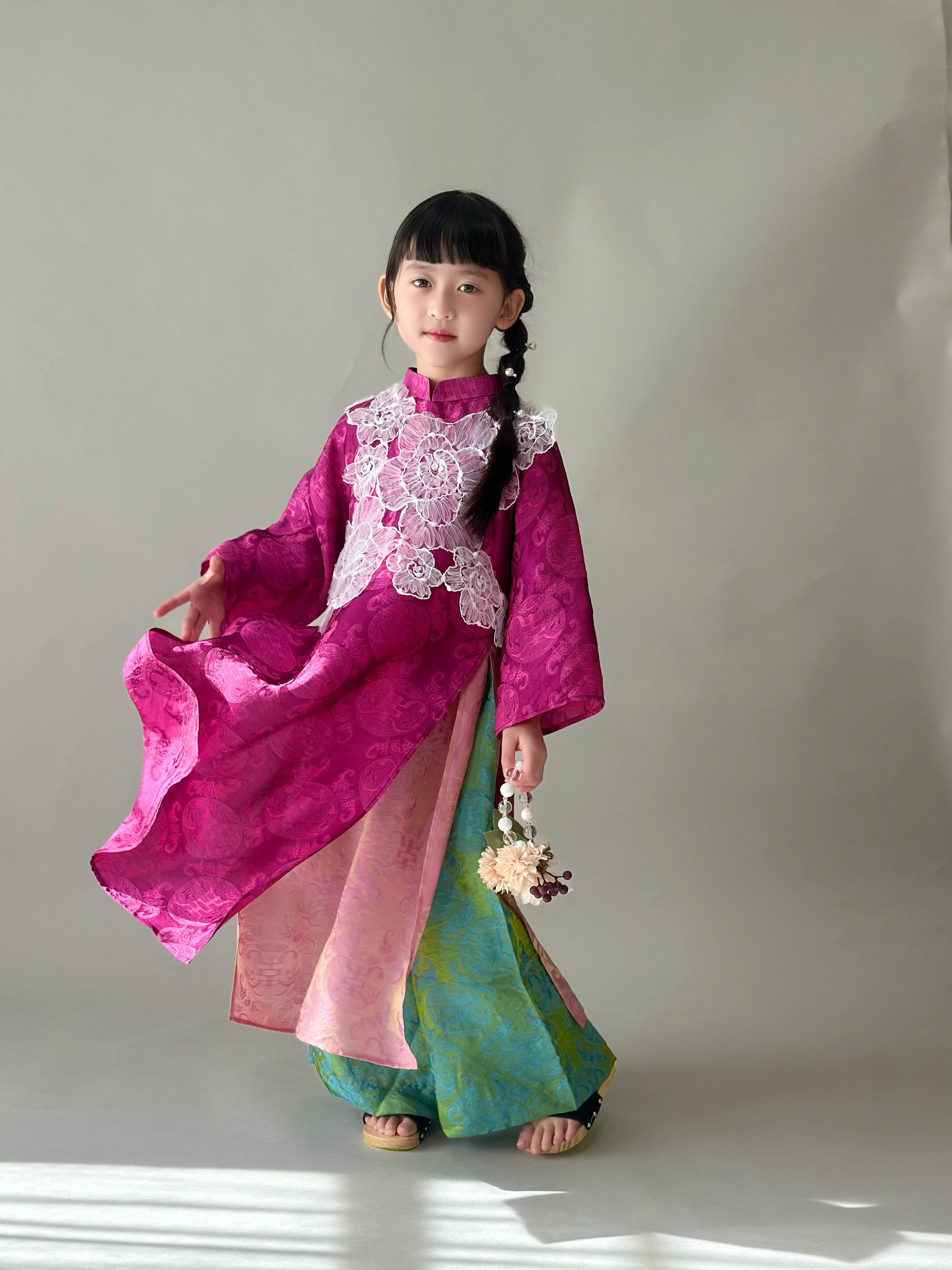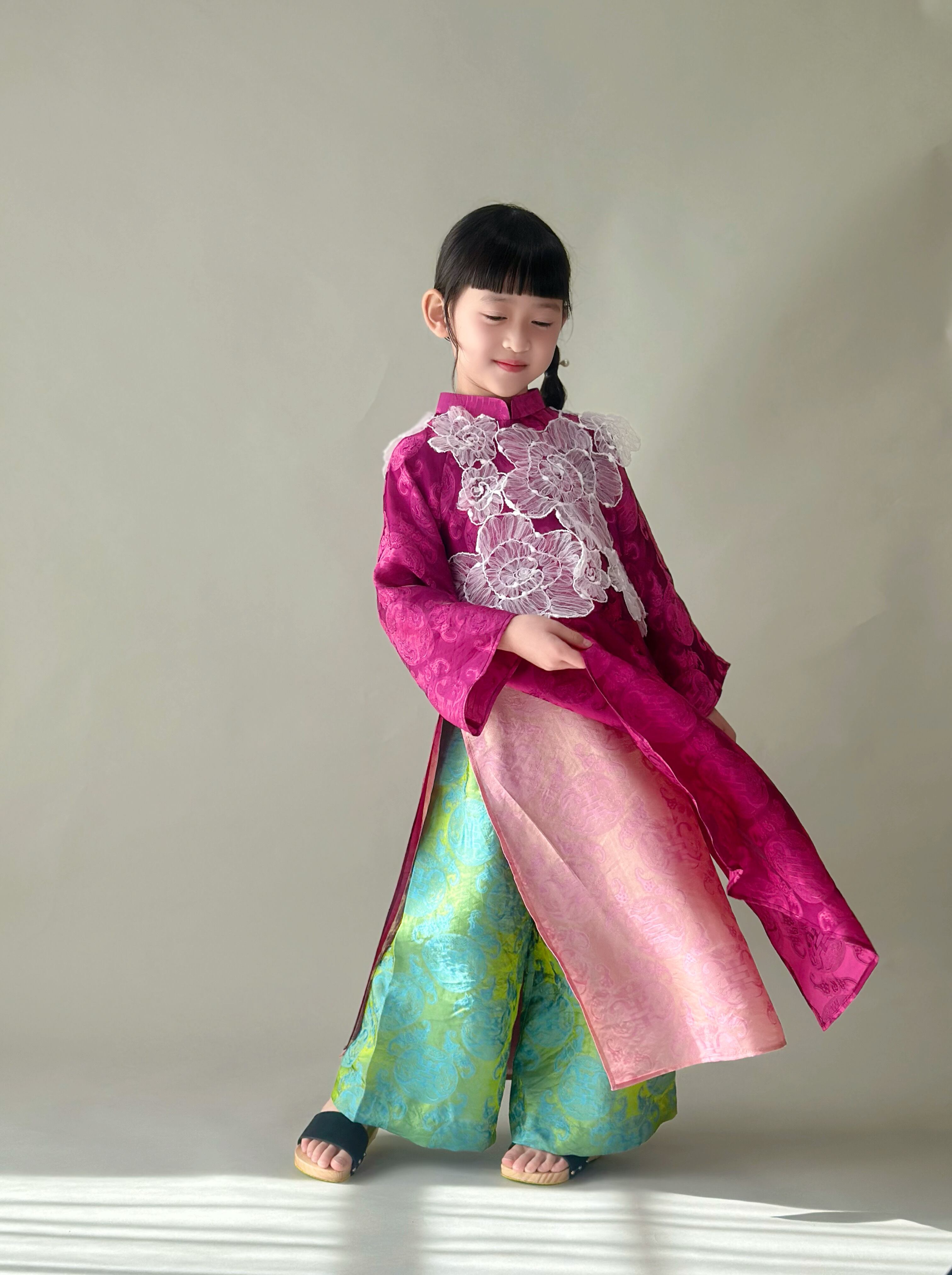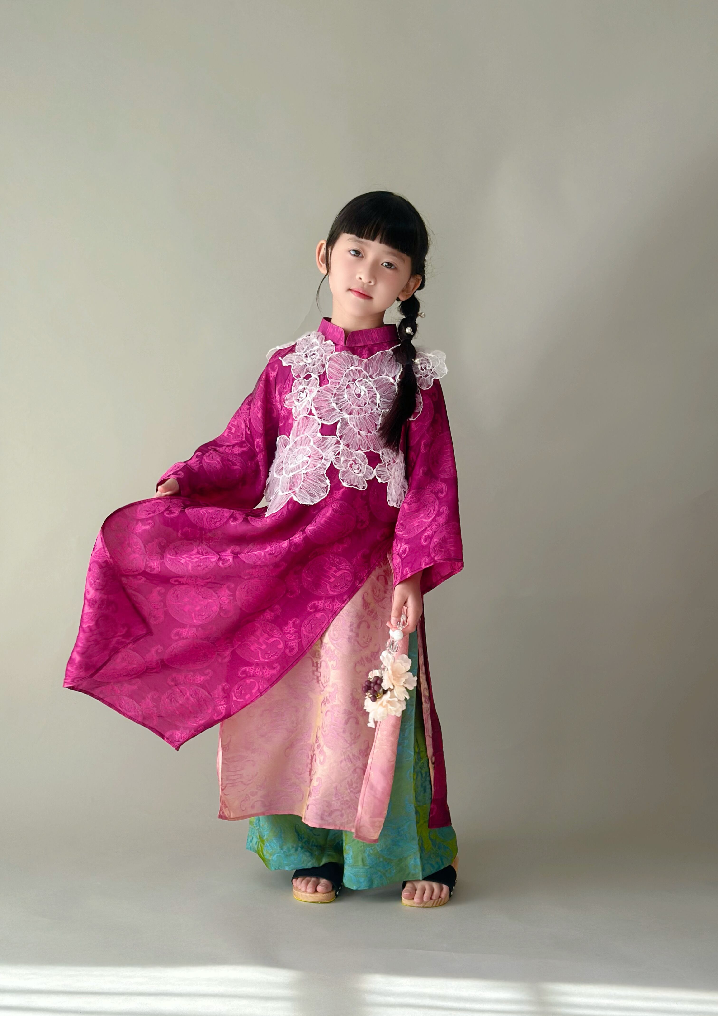 No.T2652|ハンドメイド 子供用アオザイセット シルク レース花モチーフ手縫い