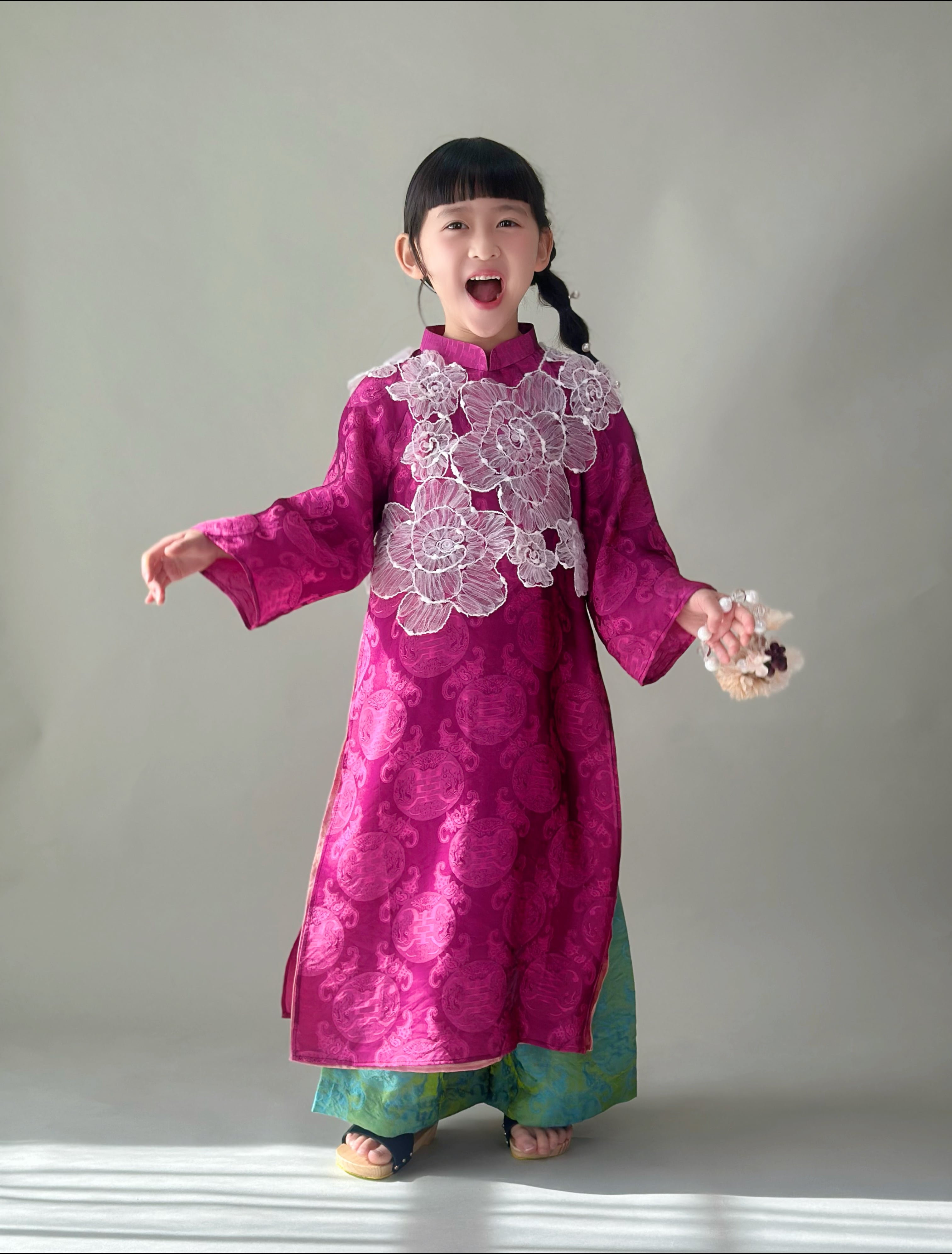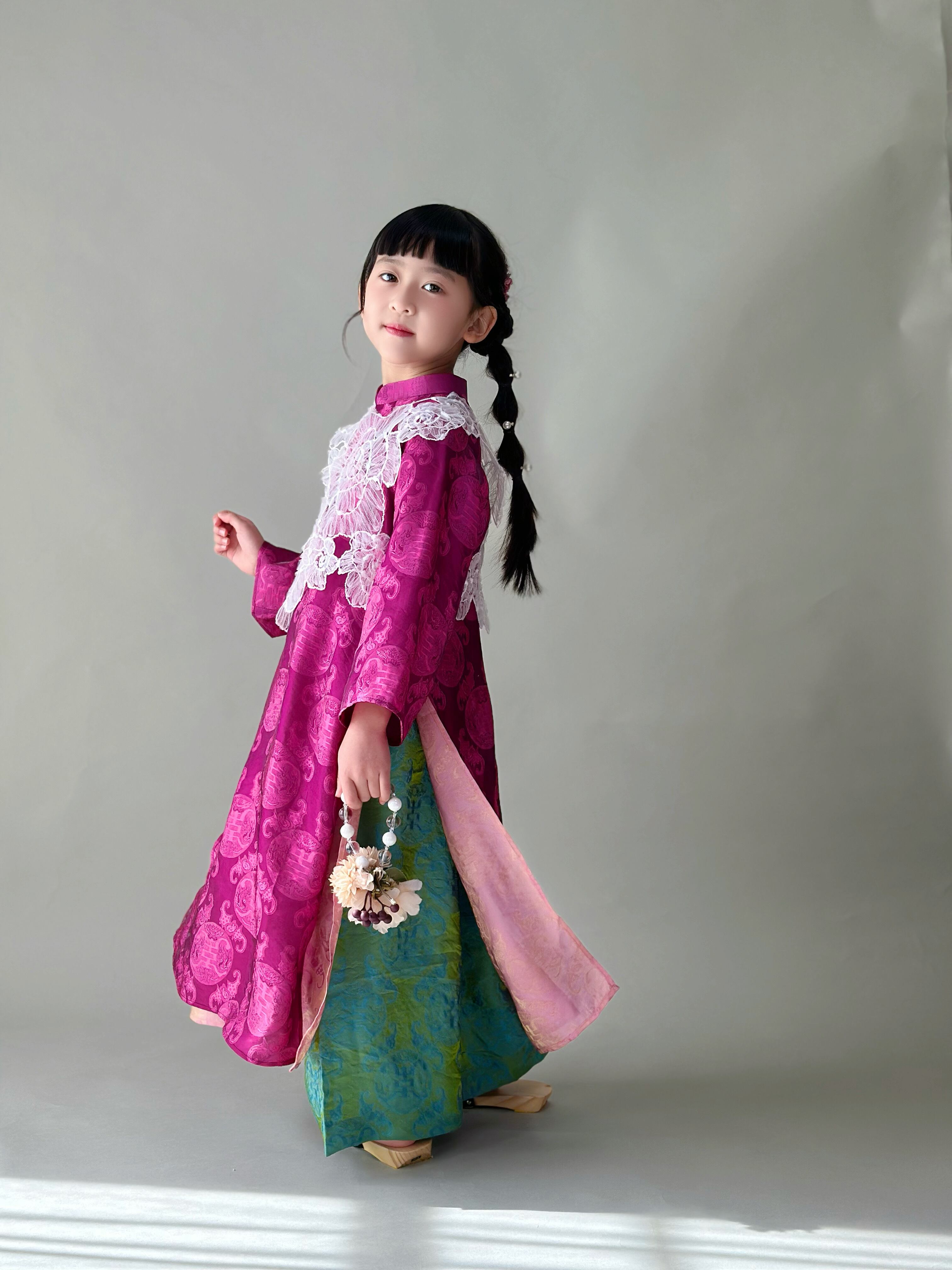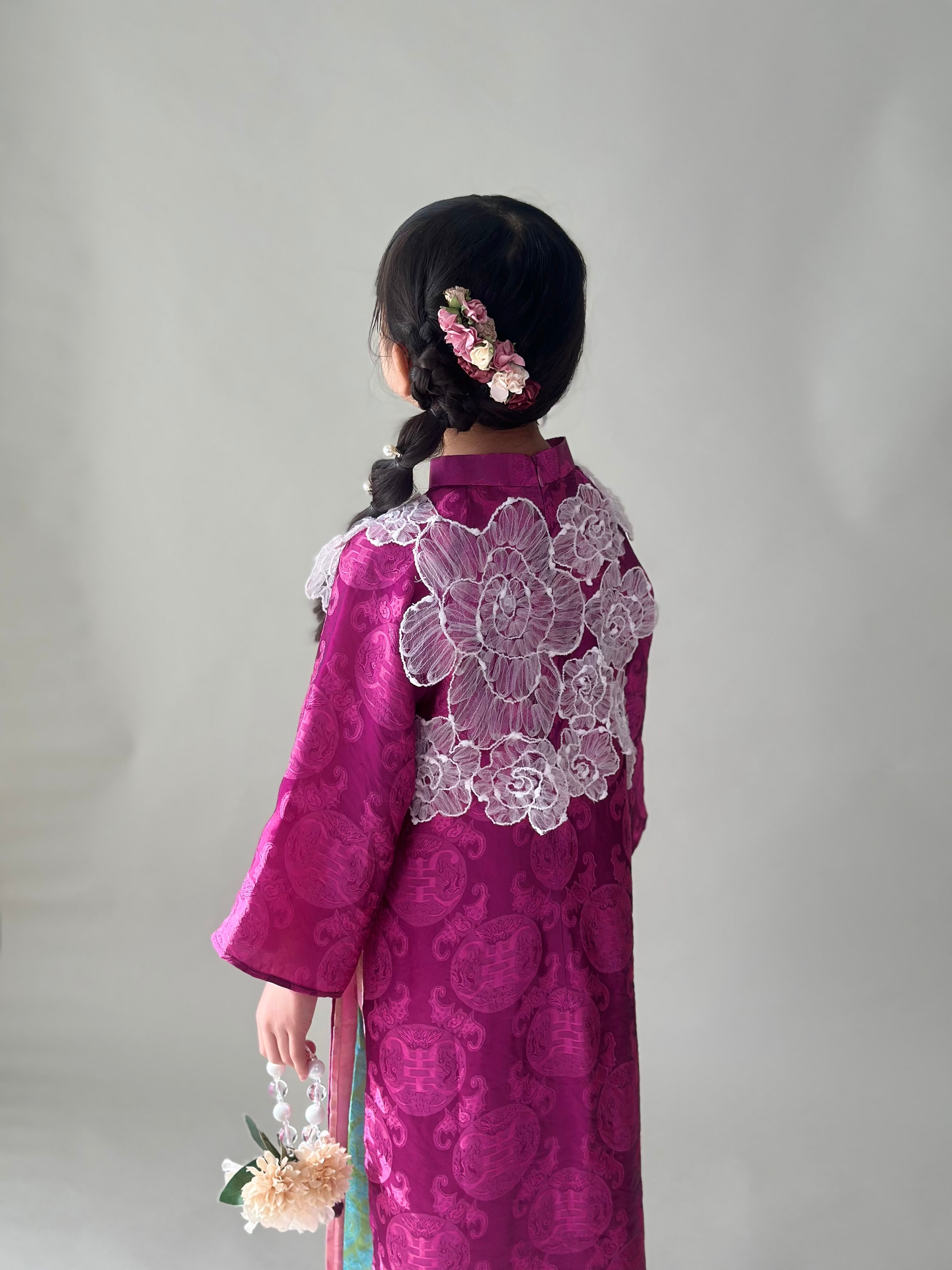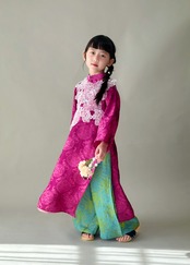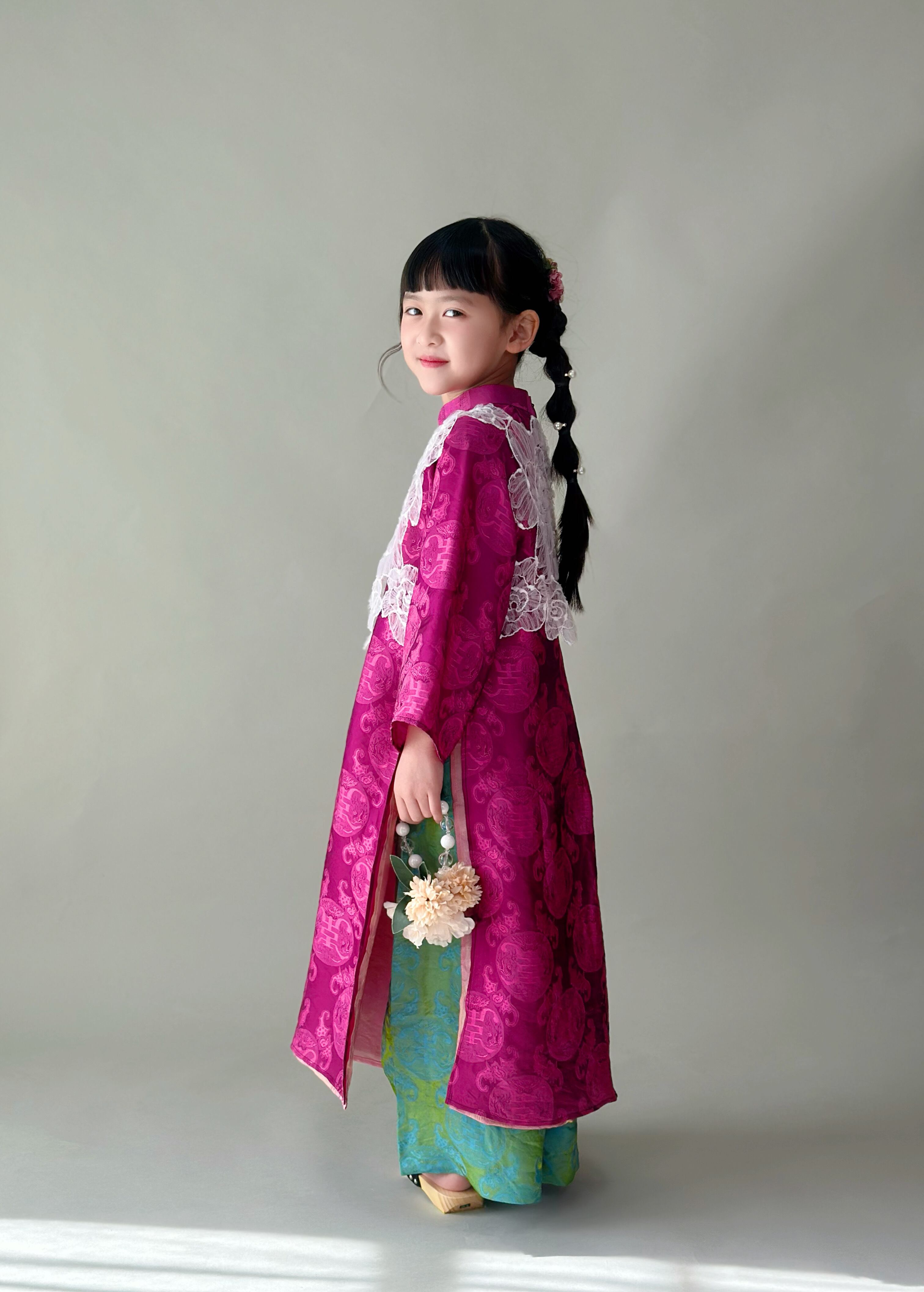 No.T2652|ハンドメイド 子供用アオザイセット シルク レース花モチーフ手縫い