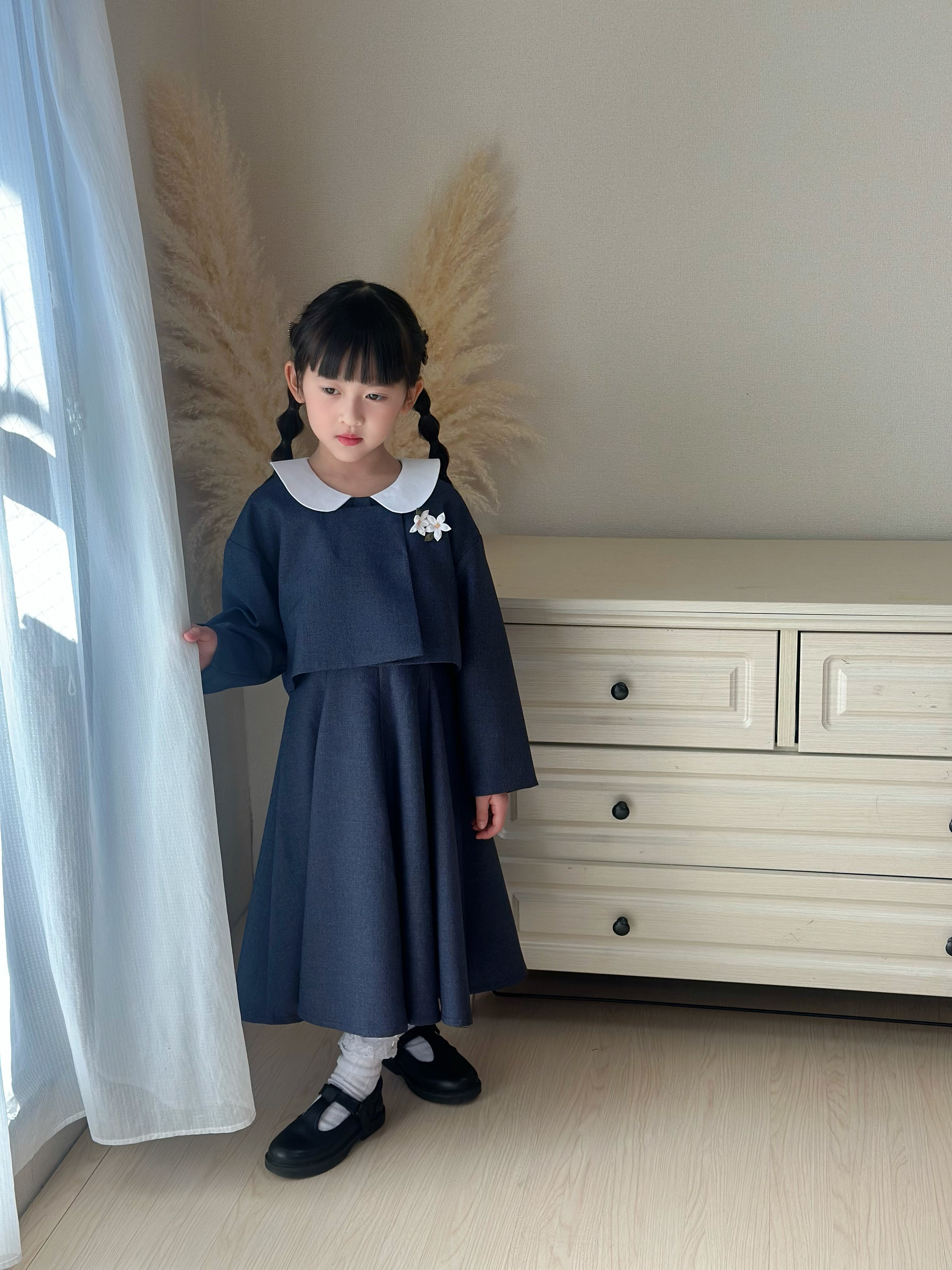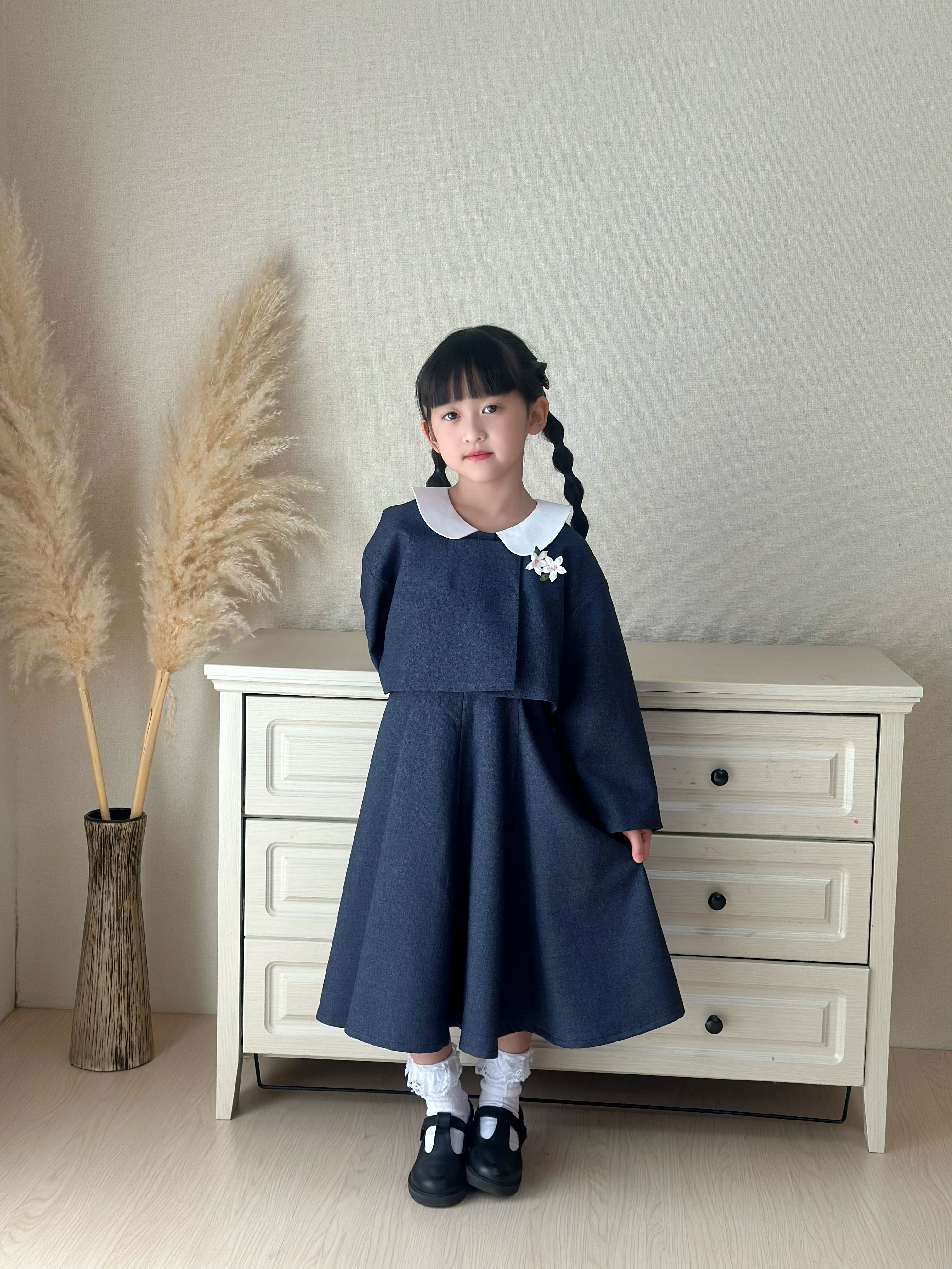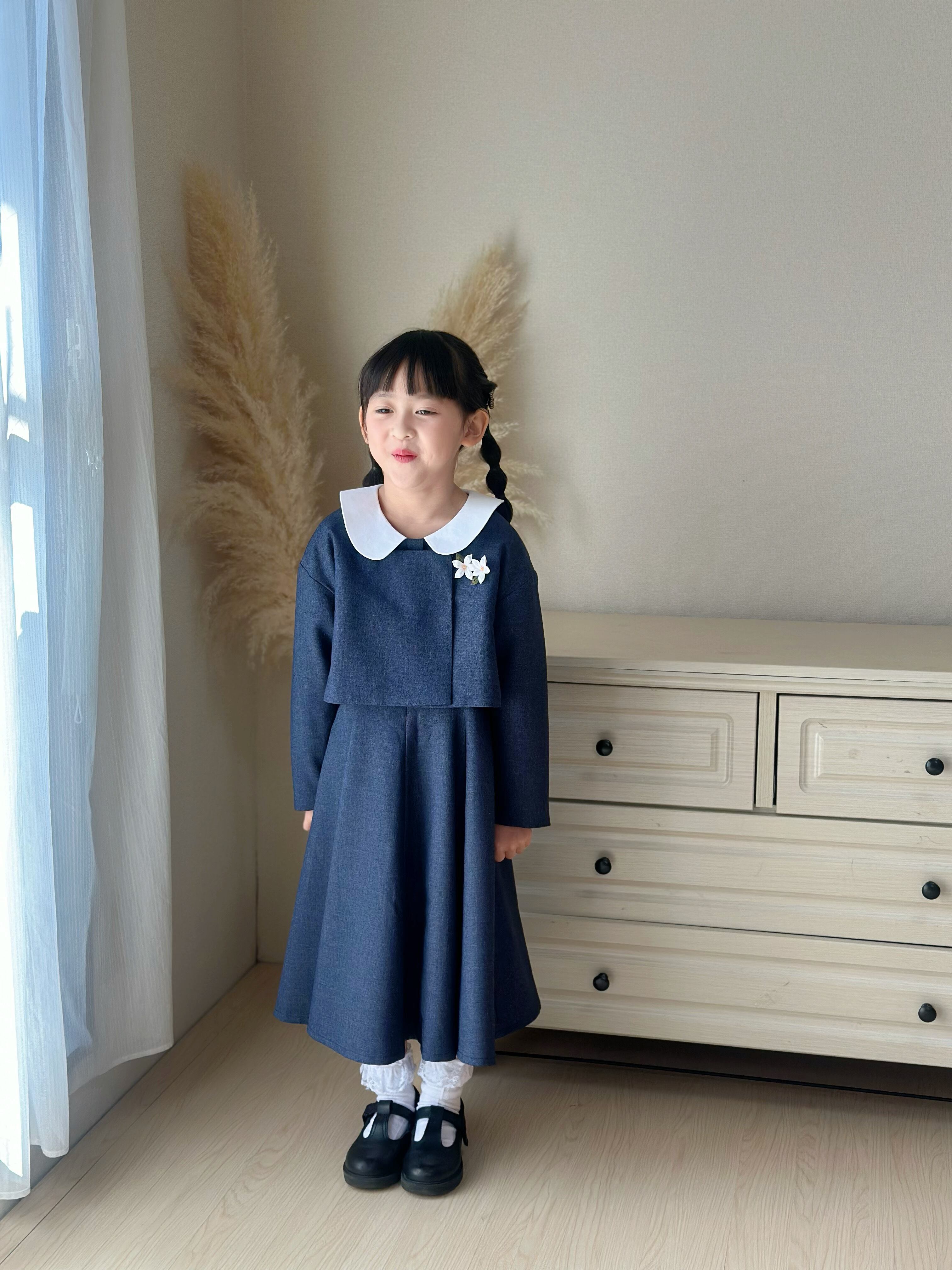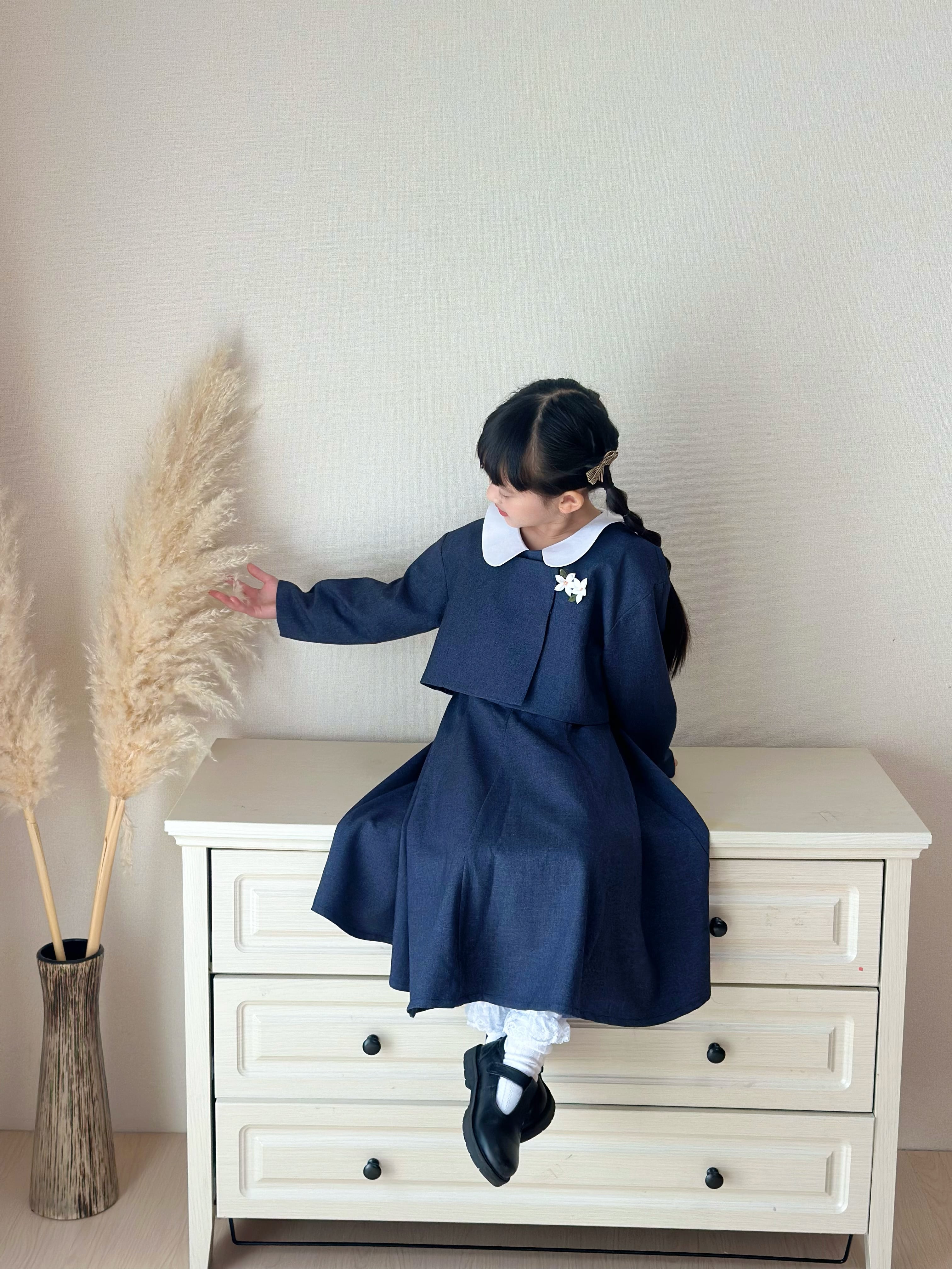 白い丸襟(セーラーカラー風)がやさしいアクセントになっています。