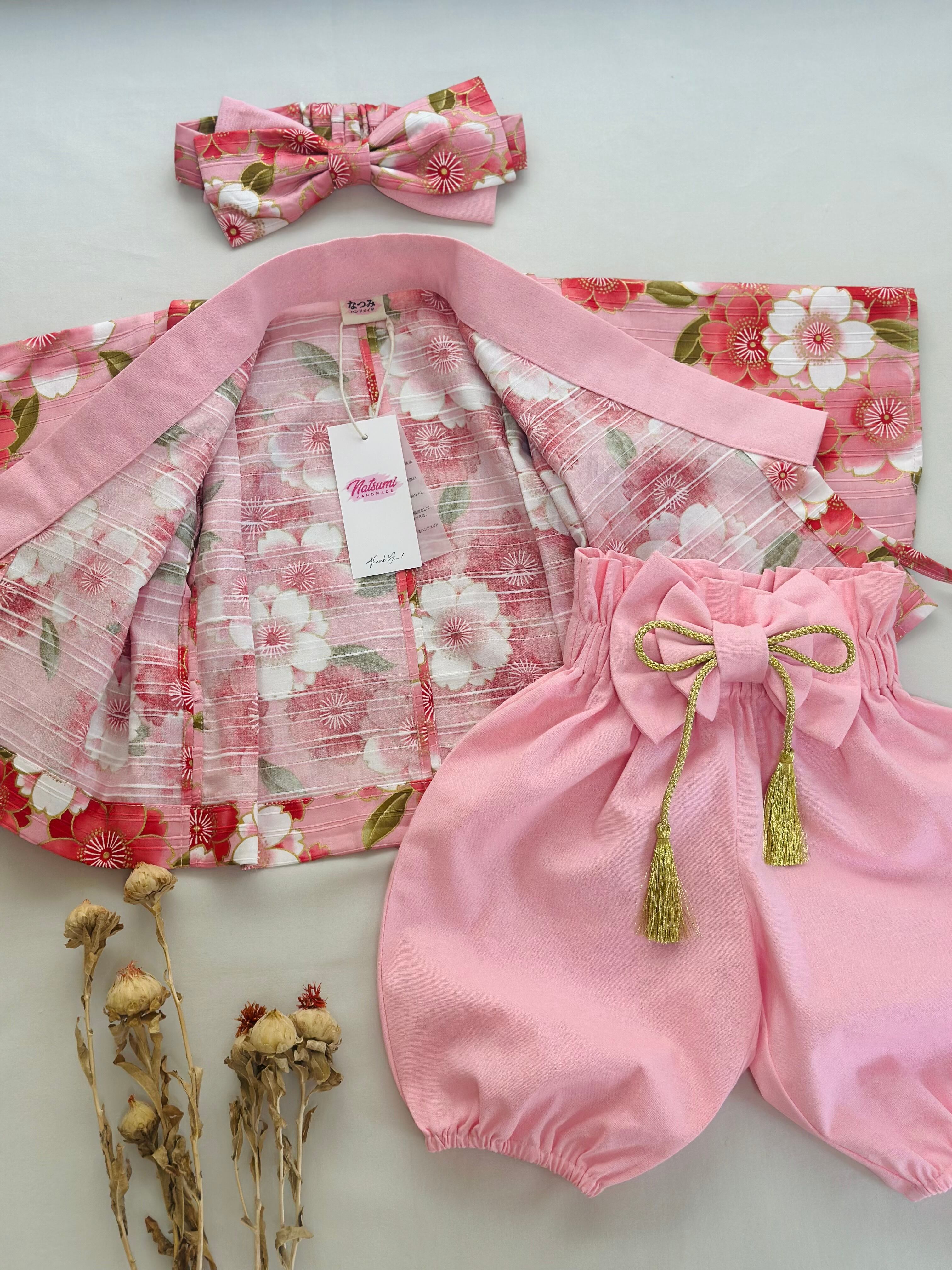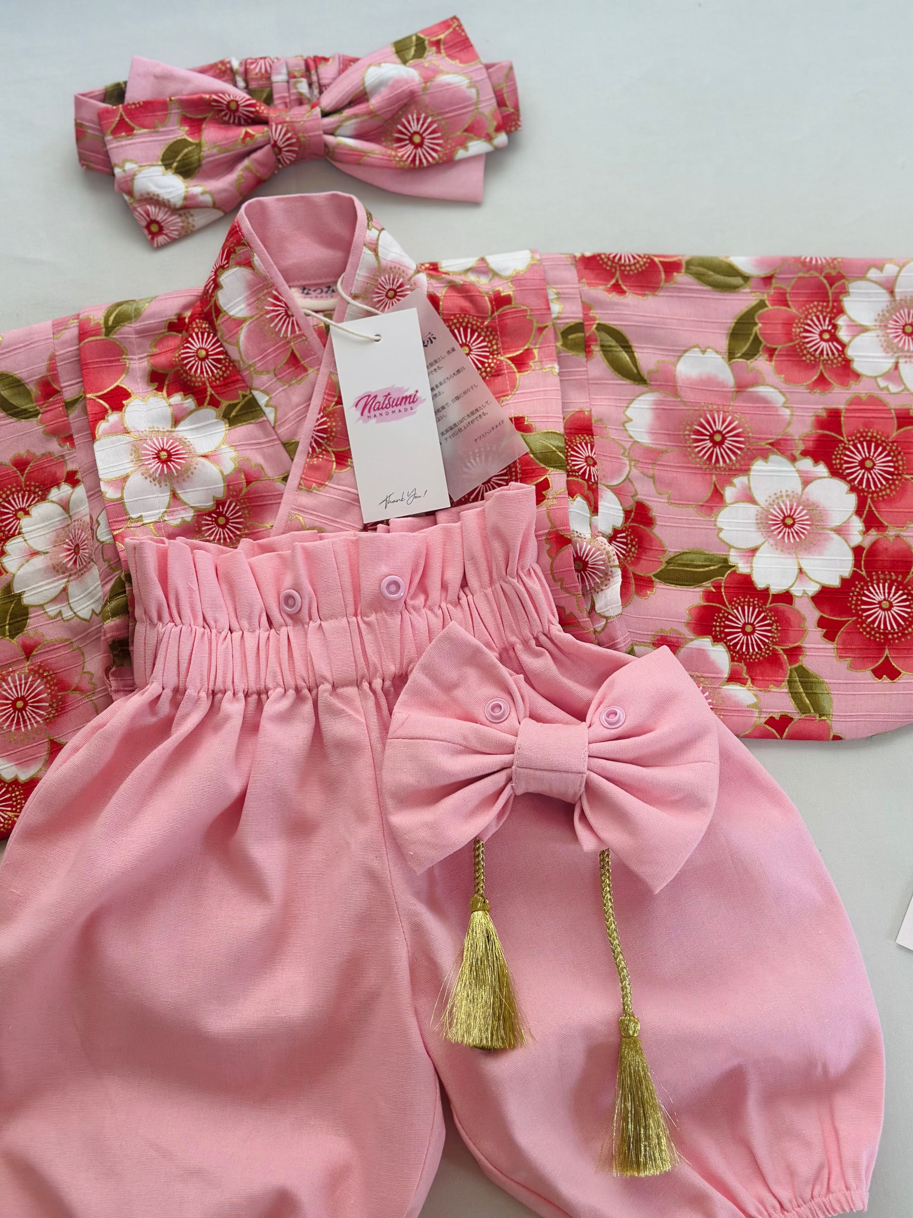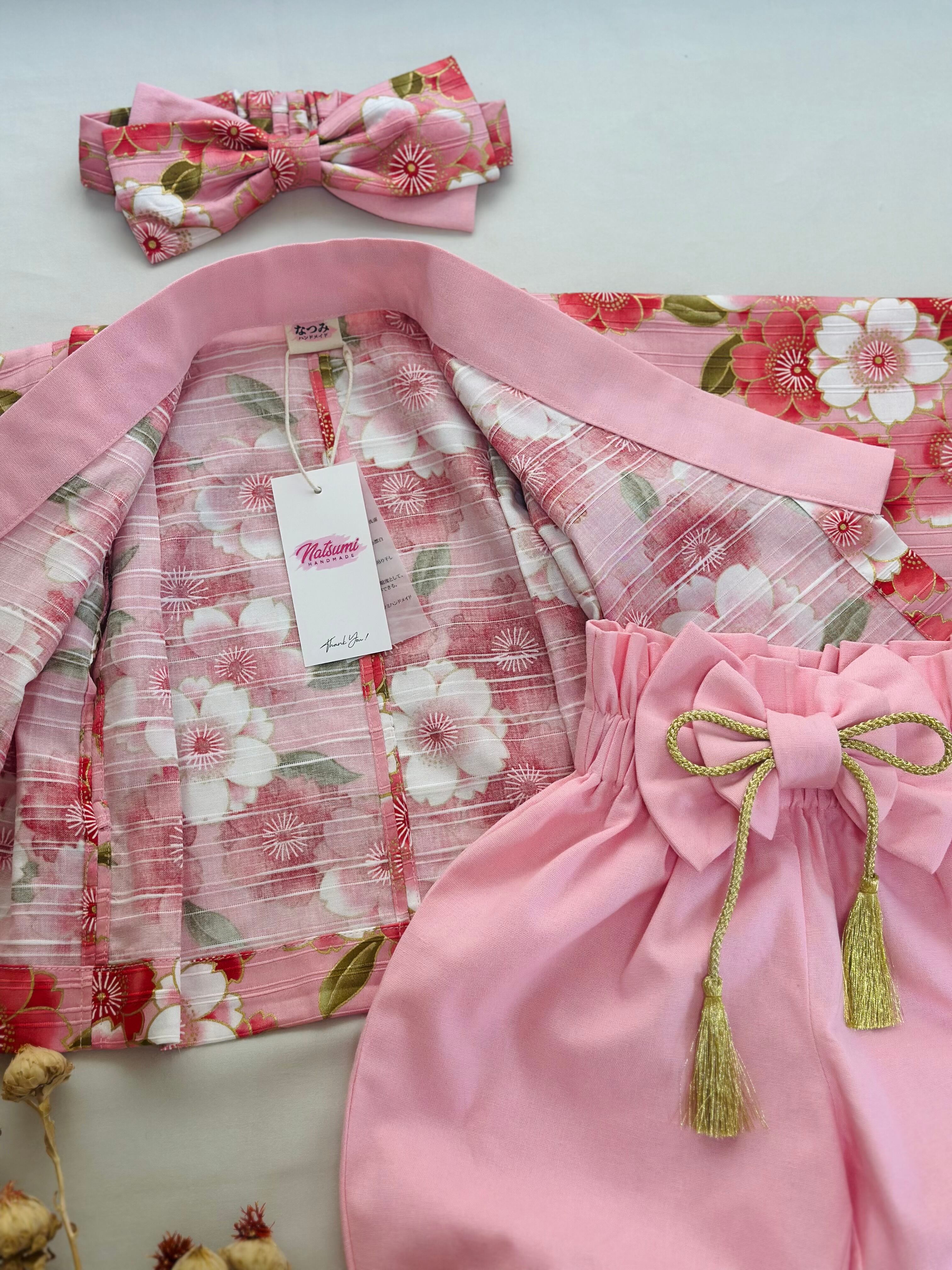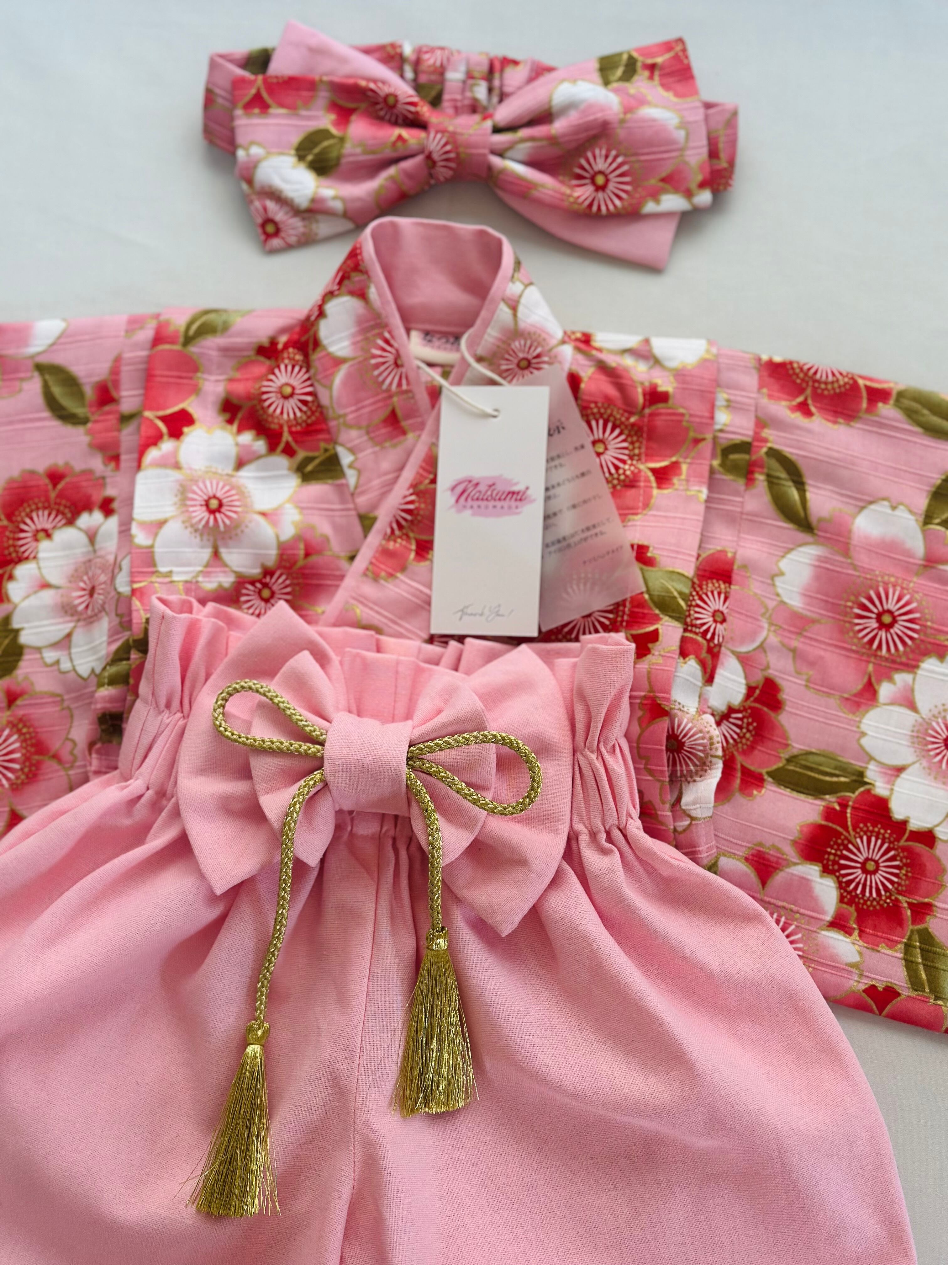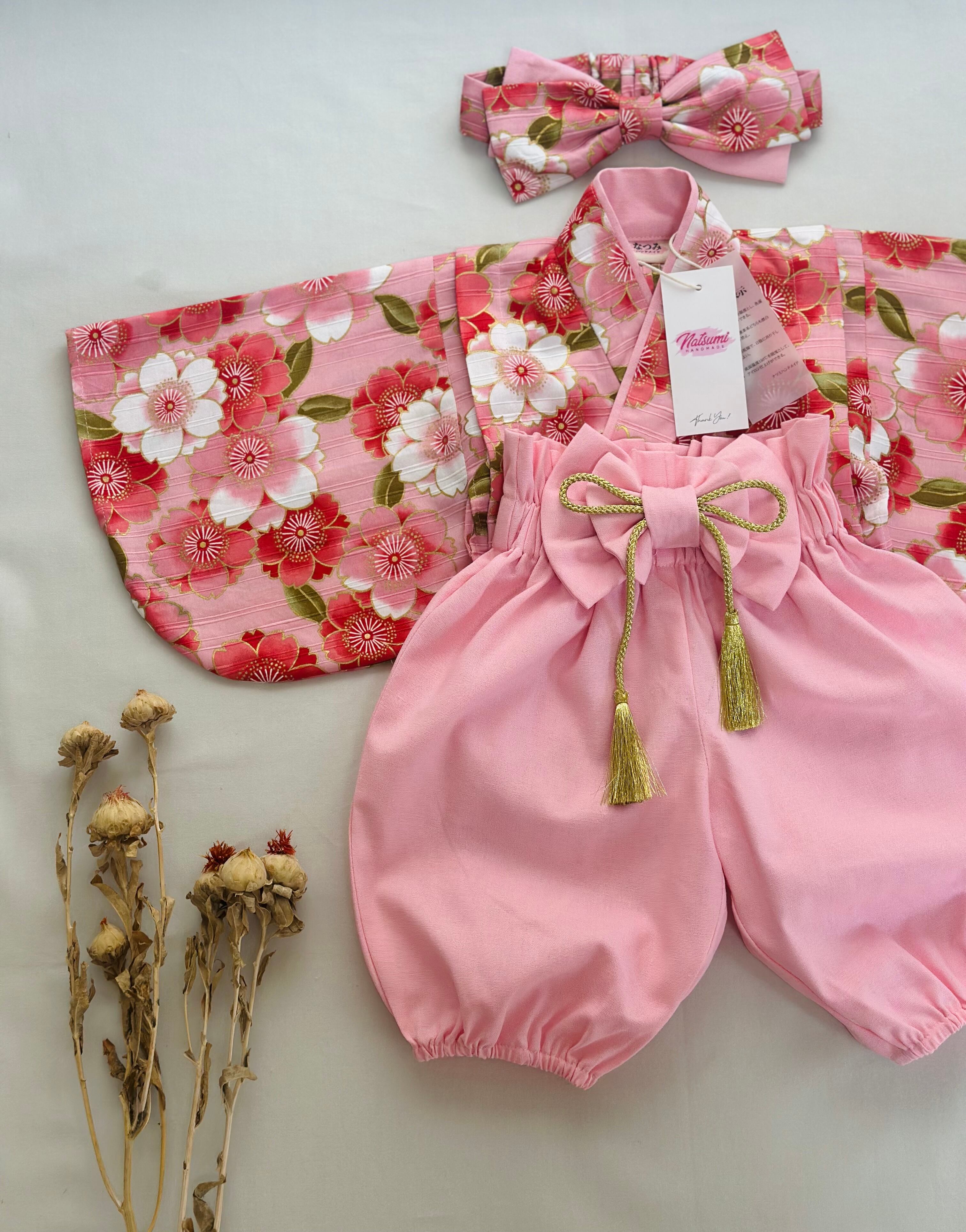 華やかなピンク系花柄とやさしいアイボリーの組み合わせが可愛いベビー袴です。