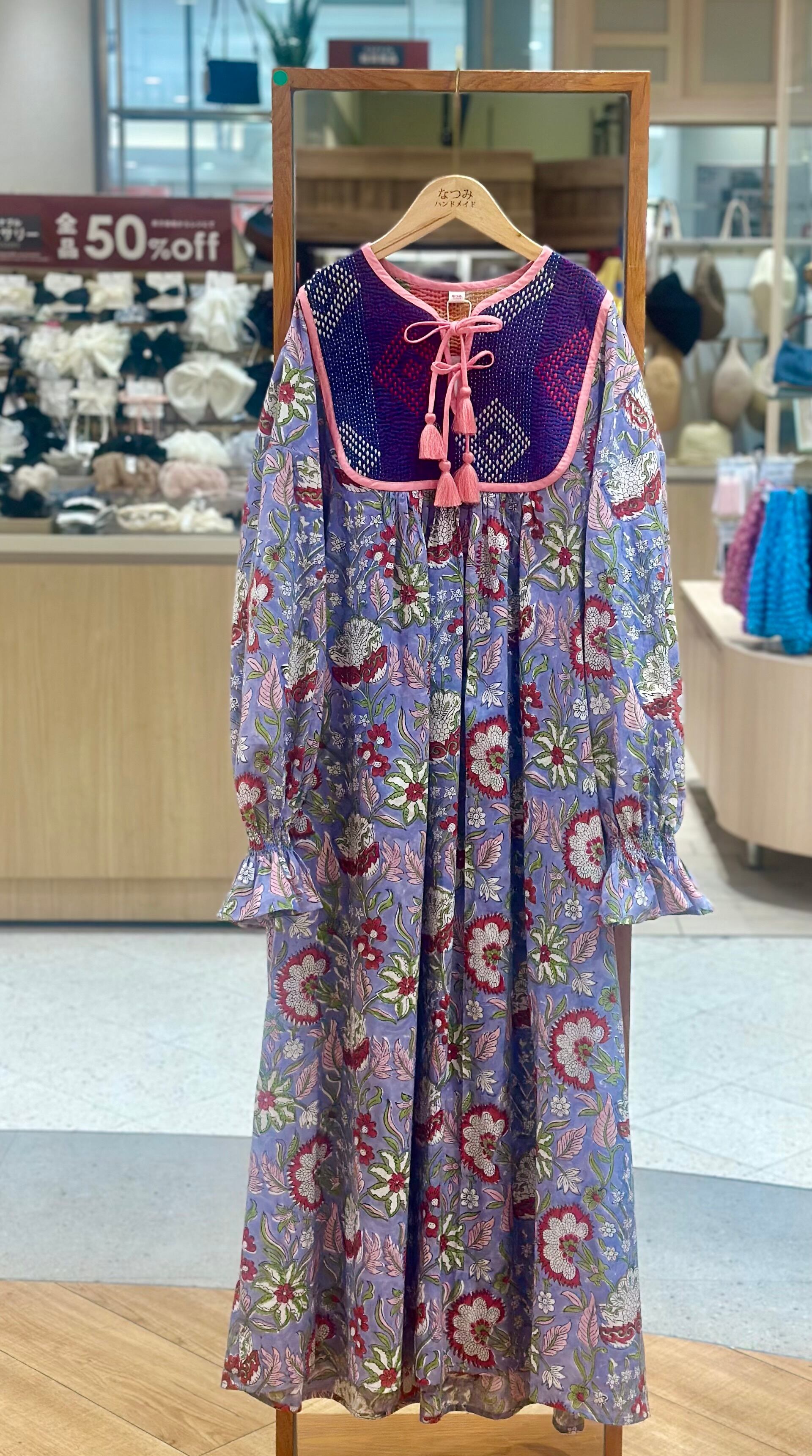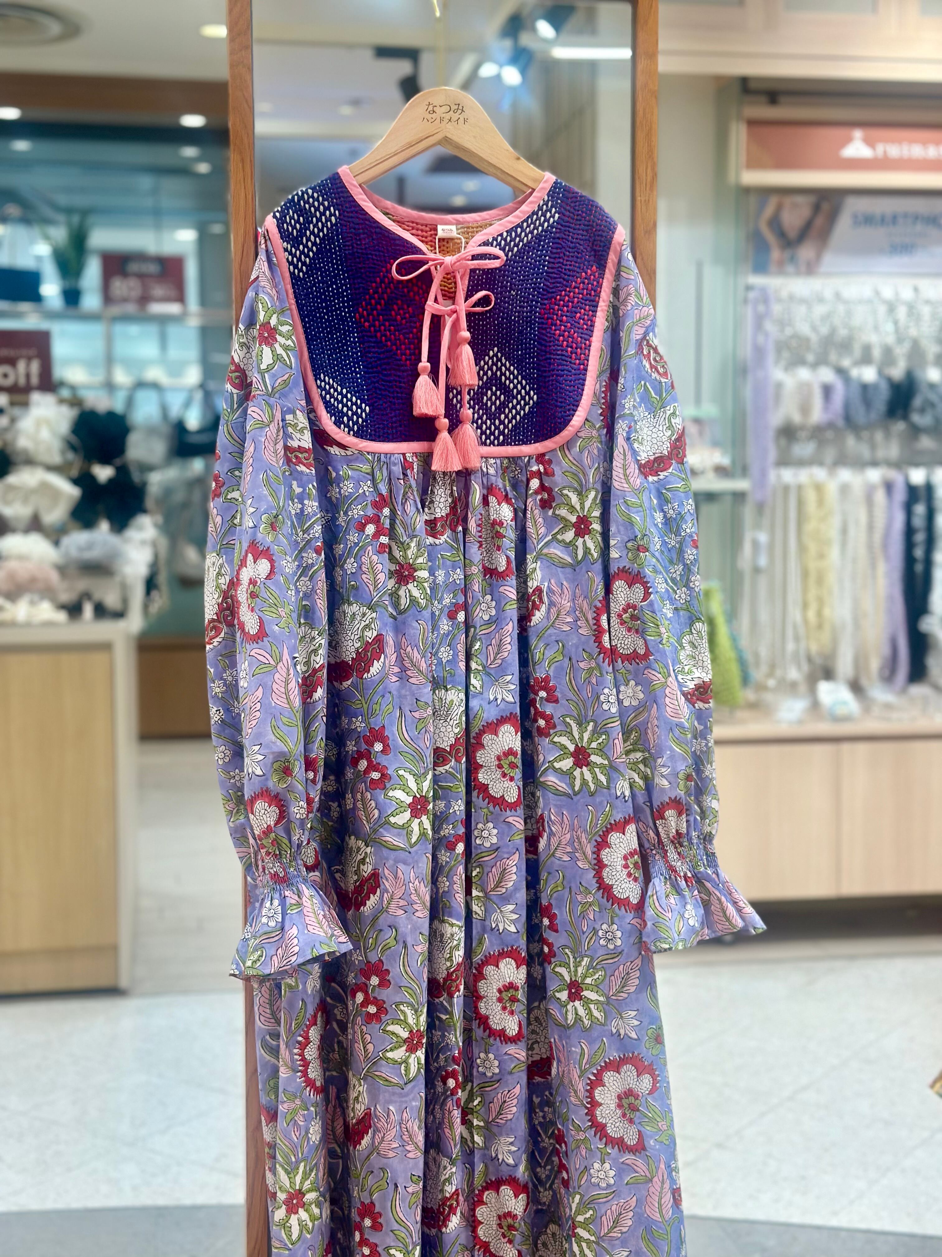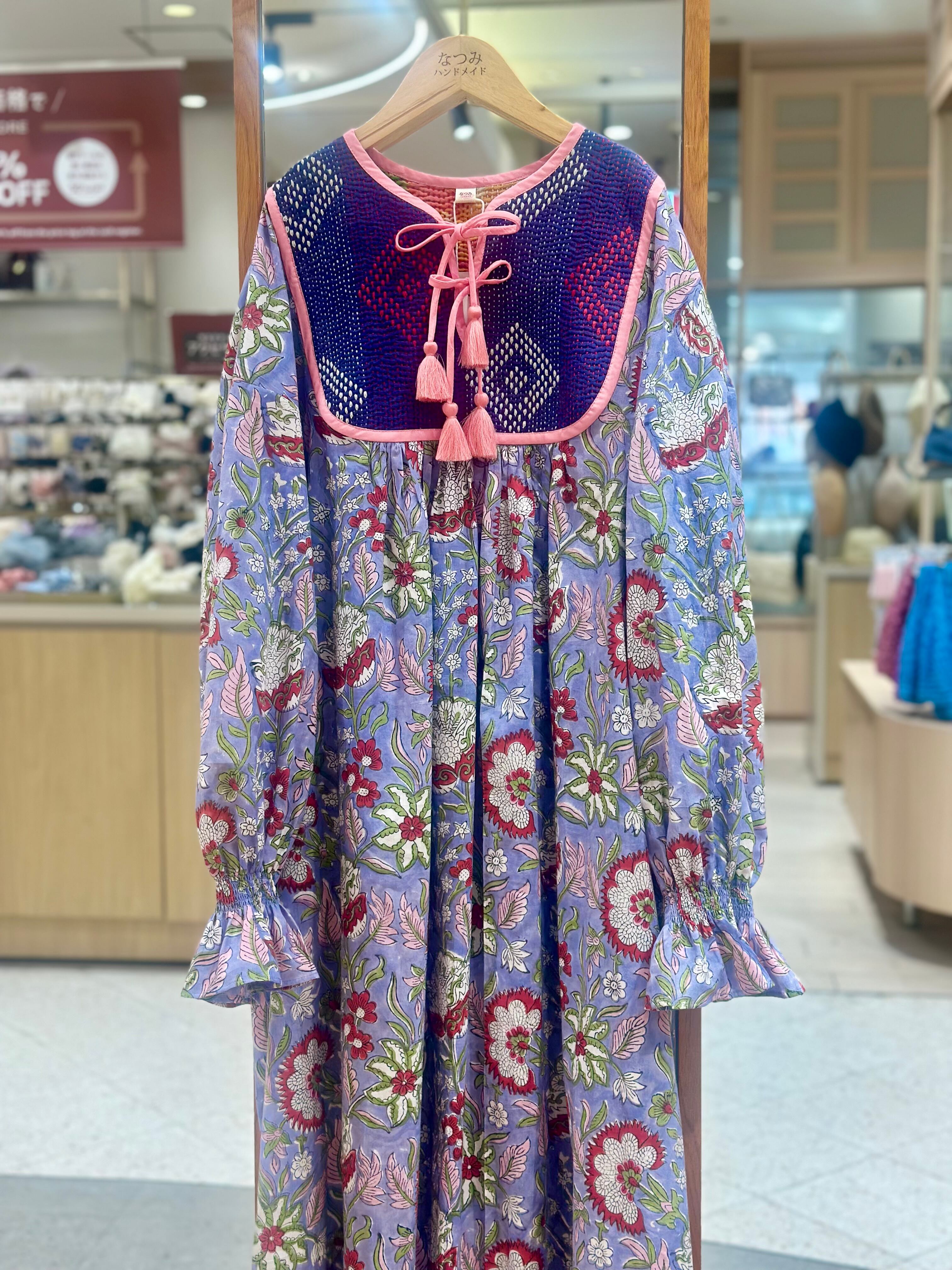 インドの手仕事カンタキルトと ブロックプリント生地を組み合わせた ナツミハンドメイドのワンピース。