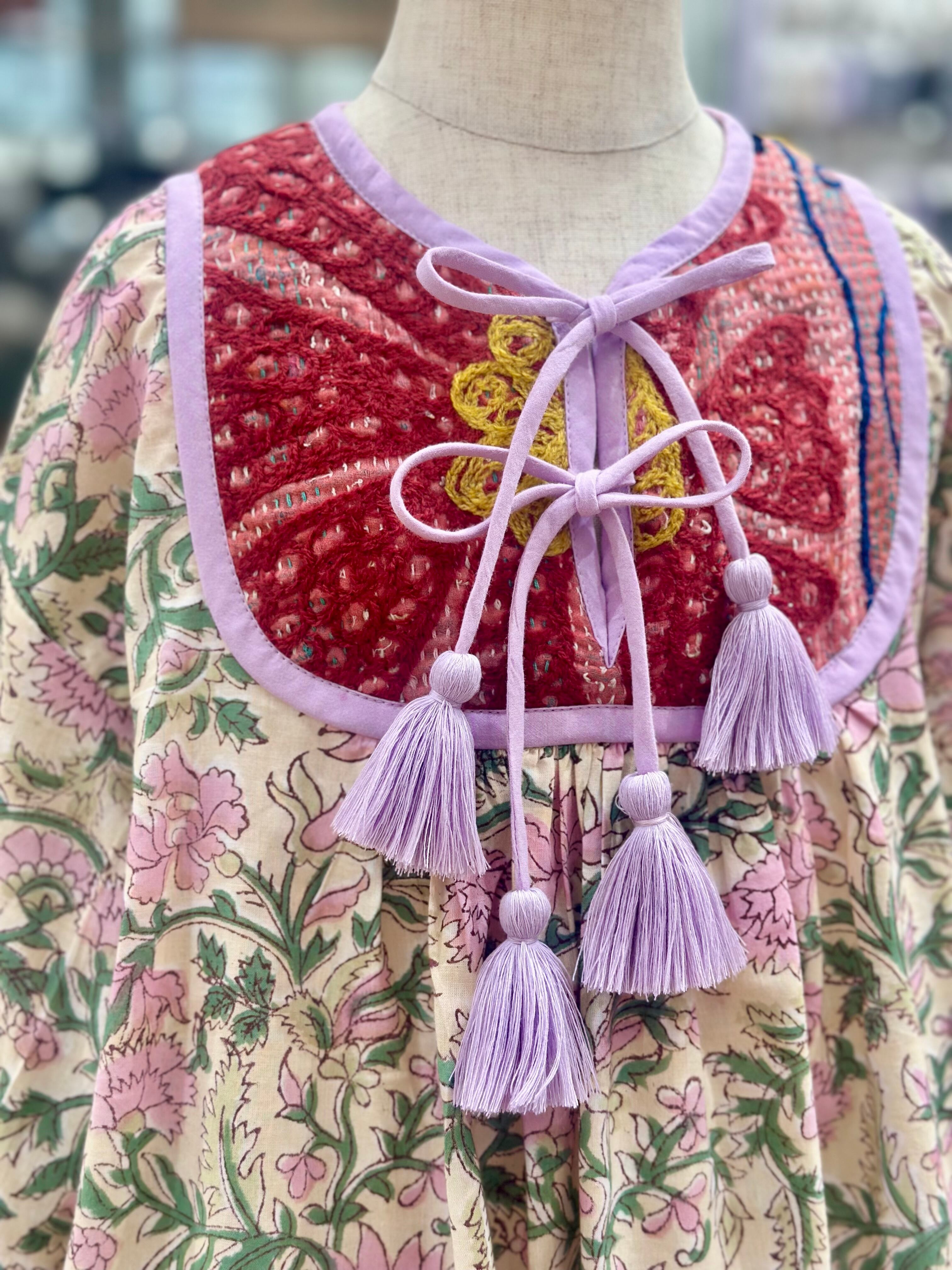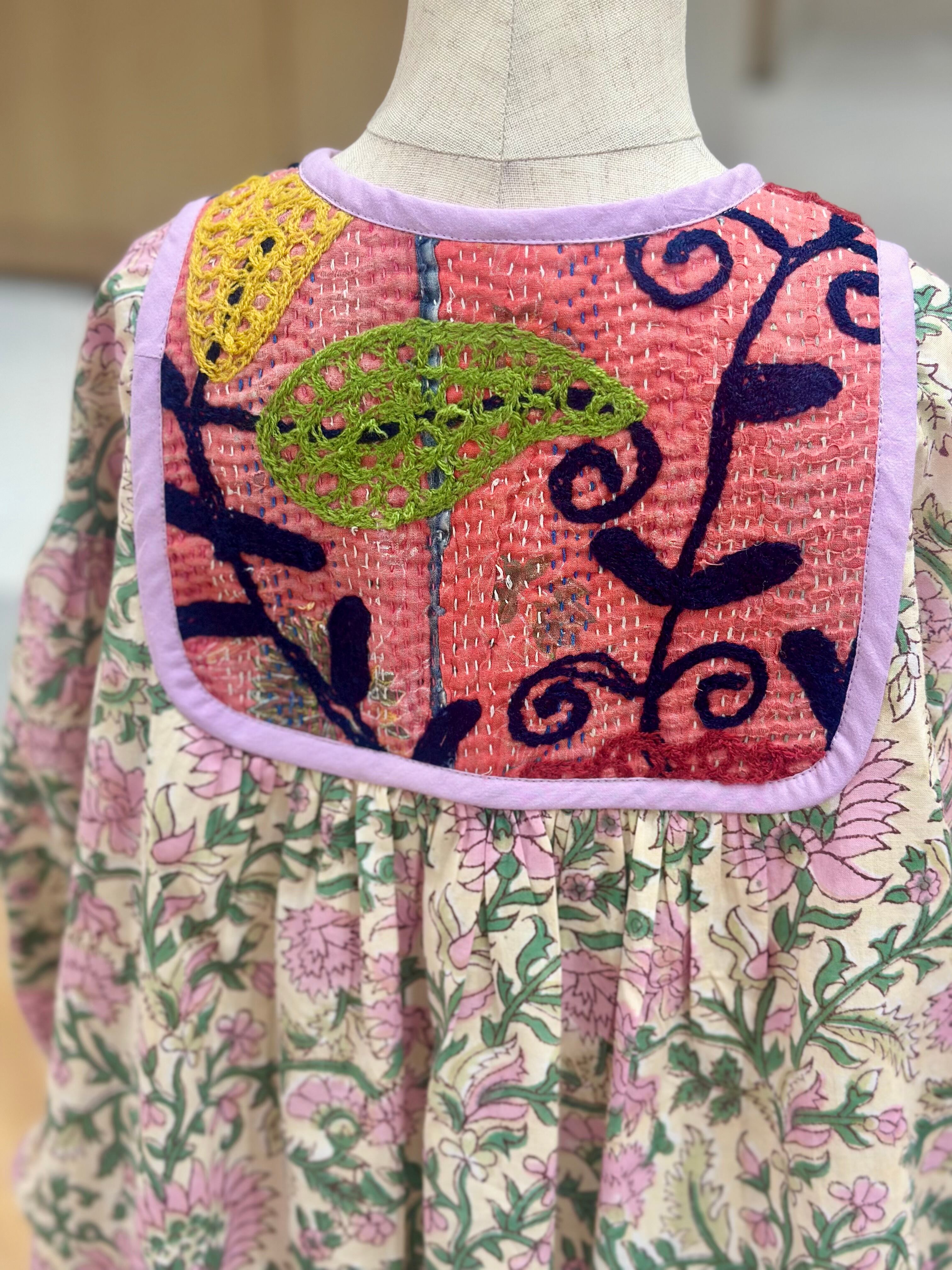インドの手仕事カンタキルトとブロックプリント生地を組み合わせたナツミハンドメイドのワンピースです。
