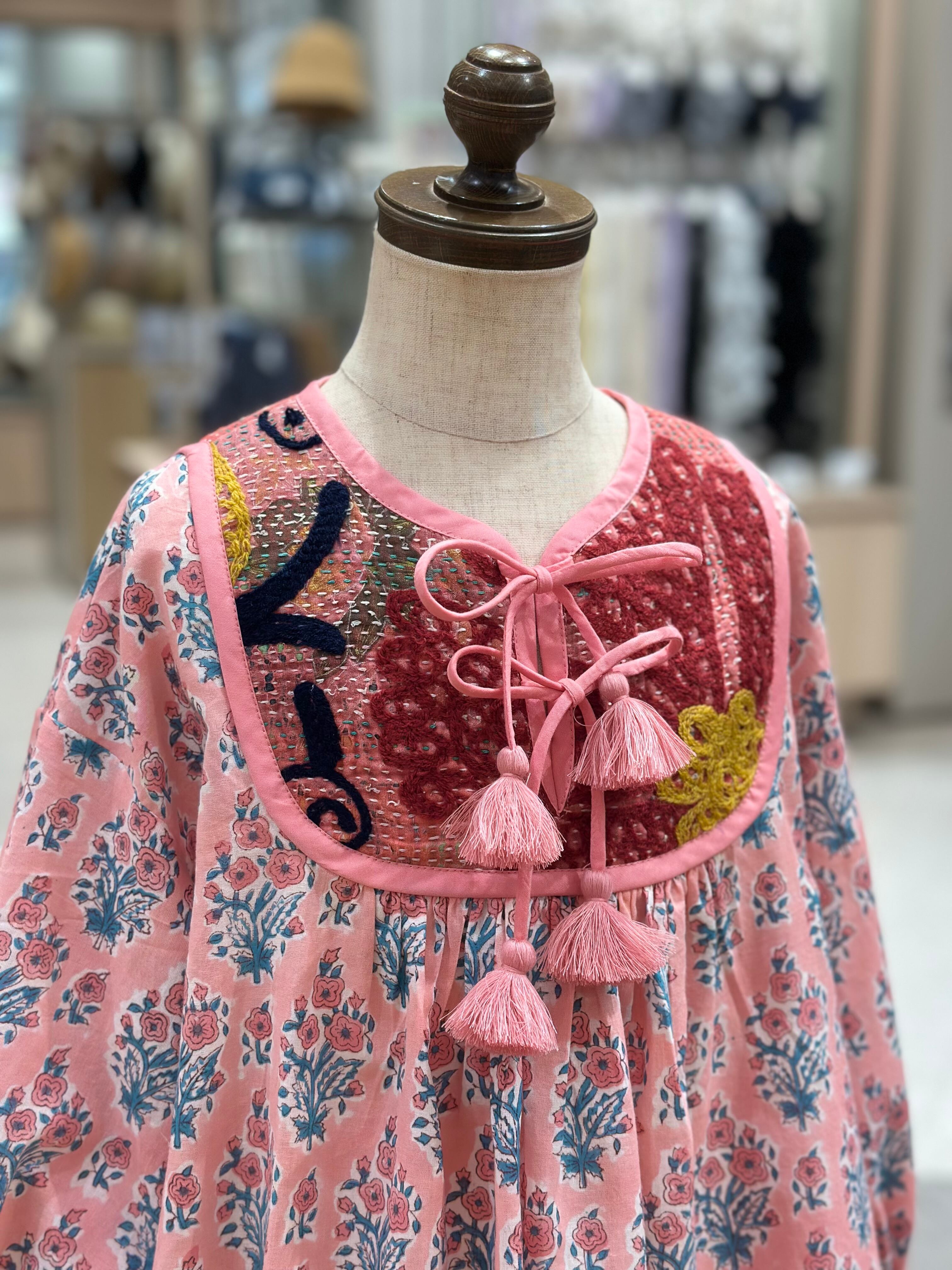 インドの手仕事カンタキルトとブロックプリント生地を組み合わせたナツミハンドメイドのワンピースです。