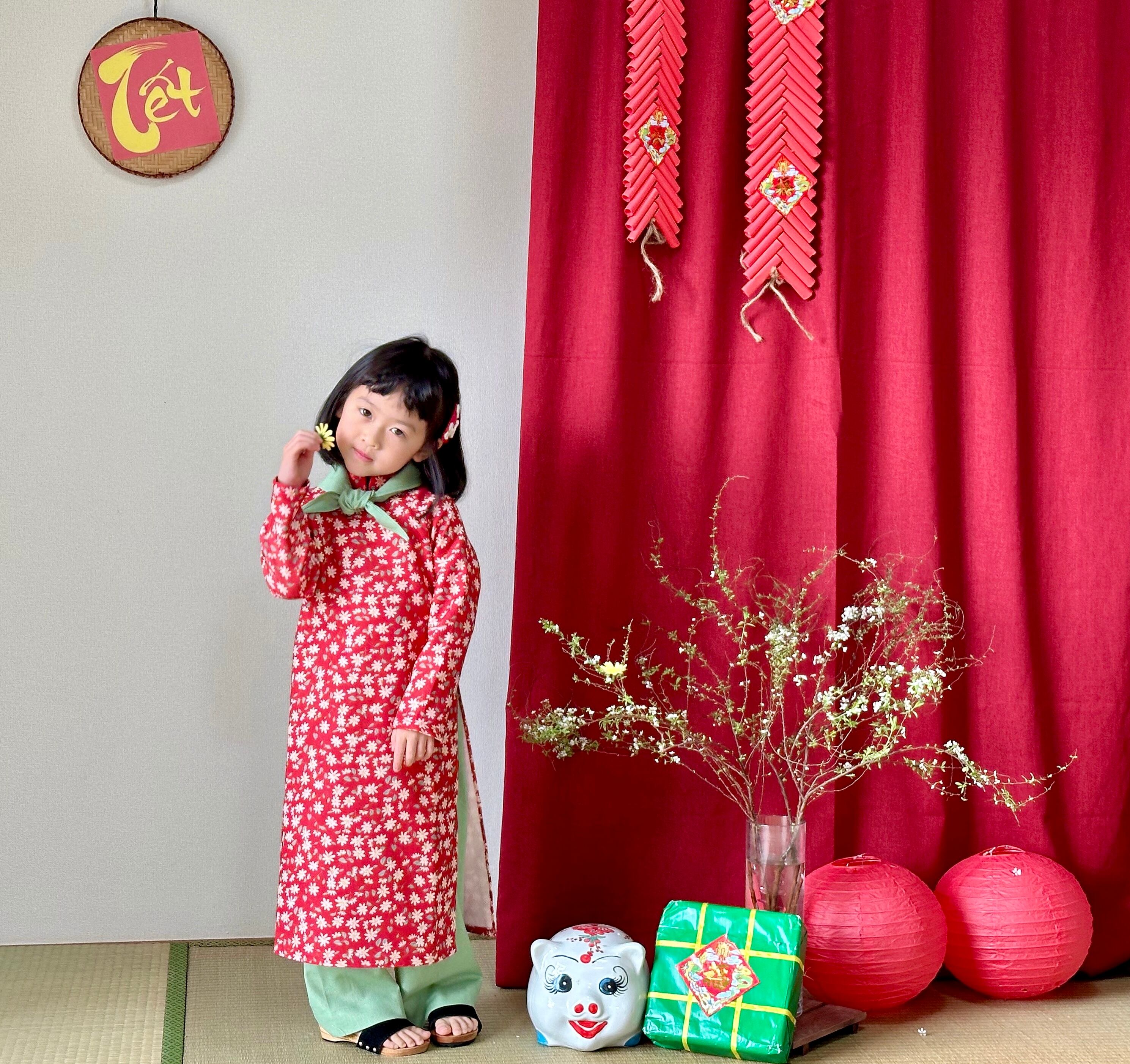 子供用のアオザイは、ワンピースみたいに普段着でもご利用出来ます様、可愛い仕上がりにデザインさせていただきました
