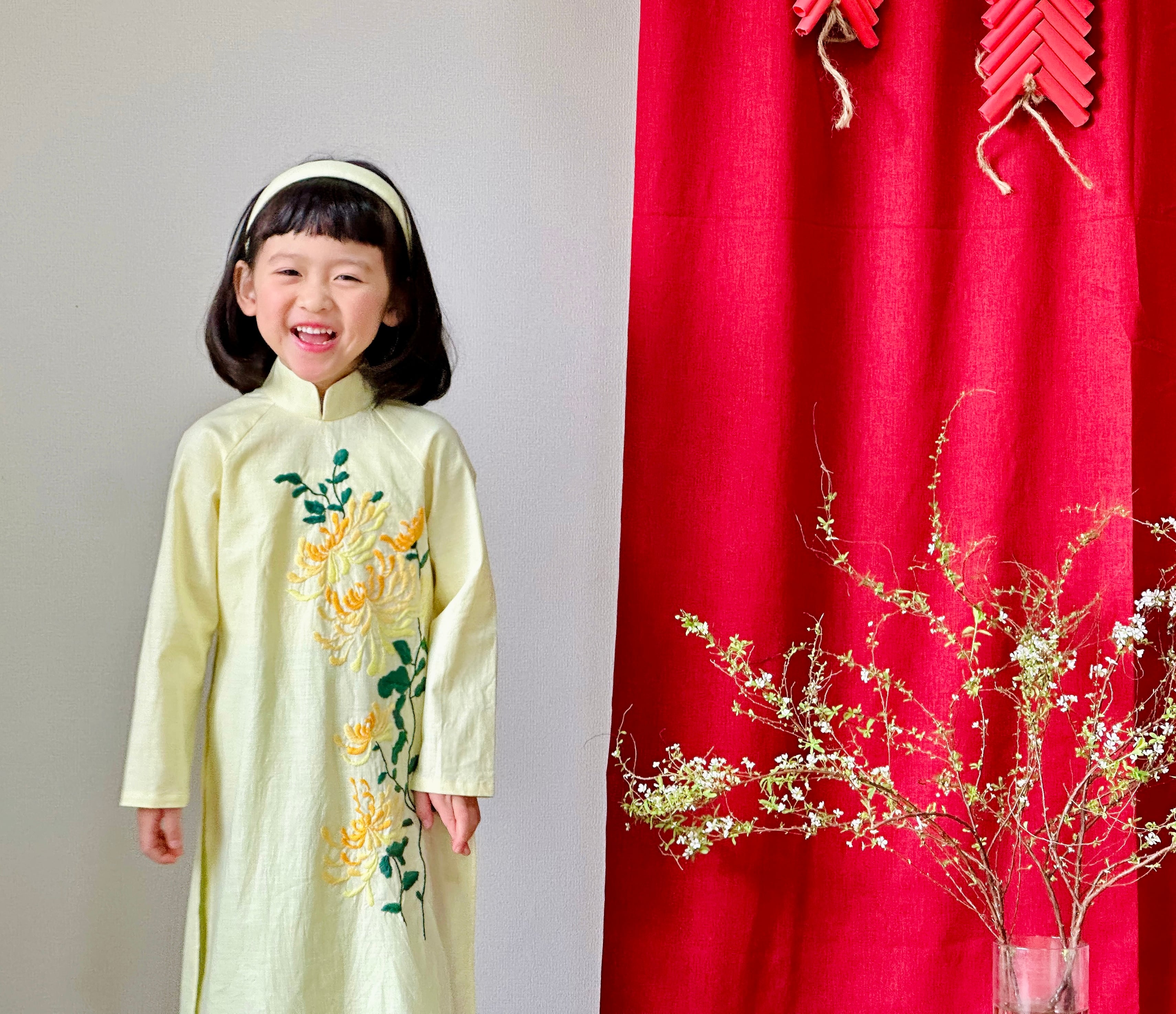 子供用のアオザイは、ワンピースみたいに普段着でもご利用出来ます様、可愛い仕上がりにデザインさせていただきました