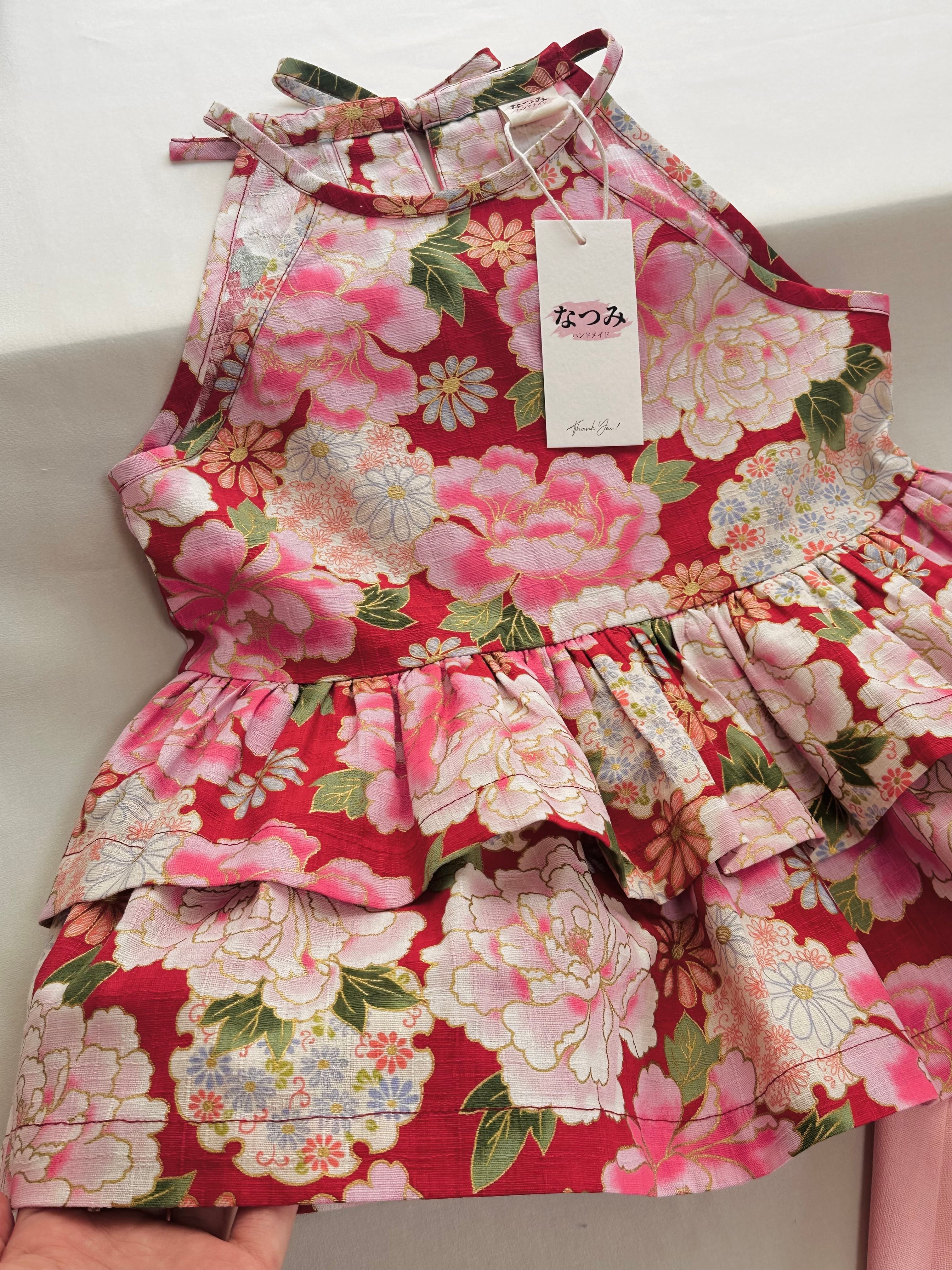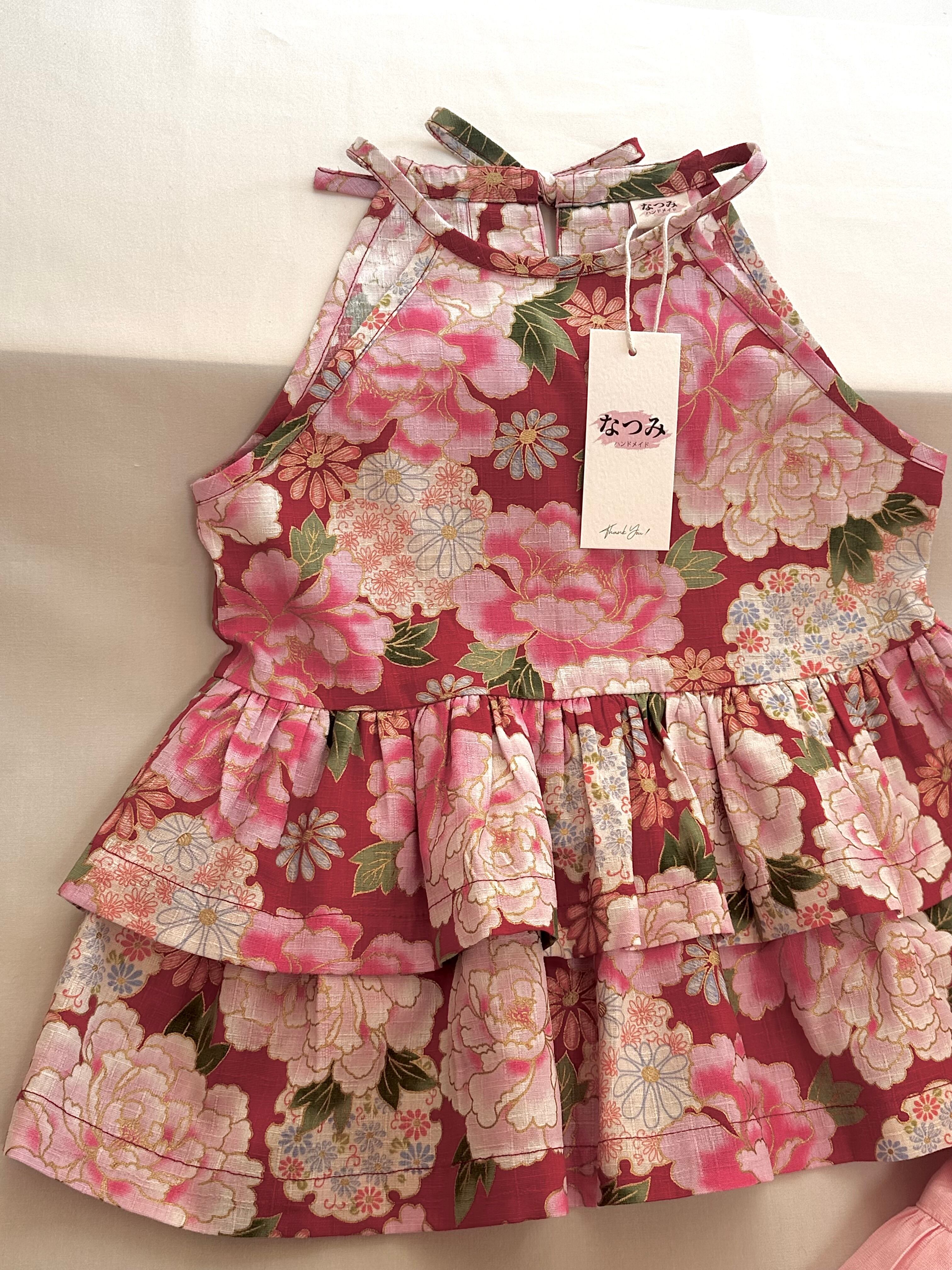 ホルターネックの生地はスラブドビーです。縦横にスラブが入った変わり織り。 シーチングやブロードと同じ平織りの生地ですが少し厚めです。金彩の牡丹柄と雪輪柄です。